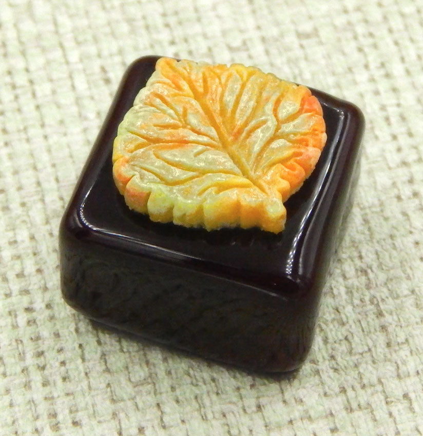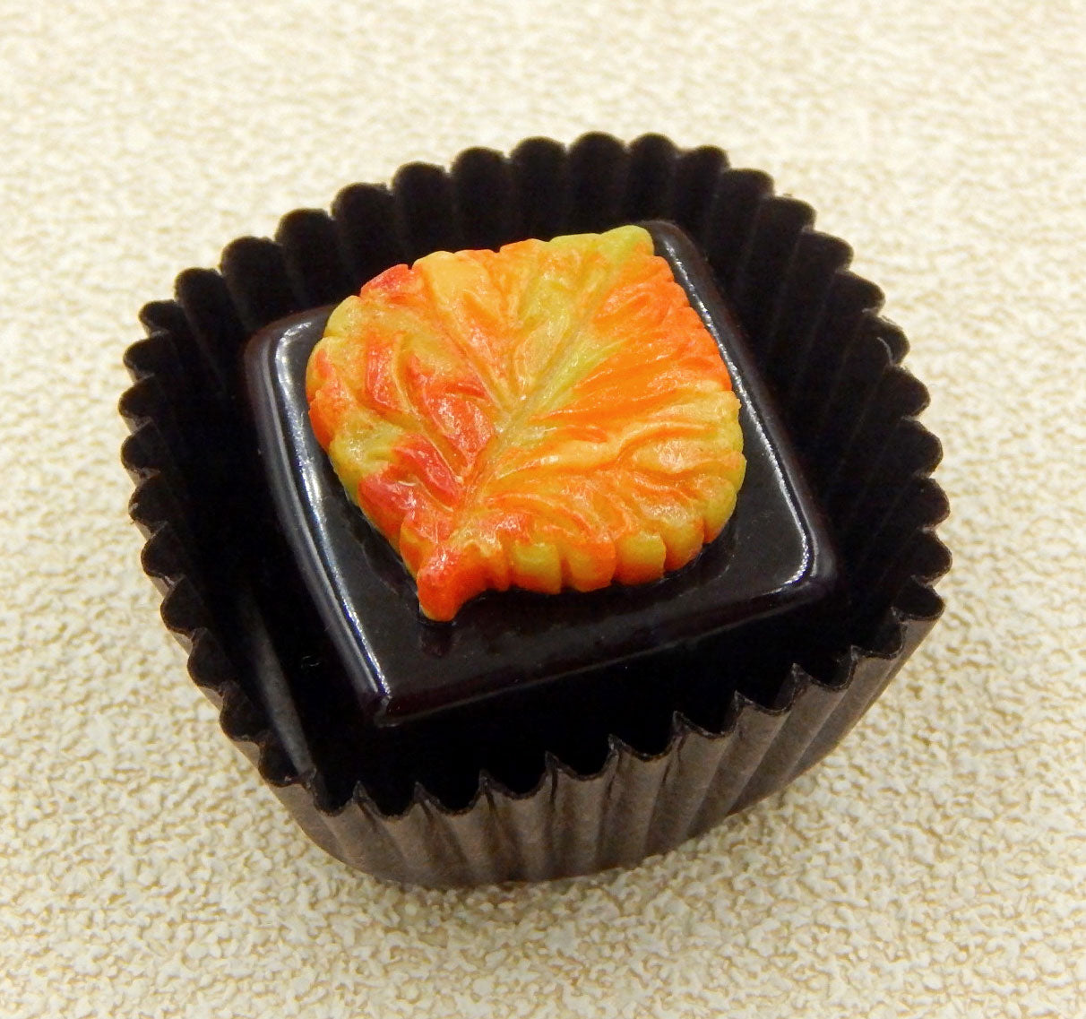A handmade collectible solid glass chocolate with an autumn aspen leaf on top created from colorful glass utilizing ancient pate de verre and lampworking techniques. Meticulous attention to detail has gone into the construction of each of our pieces to enhance its appeal and collectibility.