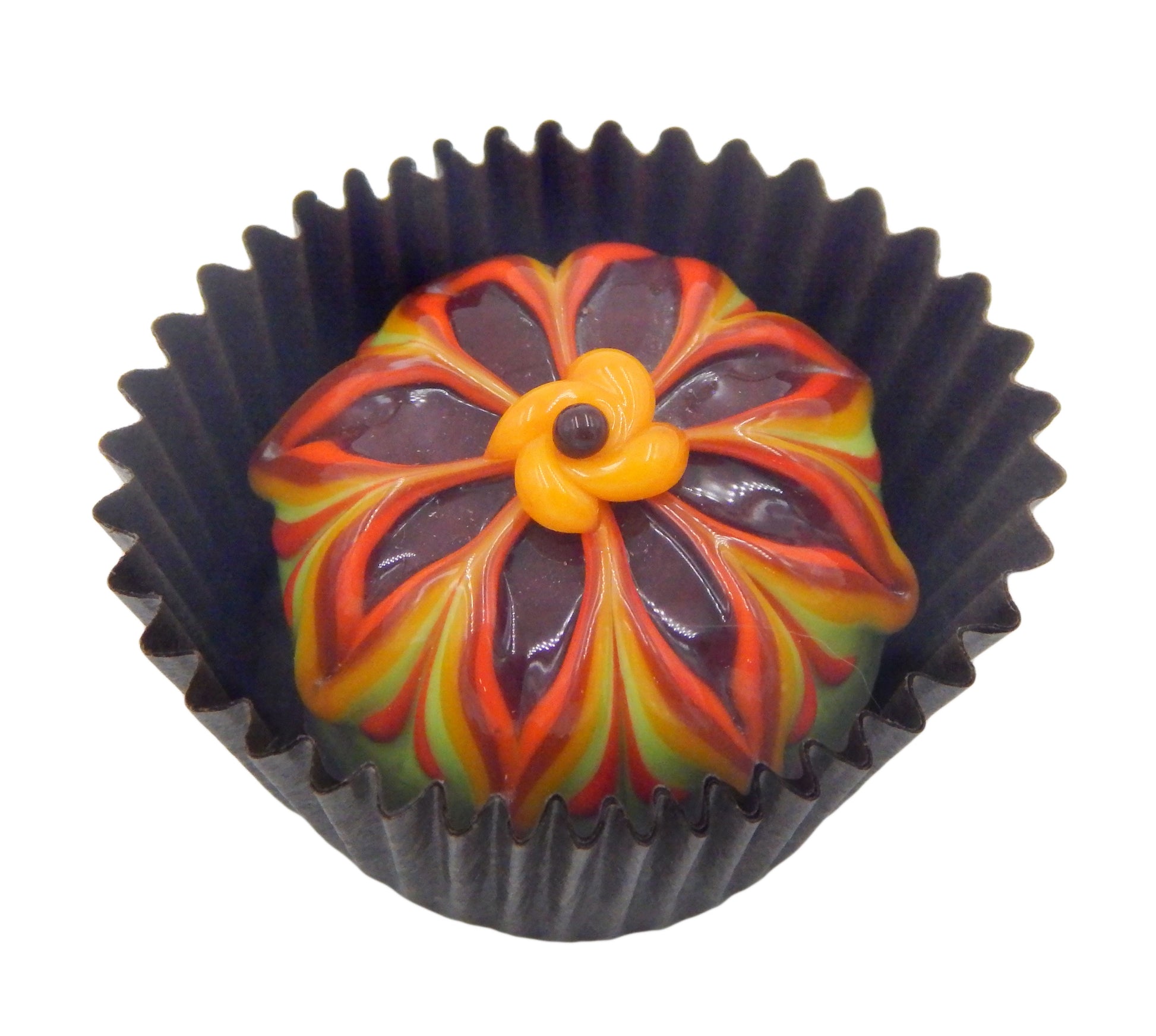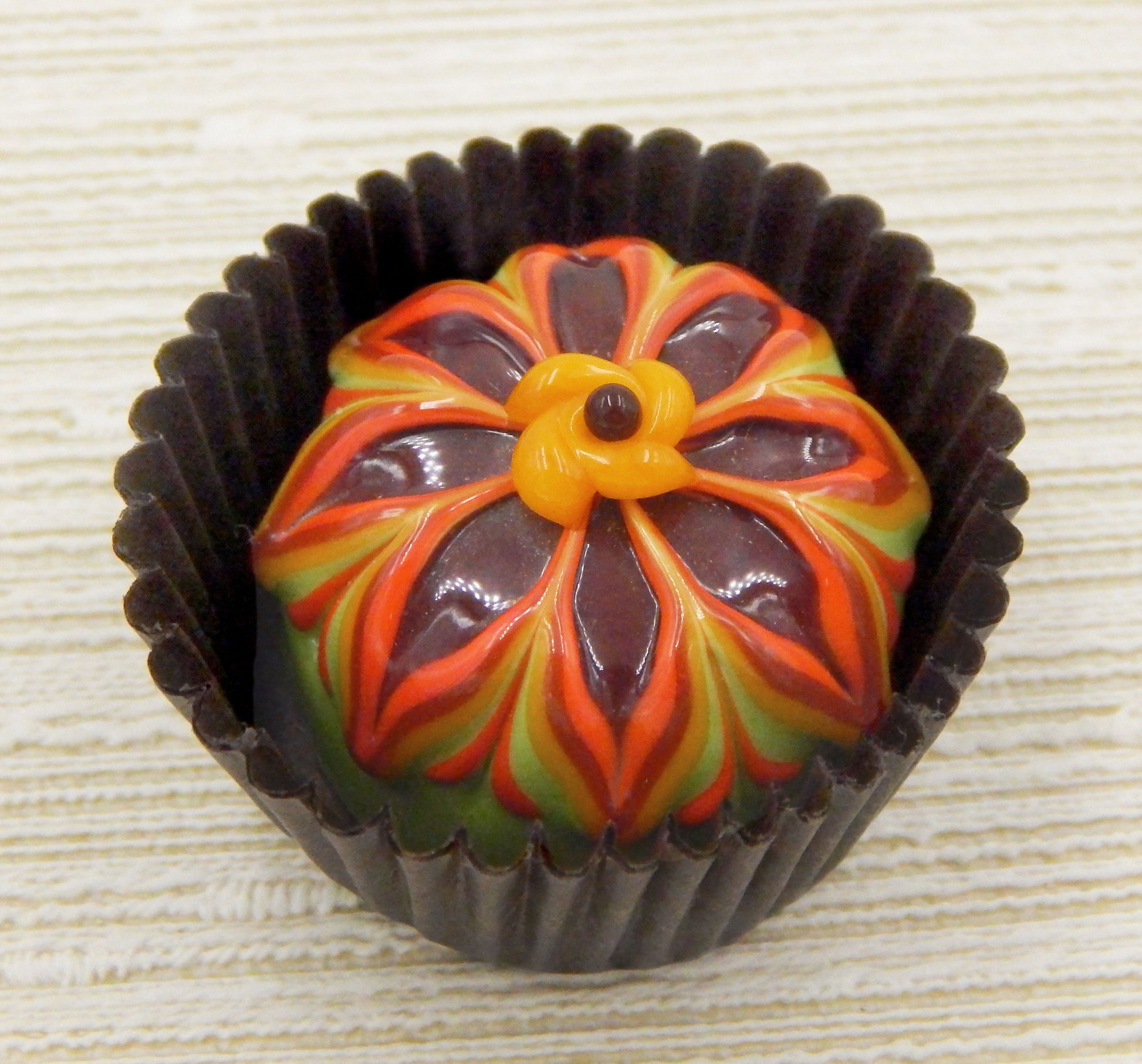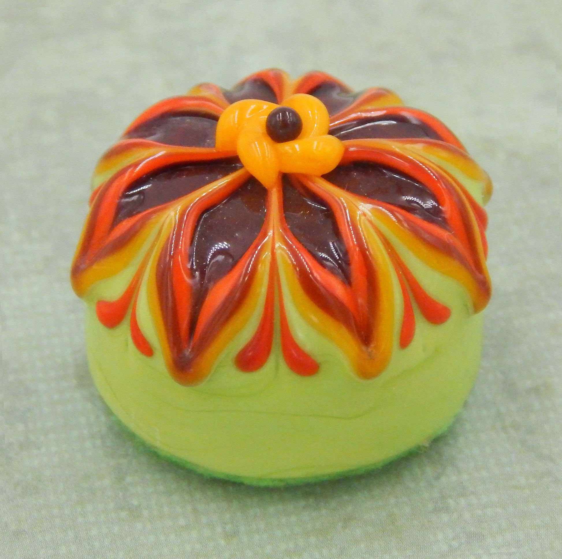 A handmade collectible solid glass pistachio treat with a floral aster design of orange & dark chocolate created from colorful glass utilizing flameworking techniques. Meticulous attention to detail has gone into the construction of each of our pieces to enhance its appeal and collectibility.