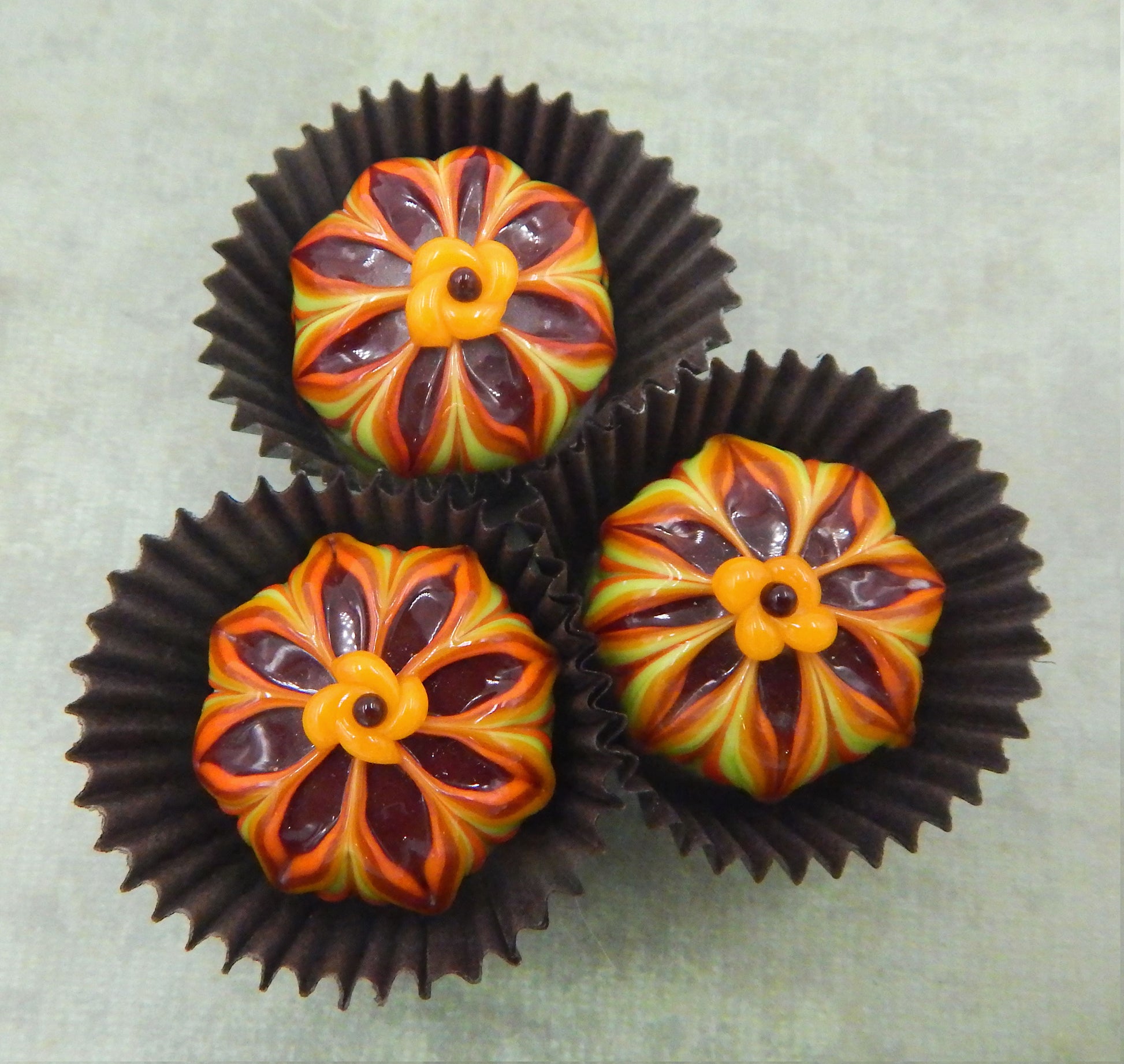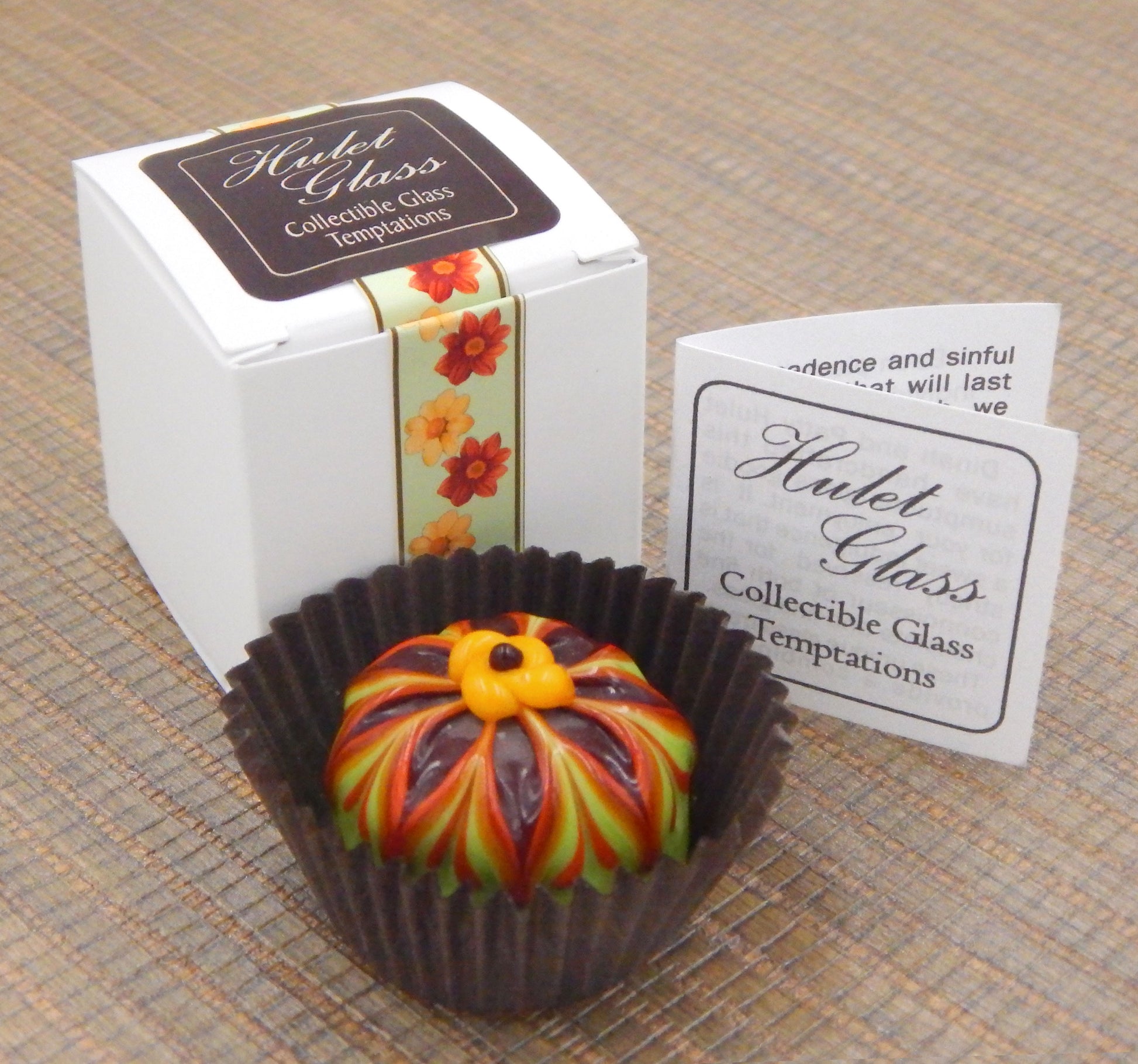 The glass chocolate measures approximately 1.25" x 1" (slightly larger than an actual chocolate candy) and sits in a fluted glassine paper candy cup. The bottom of the chocolate is covered in felt to protect the surface it will sit upon. Each beautiful glass chocolate is signed (Hulet), dated and comes to you in a colorful gift box with an enclosure card telling a bit about the piece.