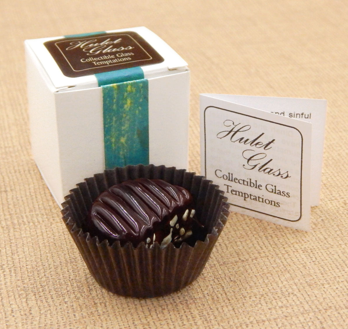 The glass chocolate measures 1.25" x .75" (slightly larger than an actual chocolate candy) and sits in a fluted glassine paper candy cup. The bottom of the chocolate is covered in felt to protect the surface it will sit upon. Each beautiful glass chocolate is signed (Hulet), dated and comes to you in a colorful gift box with an enclosure card telling a bit about the piece.