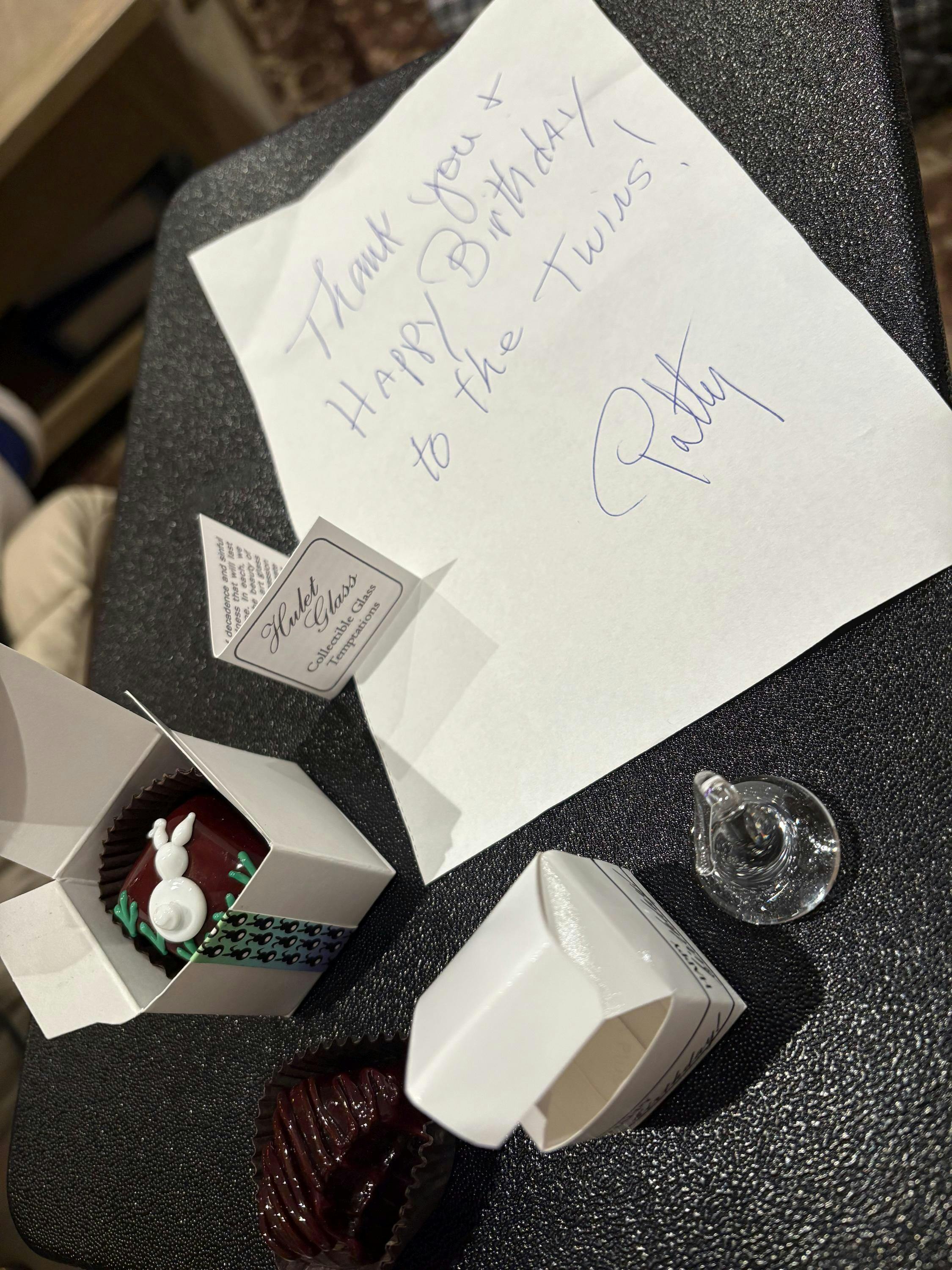 The glass chocolate measures 1.75" x 1.25" x 1" (slightly larger than an actual chocolate candy) and sits in a fluted glassine paper candy cup. The bottom of the chocolate is covered in felt to protect the surface it will sit upon. Each beautiful glass chocolate is signed (Hulet), dated and comes to you in a colorful gift box with an enclosure card telling a bit about the piece.