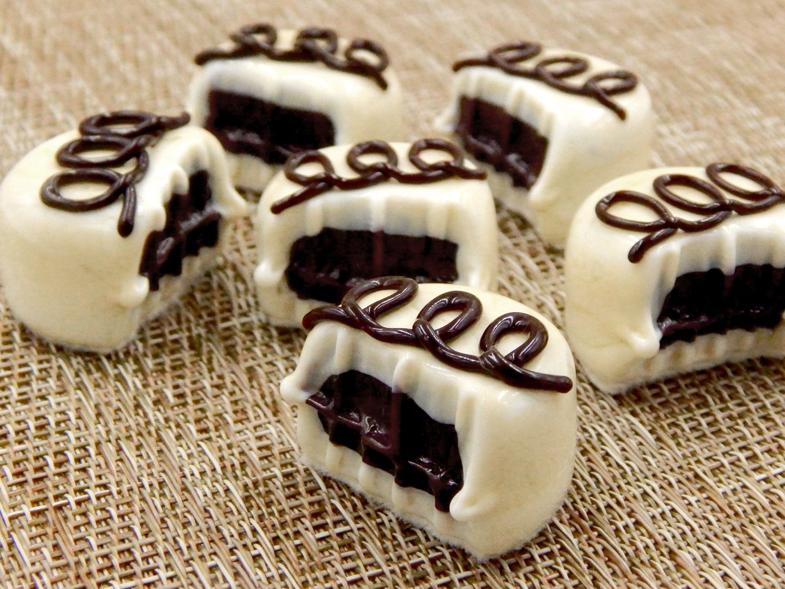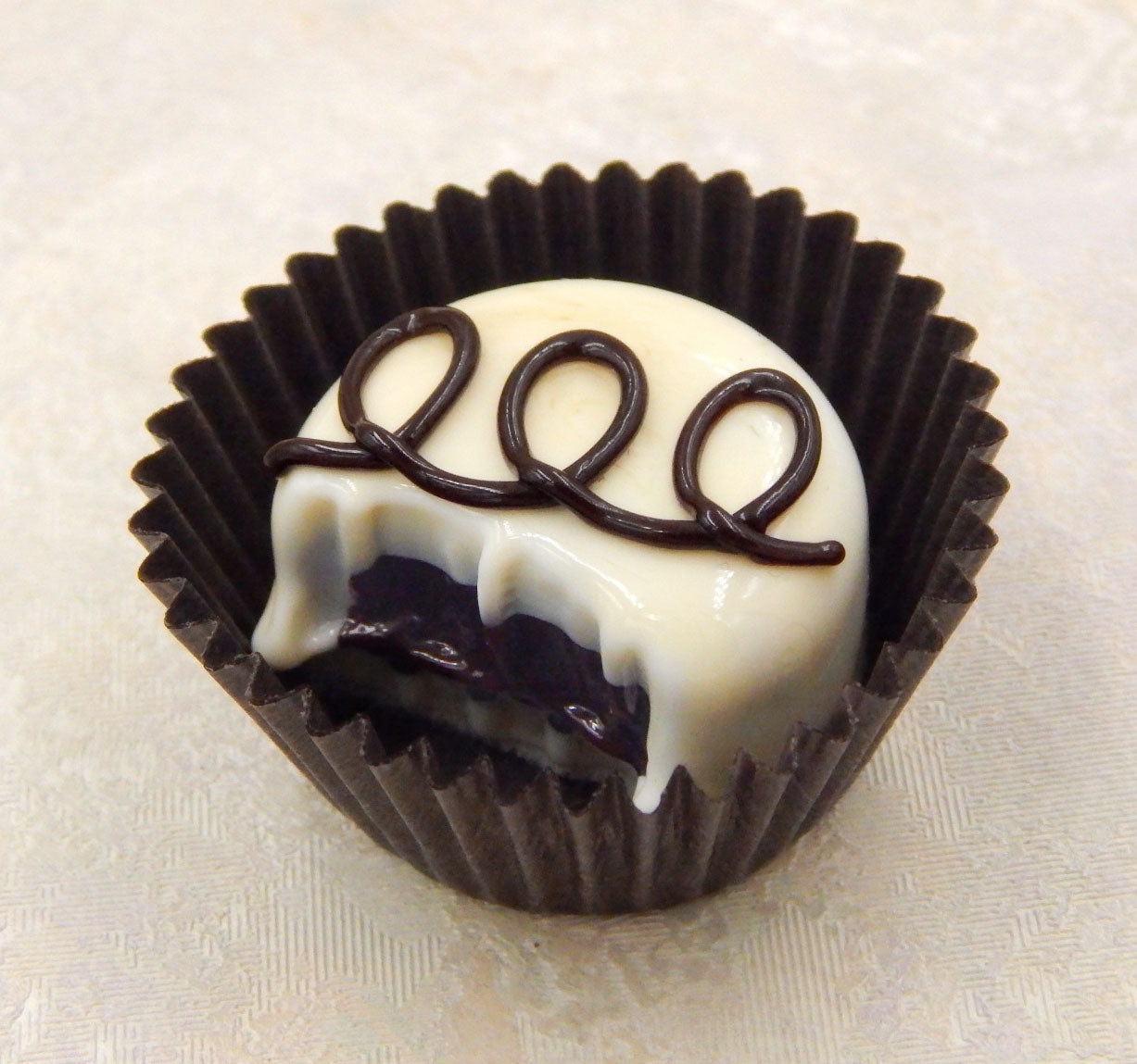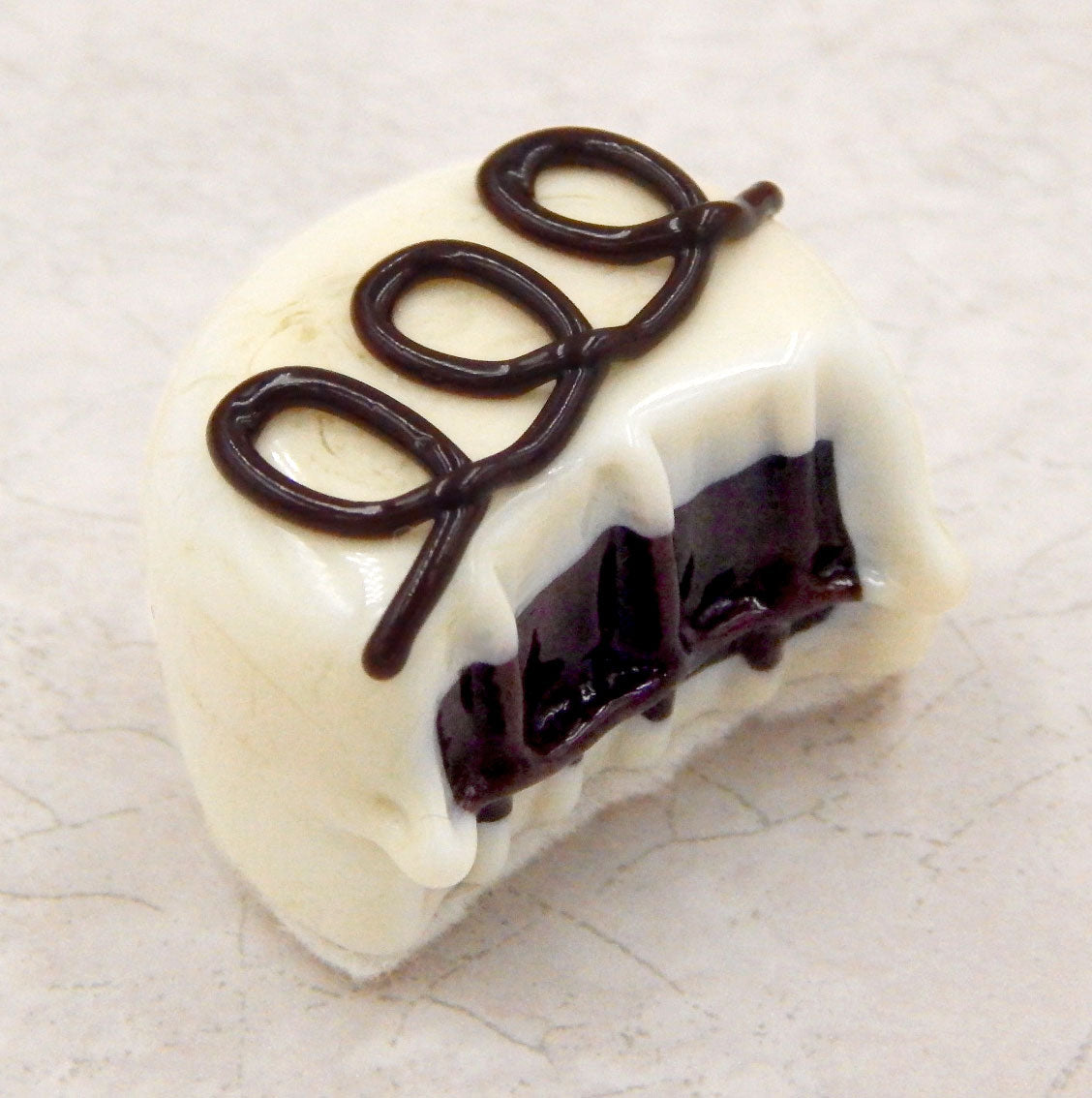 A handmade collectible solid glass bitten vanilla chocolate with loops of dark chocolate on top created from colorful glass utilizing flameworking techniques. Meticulous attention to detail has gone into the construction of each of our pieces to enhance its appeal and collectibility.