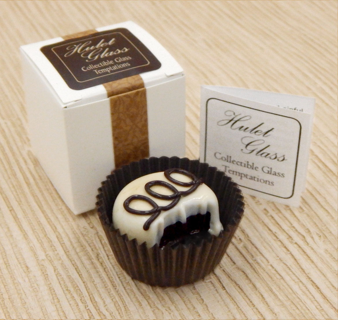 The glass chocolate measures 1.25" x 1" (slightly larger than an actual chocolate candy) and sits in a fluted glassine paper candy cup. The bottom of the chocolate is covered in felt to protect the surface it will sit upon. Each beautiful glass chocolate is signed (Hulet), dated and comes to you in a colorful gift box with an enclosure card telling a bit about the piece.