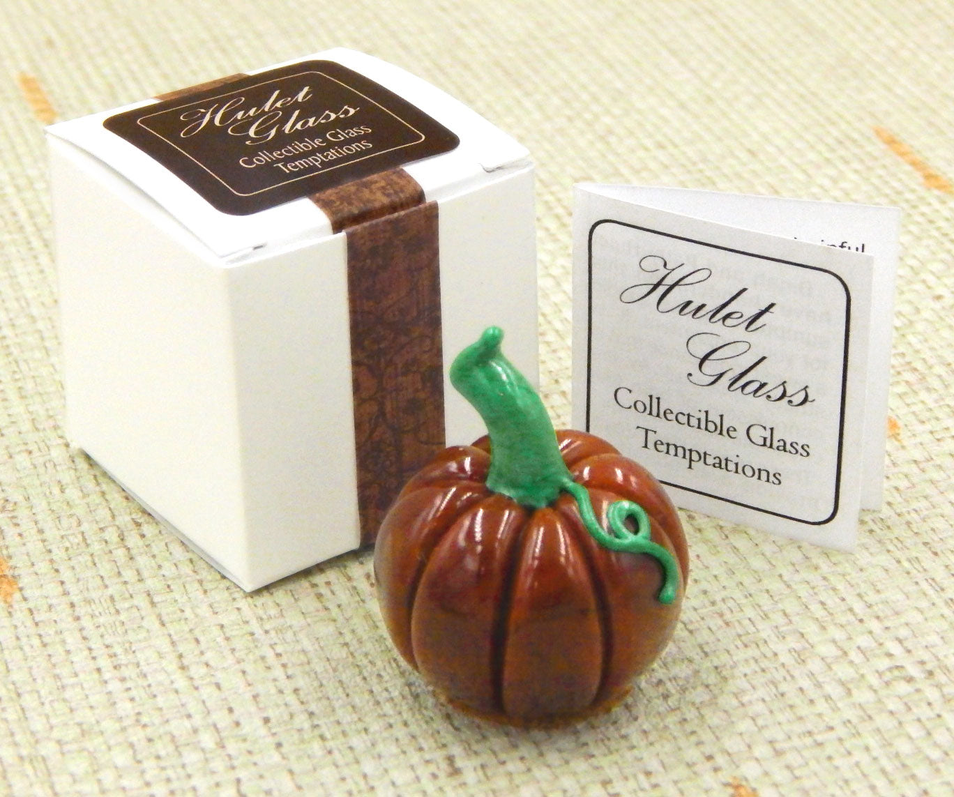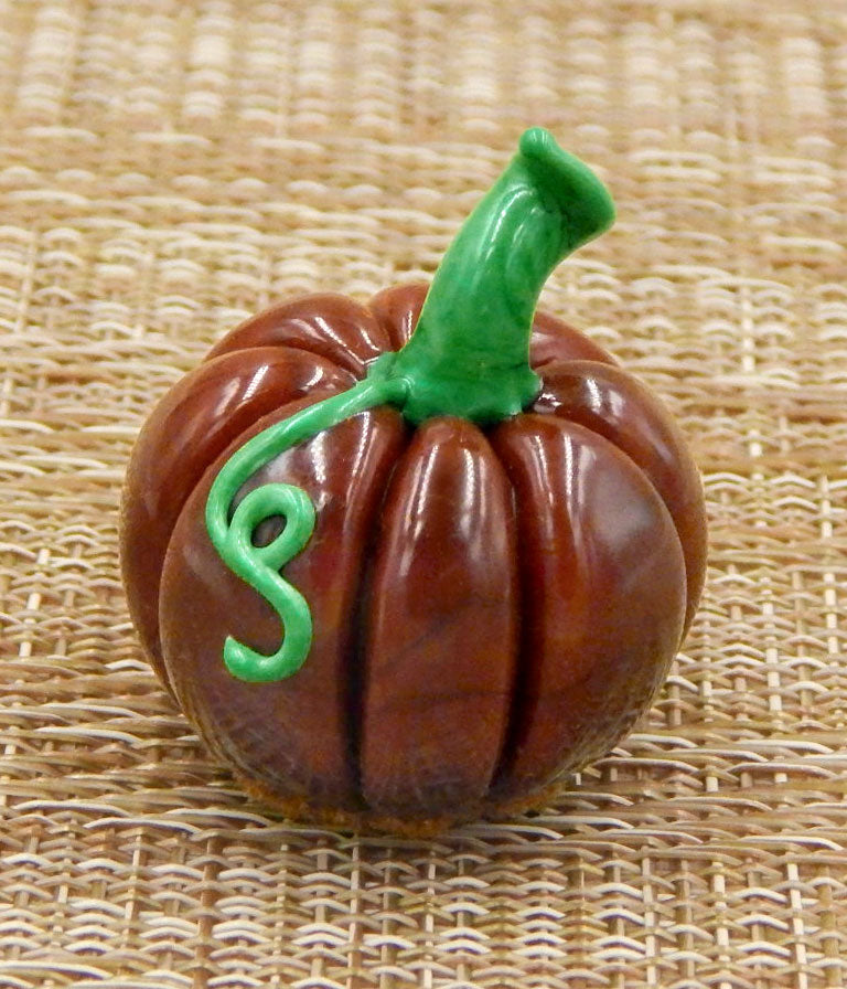 A handmade collectible solid glass caramel pumpkin chocolate created from colorful glass utilizing pate de verre and flameworking techniques. Meticulous attention to detail has gone into the construction of each of our pieces to enhance its appeal and collectibility.