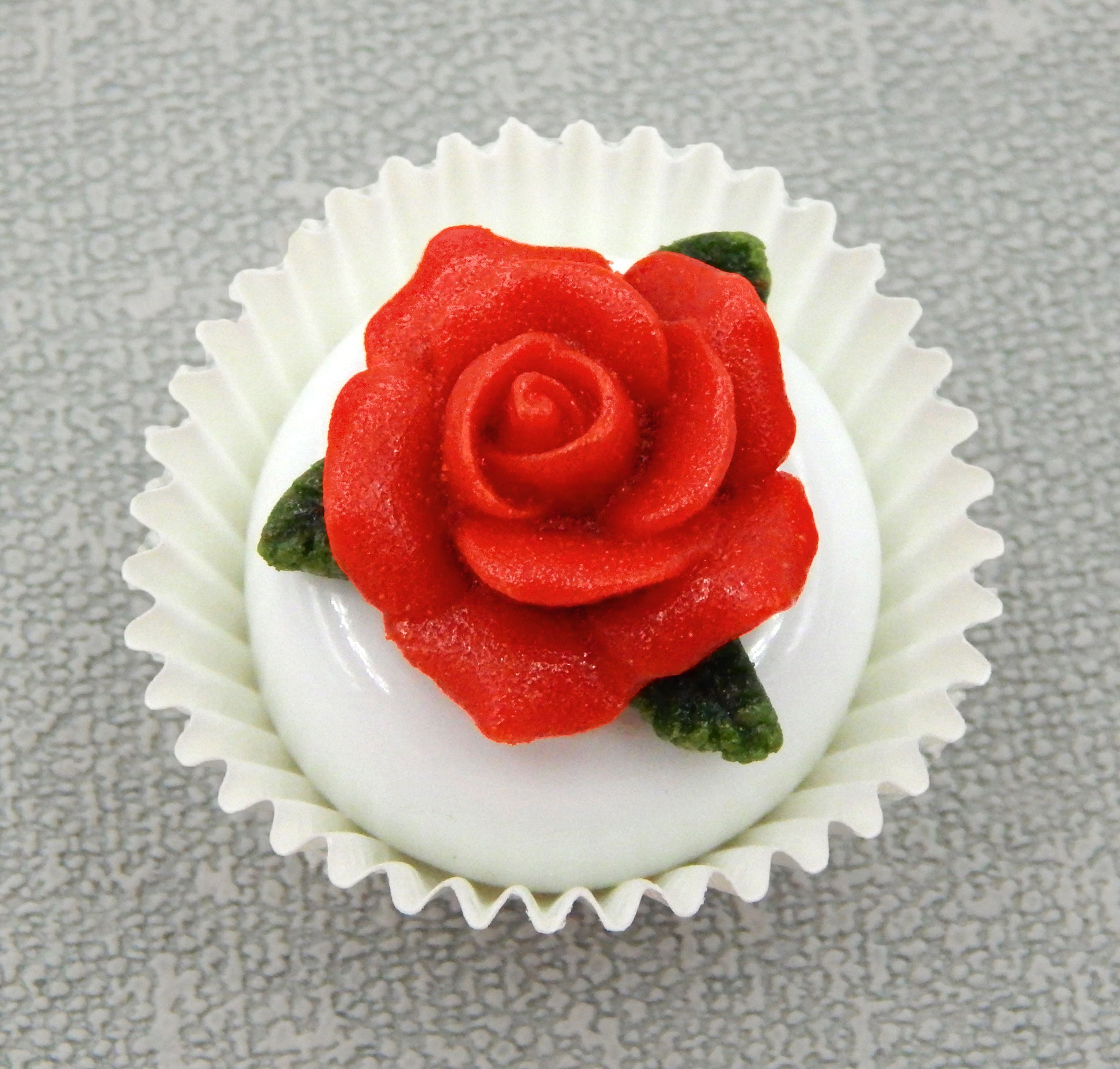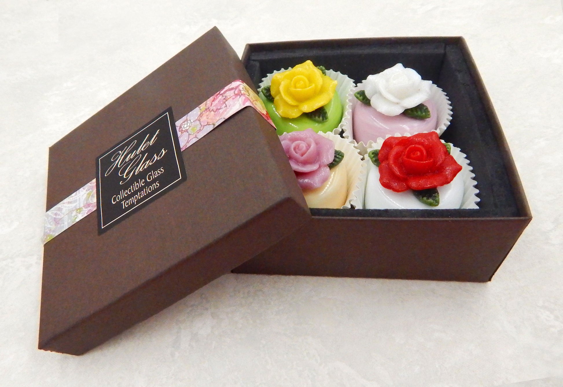 A handmade box of 4 collectible solid glass Rose Petit Four chocolates. The box is created by the Hulet sisters to frame their hand sculpted glass chocolates and to securely protect them for years to come. The box is padded on all sides to cushion the glass candies inside. Meticulous attention to detail has gone into the construction of each of our creations to enhance its appeal and collectibility.