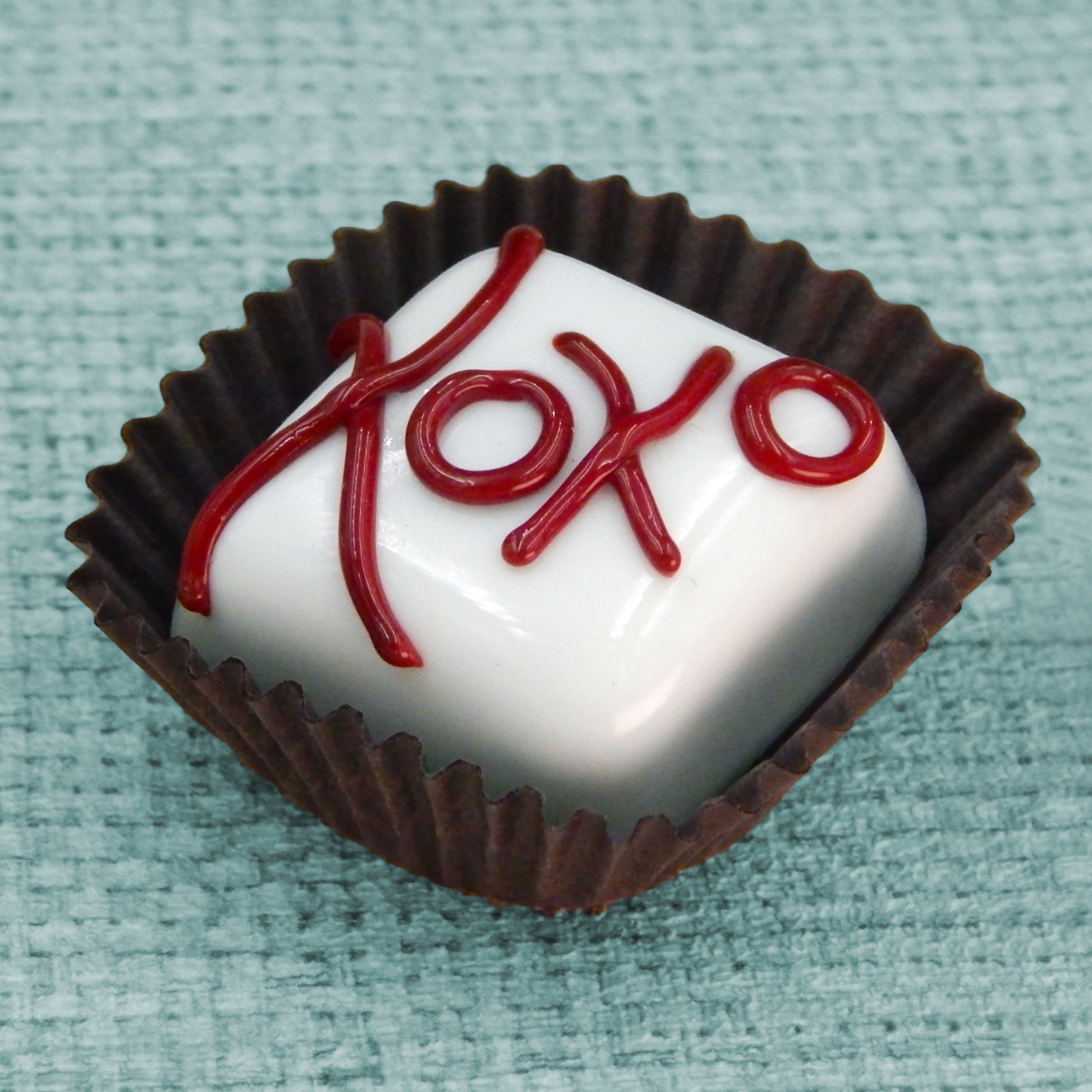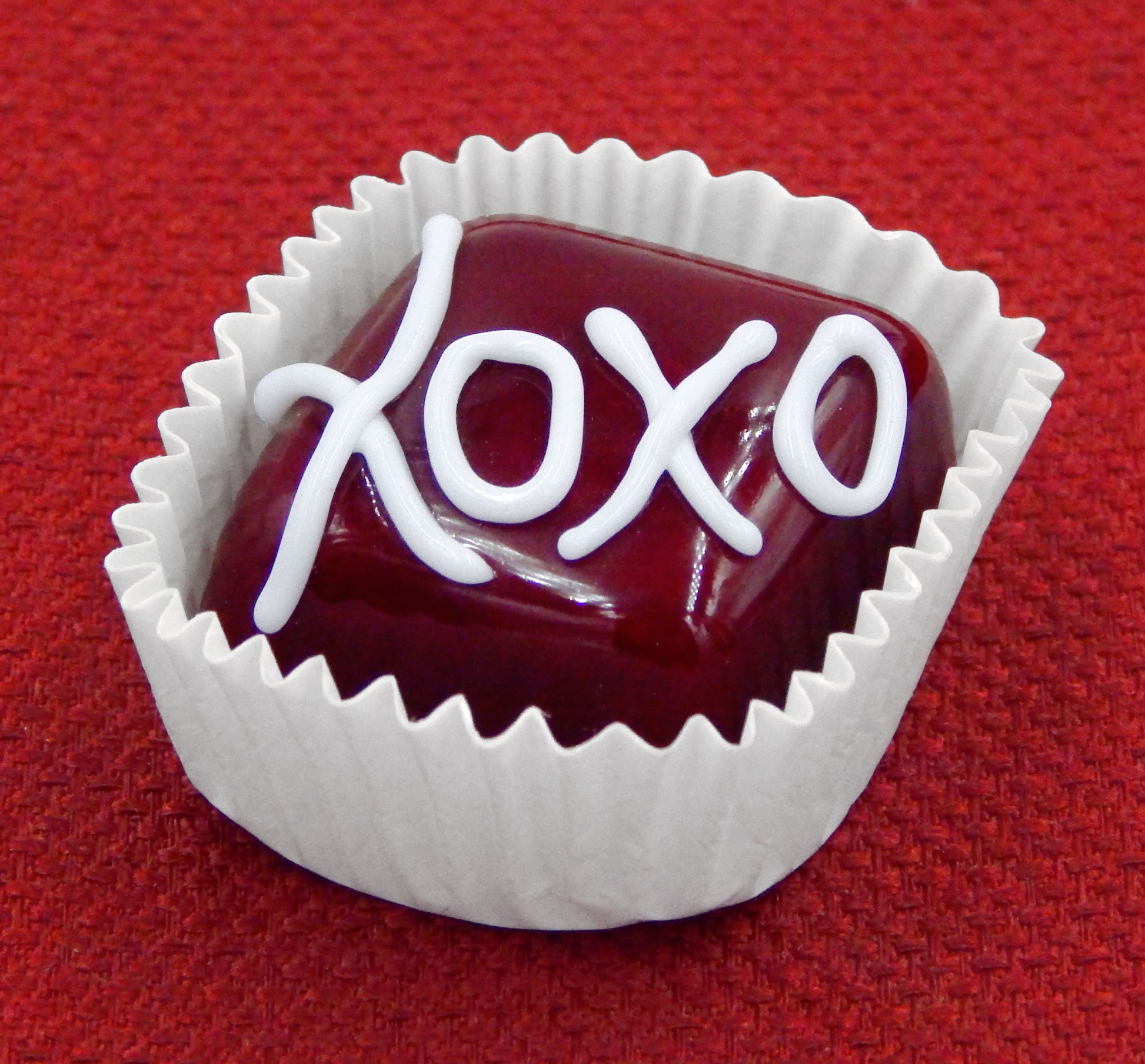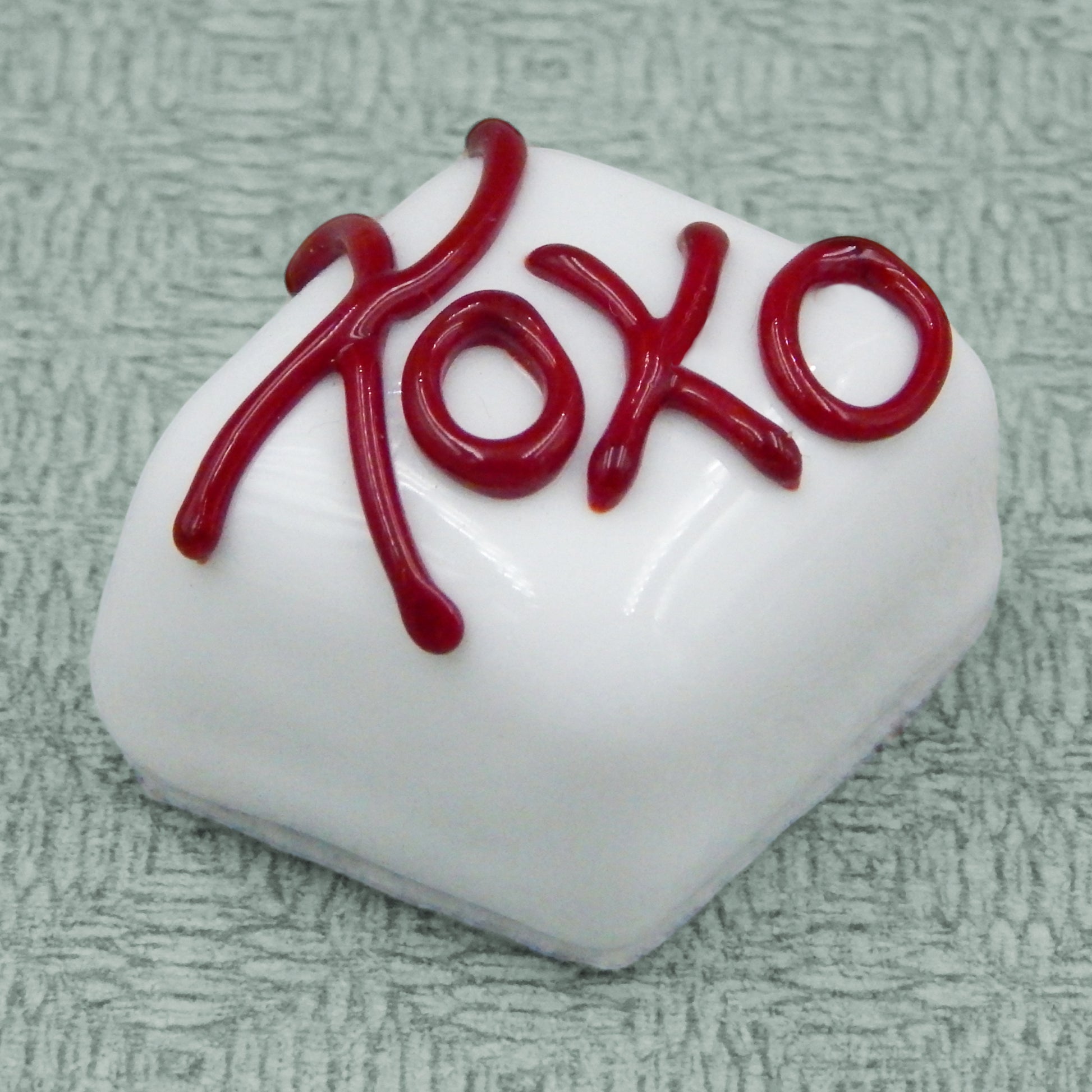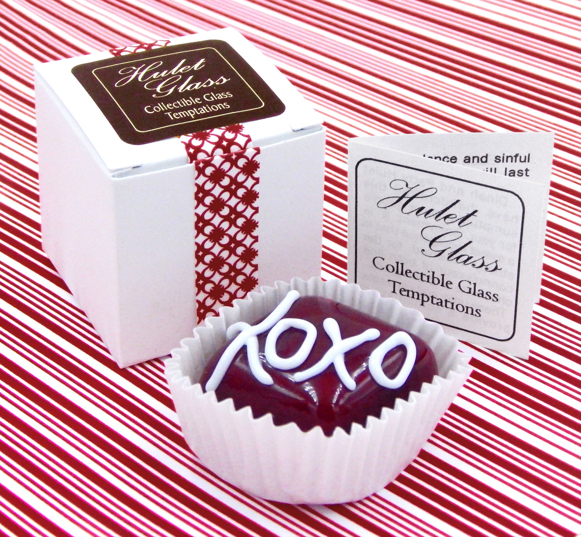 Handmade collectible solid glass chocolates with creamy "XOXO" designs on top created from colorful glass utilizing ancient lampworking techniques. Meticulous attention to detail has gone into the construction of each of our pieces to enhance its appeal and collectibility.
