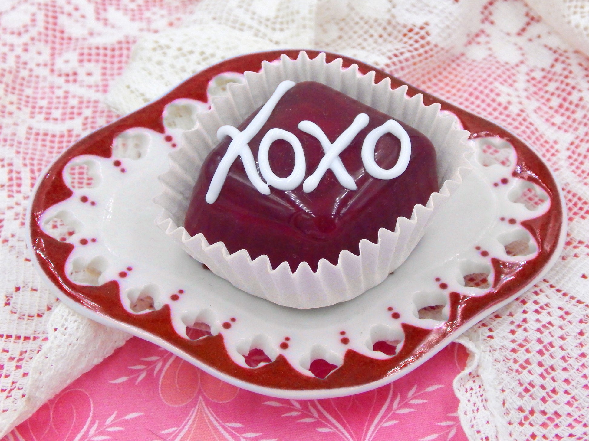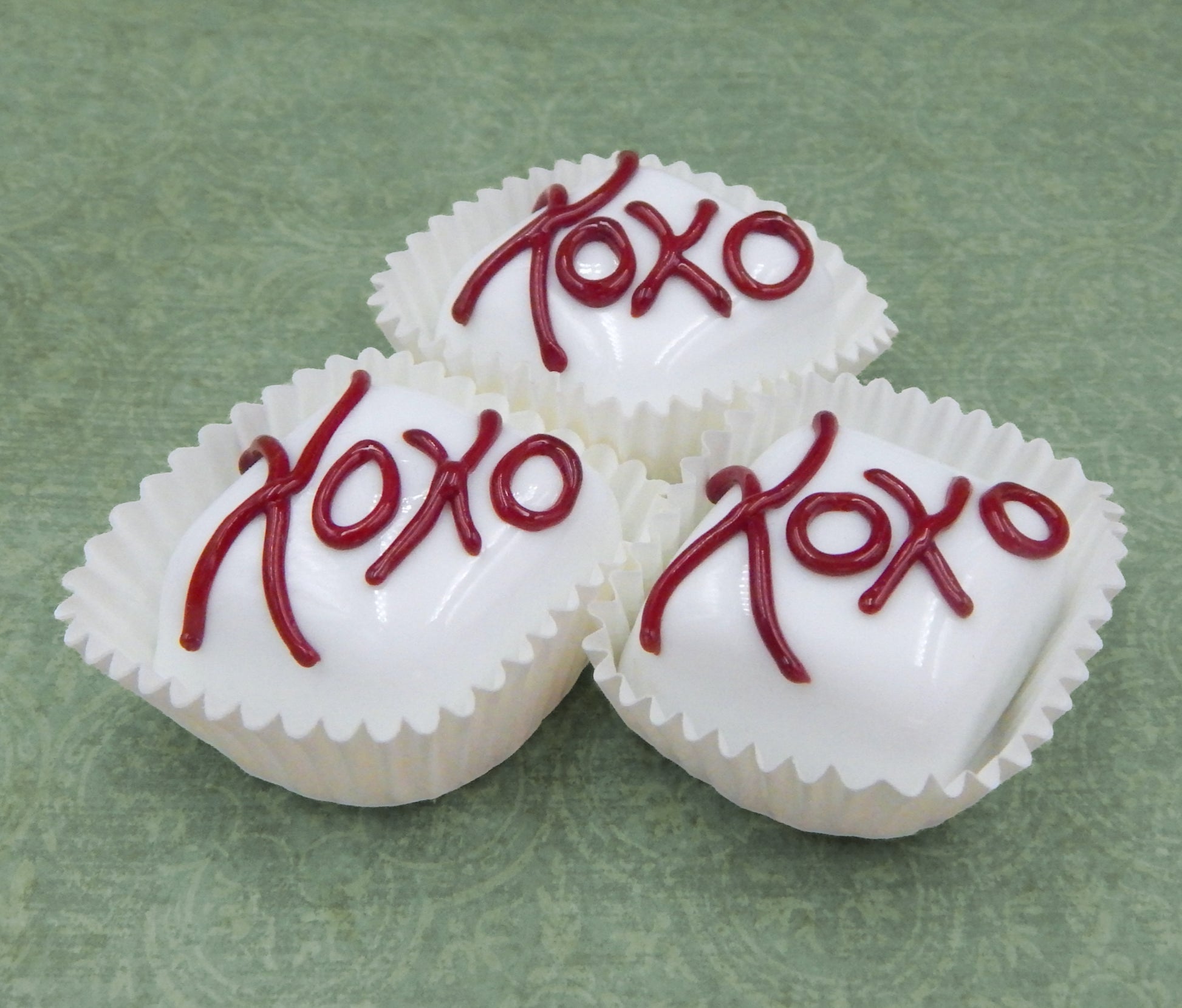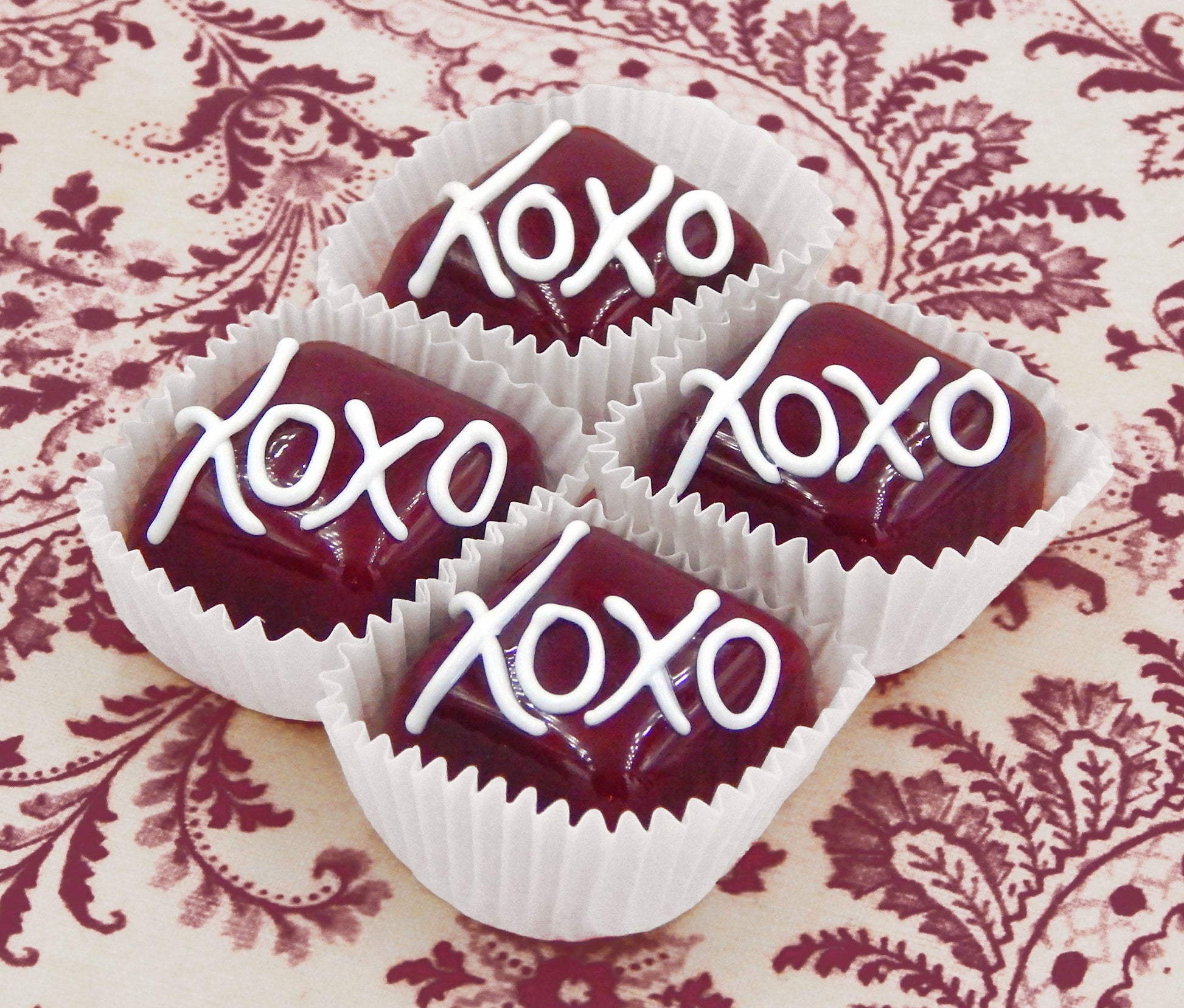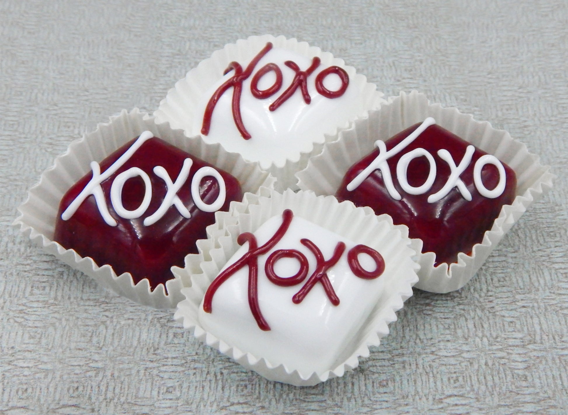 Handmade collectible solid glass chocolates with creamy "XOXO" designs on top created from colorful glass utilizing ancient lampworking techniques. Meticulous attention to detail has gone into the construction of each of our pieces to enhance its appeal and collectibility.