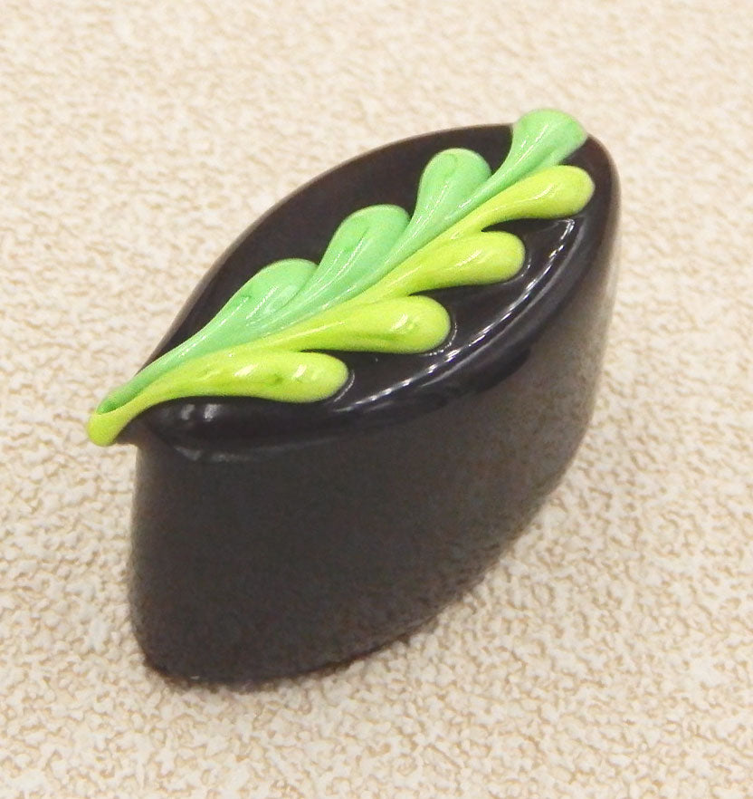 A handmade collectible solid glass chocolate with a creamy mint & pistachio design on top created from colorful glass utilizing flameworking techniques. Meticulous attention to detail has gone into the construction of each of our pieces to enhance its appeal and collectibility.