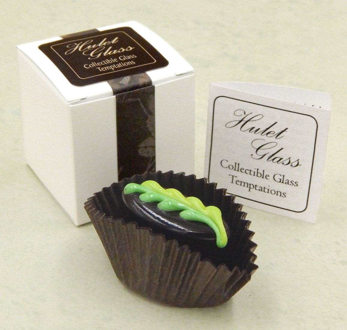 The glass chocolate measures 1.5" x .75" x 1" (slightly larger than an actual chocolate candy) and sits in a fluted glassine paper candy cup. The bottom of the chocolate is covered in felt to protect the surface it will sit upon. Each beautiful glass chocolate is signed (Hulet), dated and comes to you in a colorful gift box with an enclosure card telling a bit about the piece.