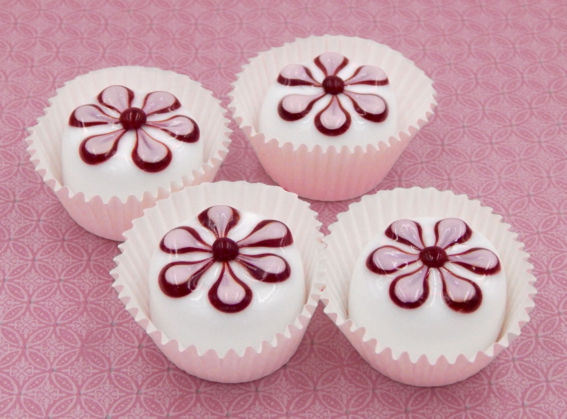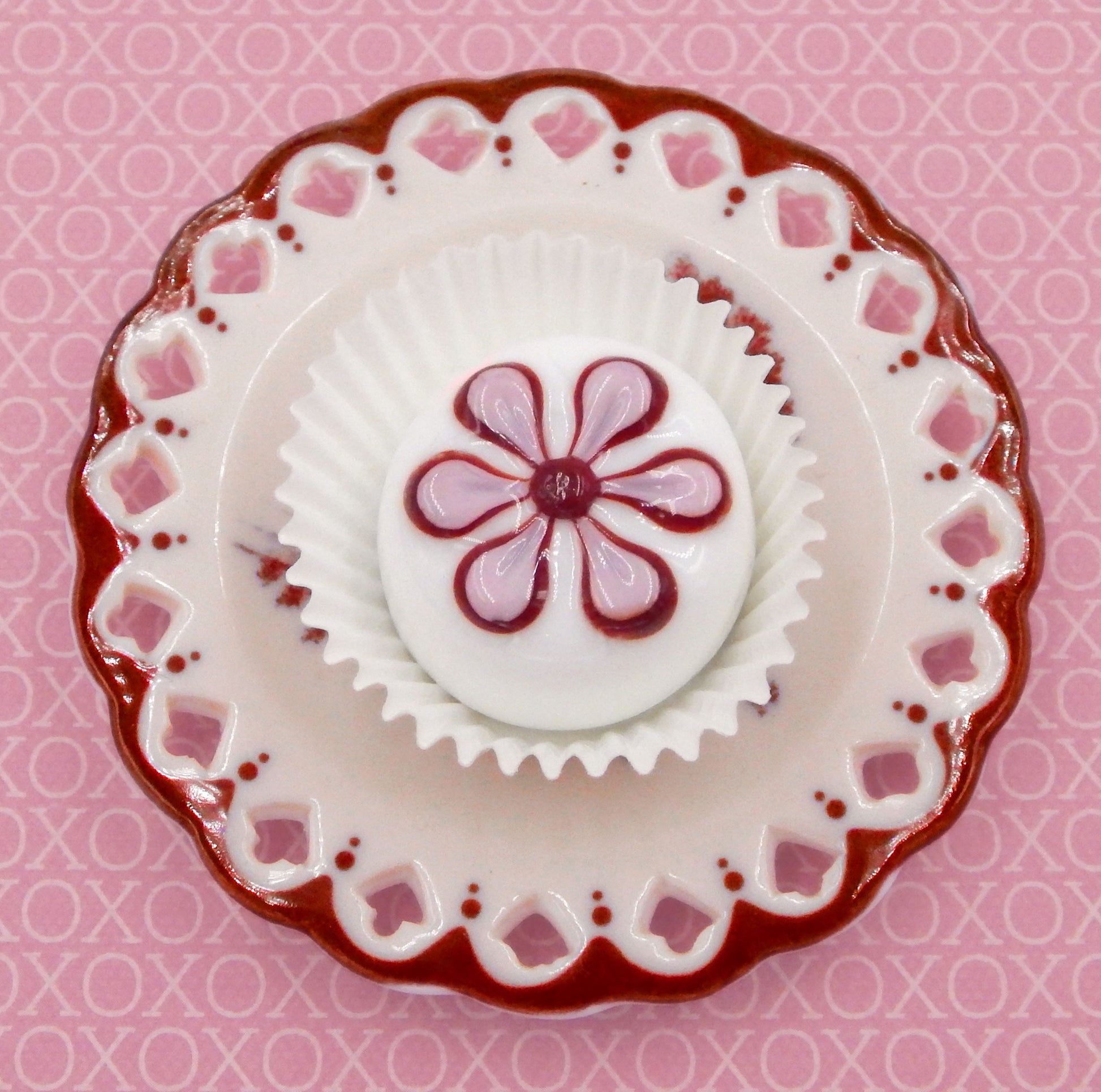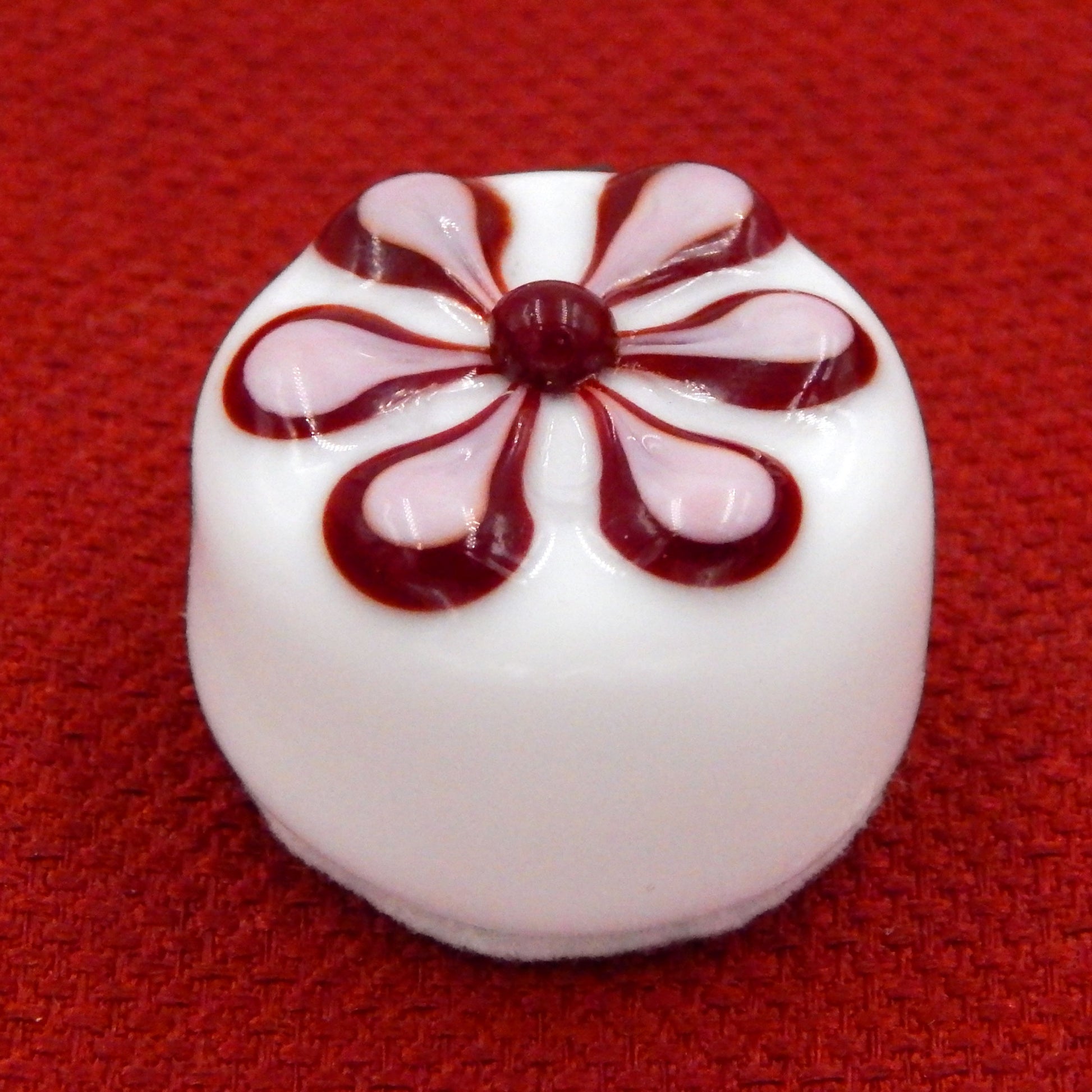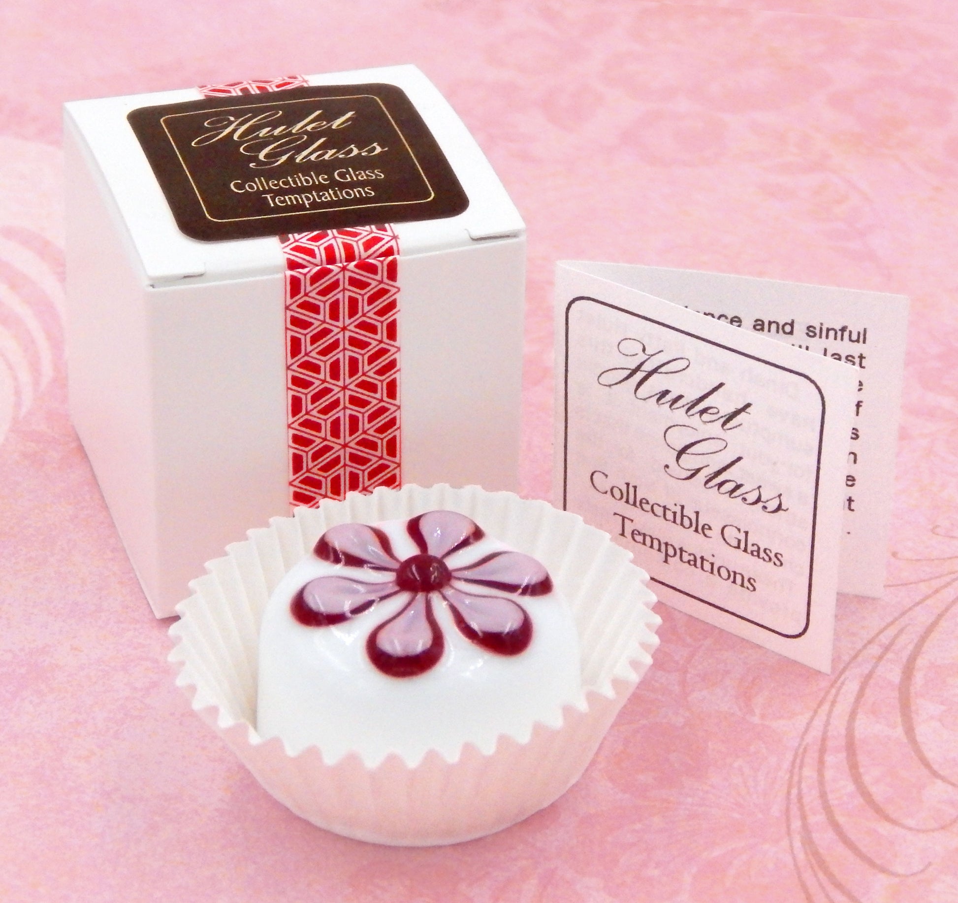 A handmade collectible solid glass white chocolate with a pansy design of cherry and strawberry created from colorful glass utilizing flameworking techniques. Meticulous attention to detail has gone into the construction of each of our pieces to enhance its appeal and collectibility.