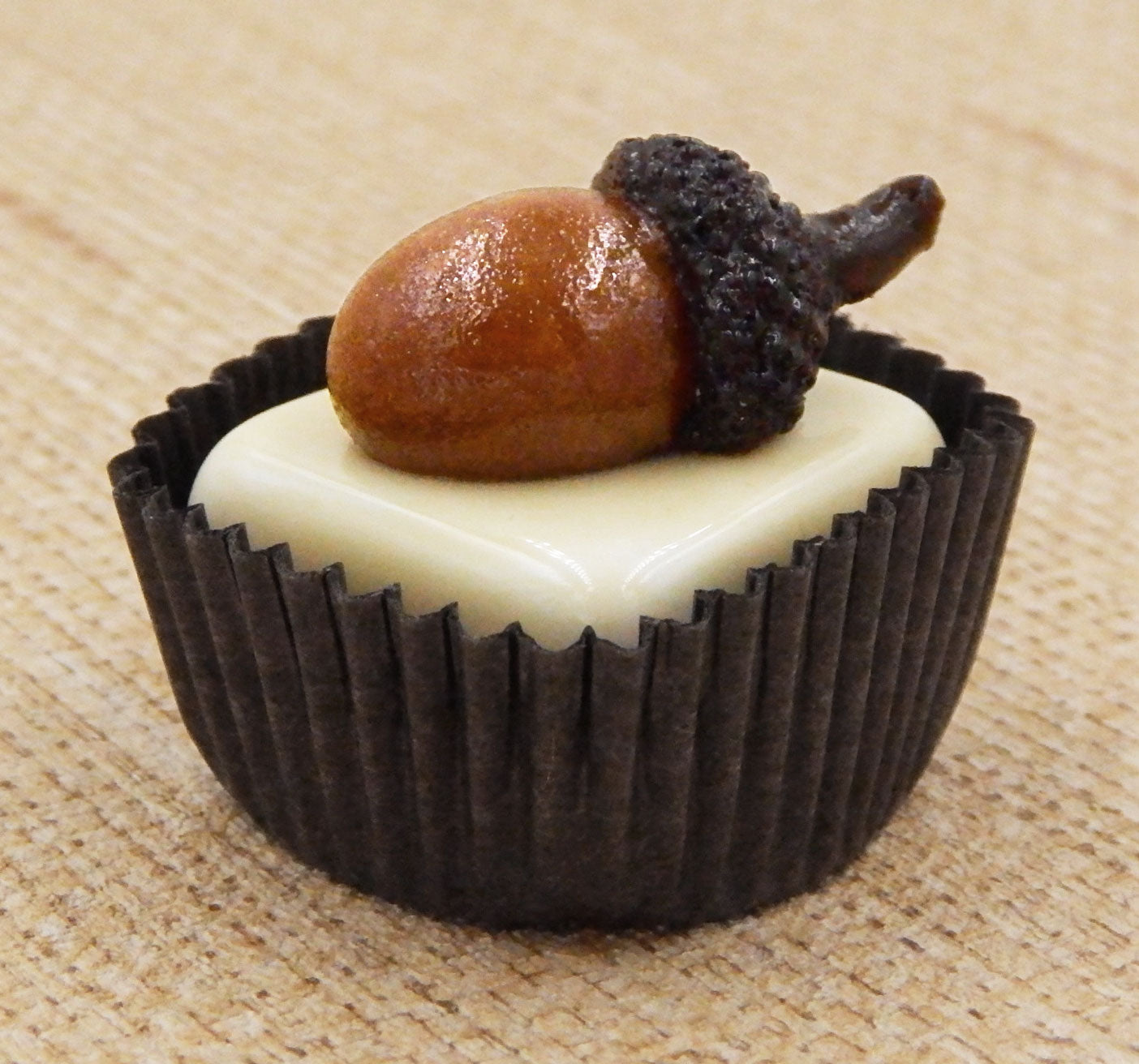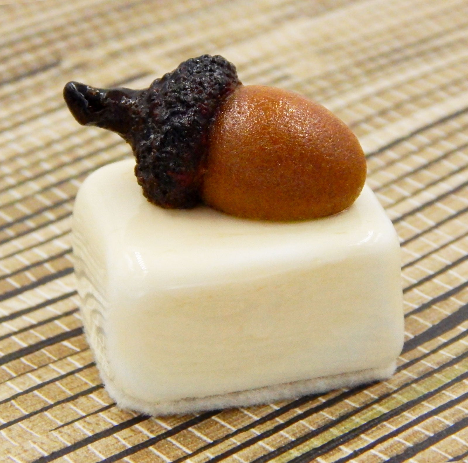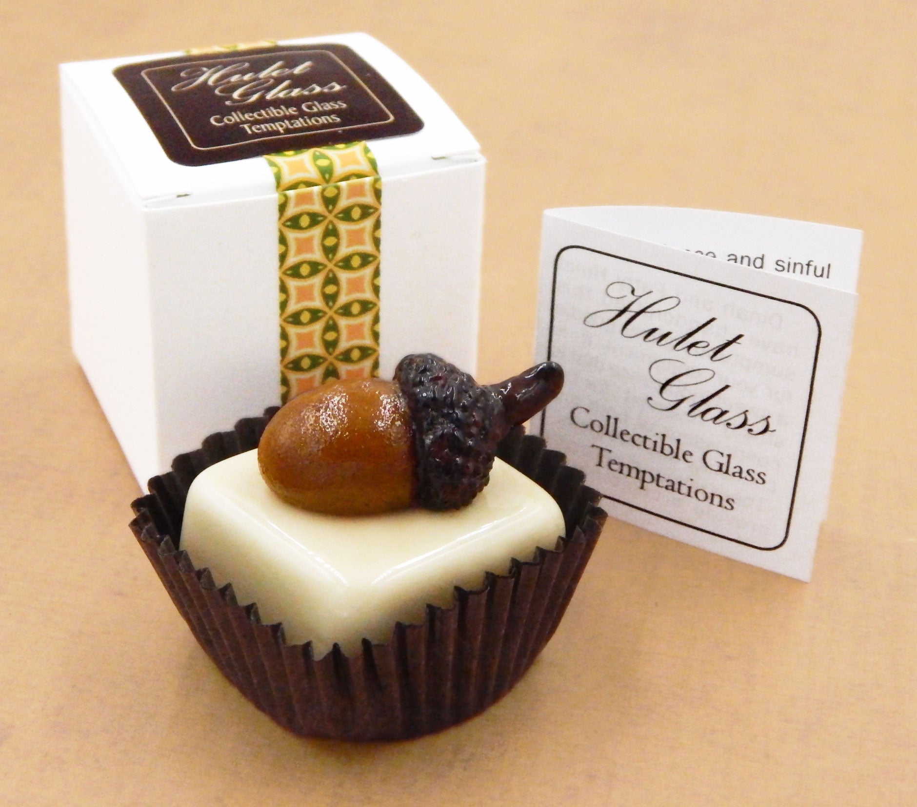 A handmade collectible solid glass vanilla chocolate with an acorn on top created from colorful glass utilizing ancient pate de verre and lampworking techniques. Meticulous attention to detail has gone into the construction of each of our pieces to enhance its appeal and collectibility.