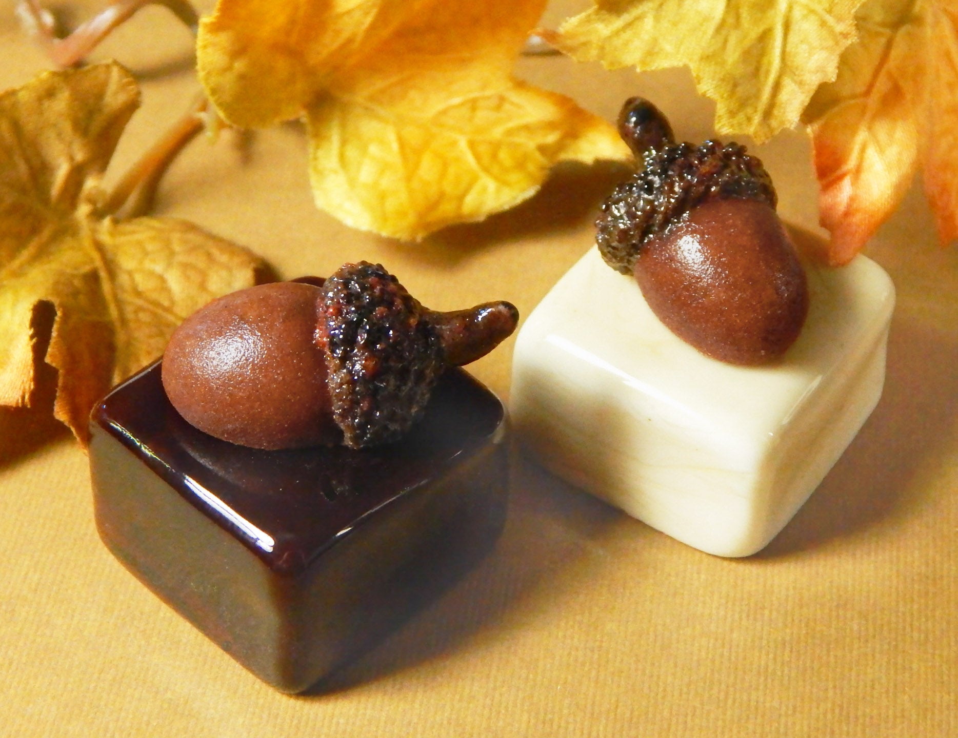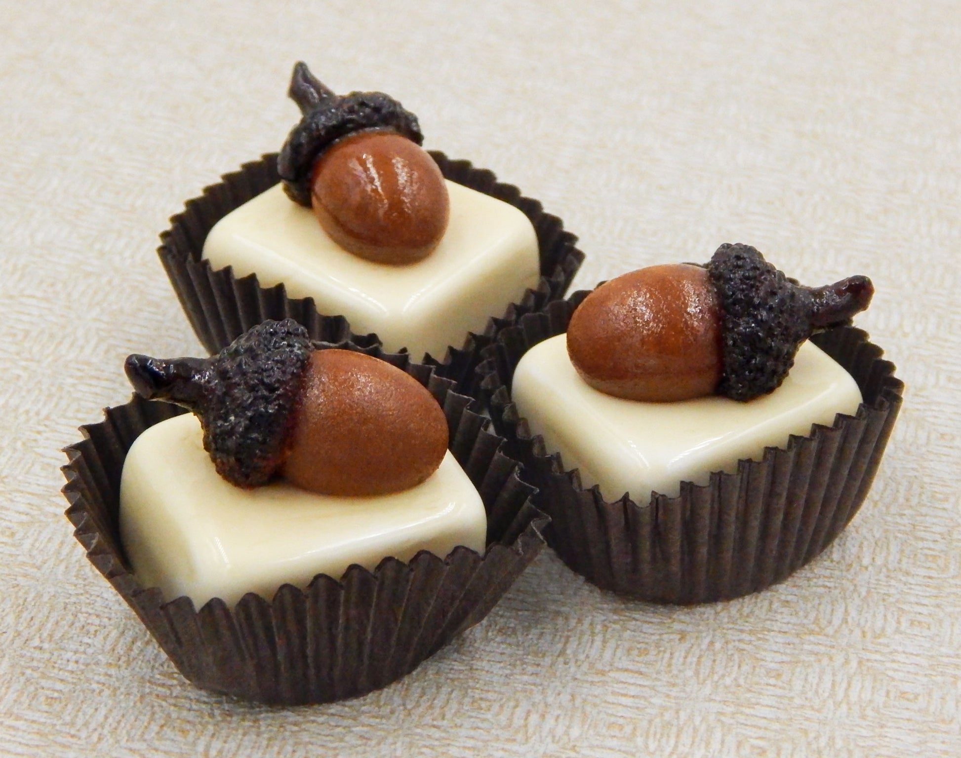 This listing is for 1 glass chocolate as seen in the first photo. The third photo shows an example of the slight variation between individual handmade chocolates and the final photo shows both vanilla and dark chocolates with acorns. The dark chocolate acorn chocolates are also available.