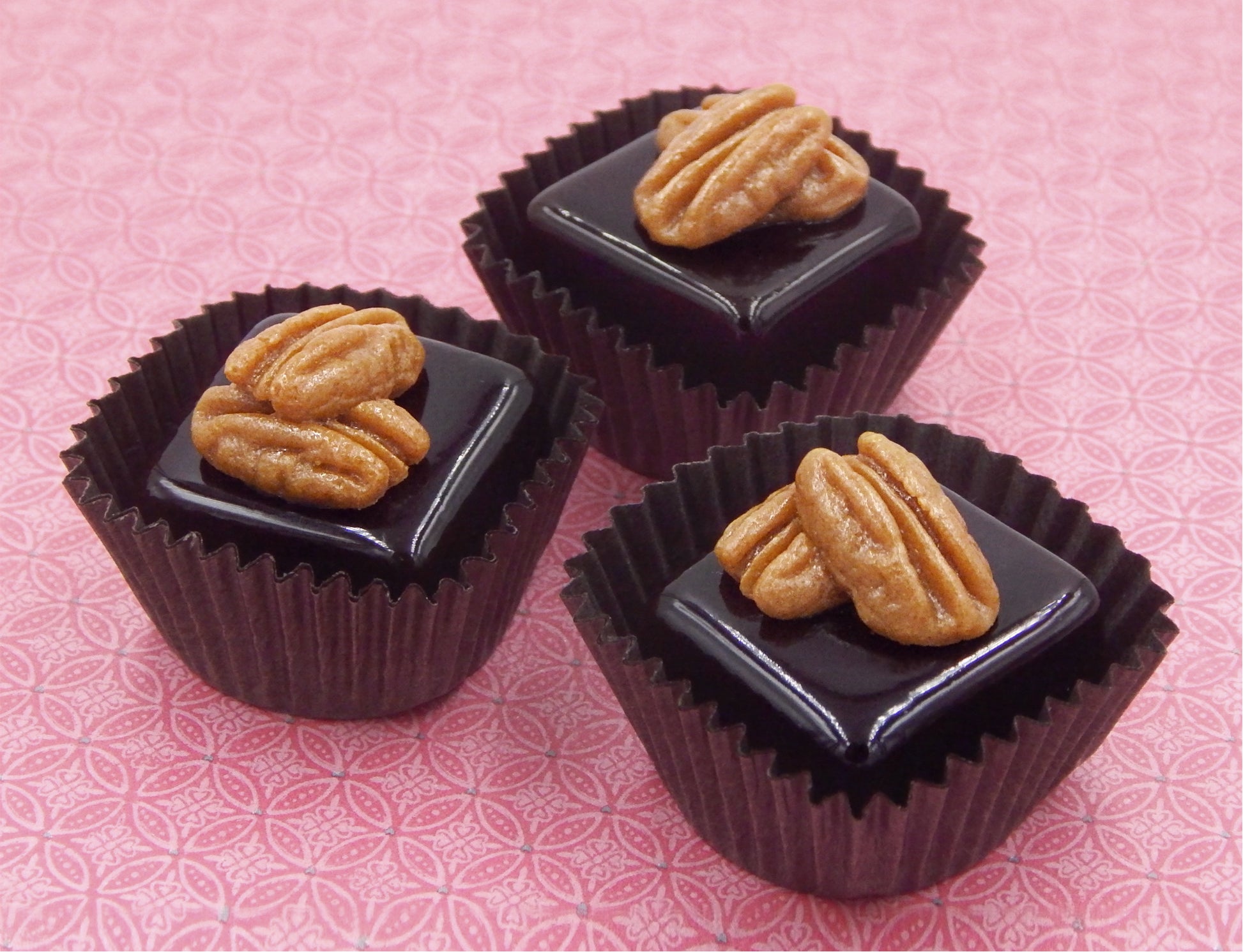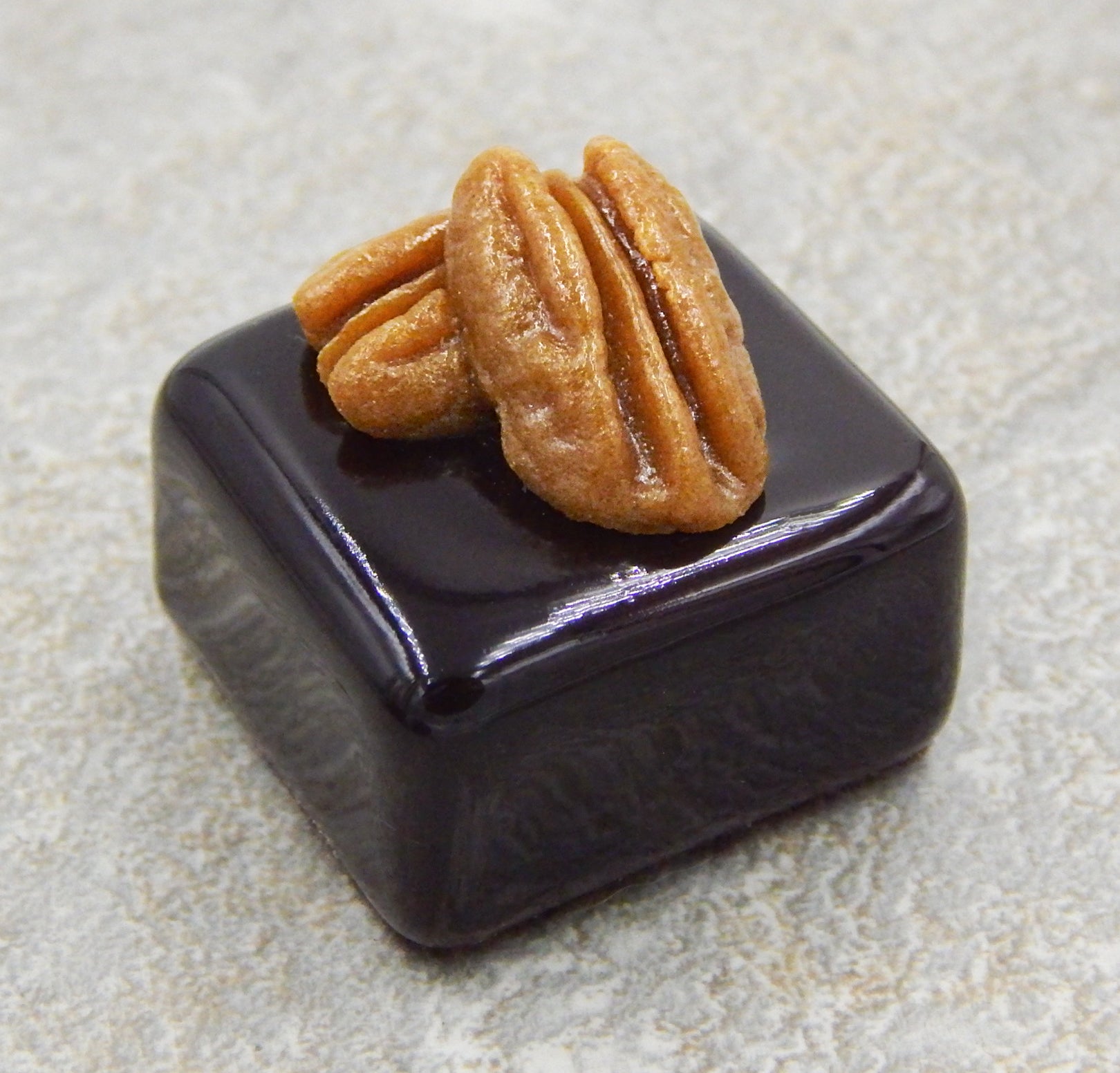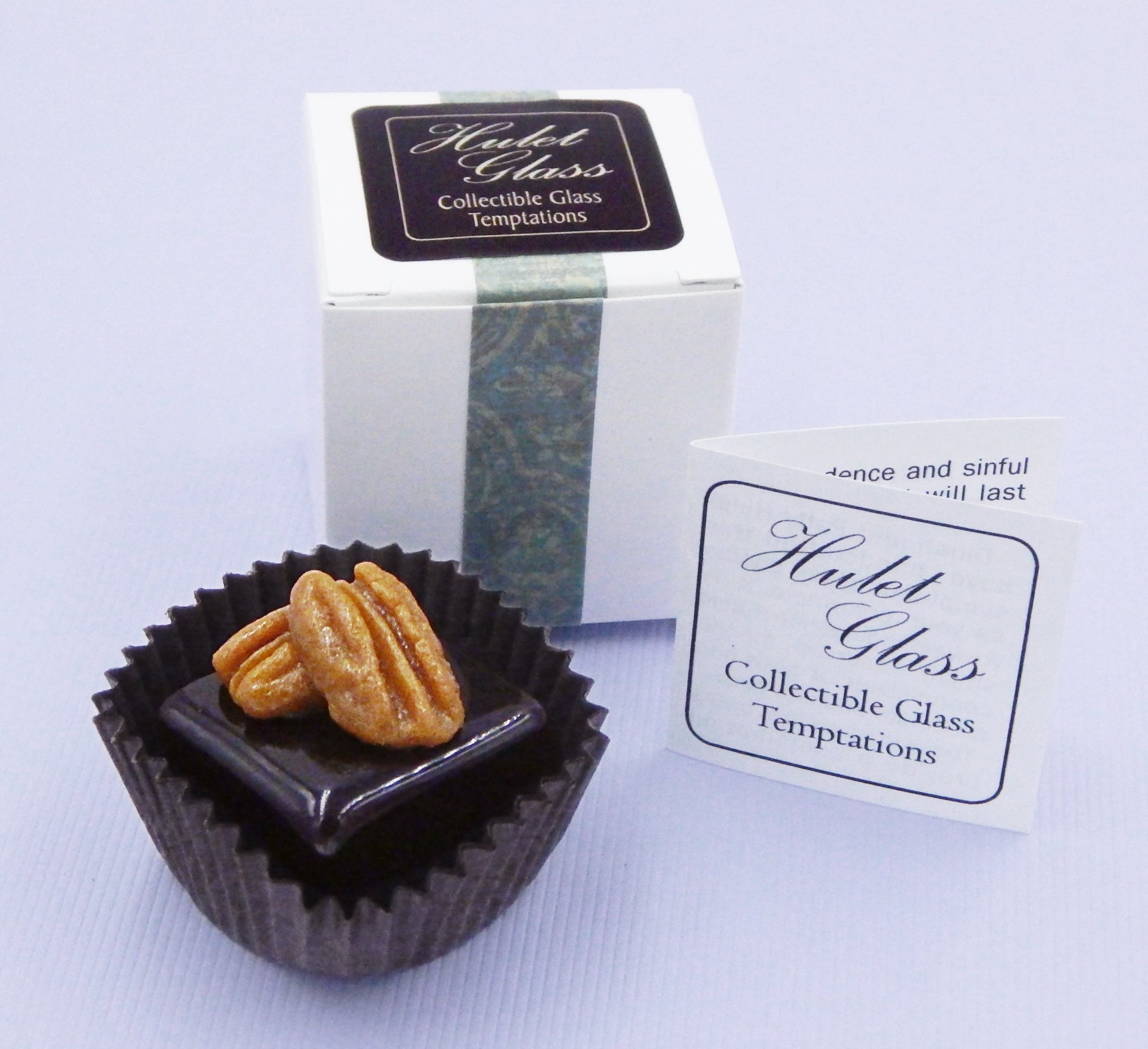 A handmade collectible solid glass chocolate with pecans on top created from colorful glass utilizing ancient pate de verre and lampworking techniques. Meticulous attention to detail has gone into the construction of each of our pieces to enhance its appeal and collectibility.