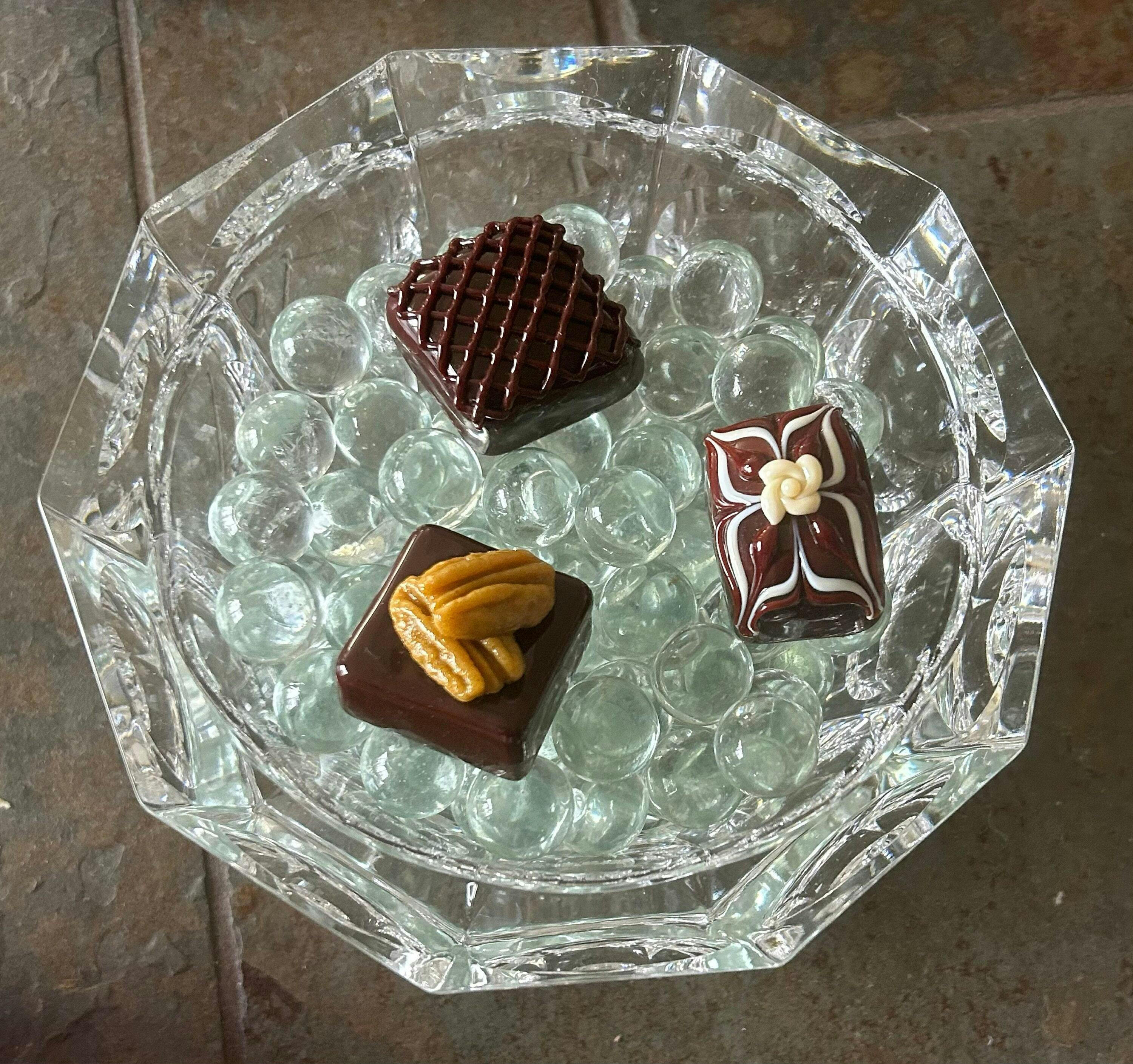 This inedible chocolate is from our 'Nuts & Crunchies Collection' and is just one of our many chocolate treats. We design our art glass delicacies to evoke memories of innocence, love and happy times. These pieces are created to tease, seduce, tempt and delight. Use them to create a unique display in a favorite heirloom dish or cabinet for your home or office. They are also perfect and thoughtful gifts for yourself or your friends.