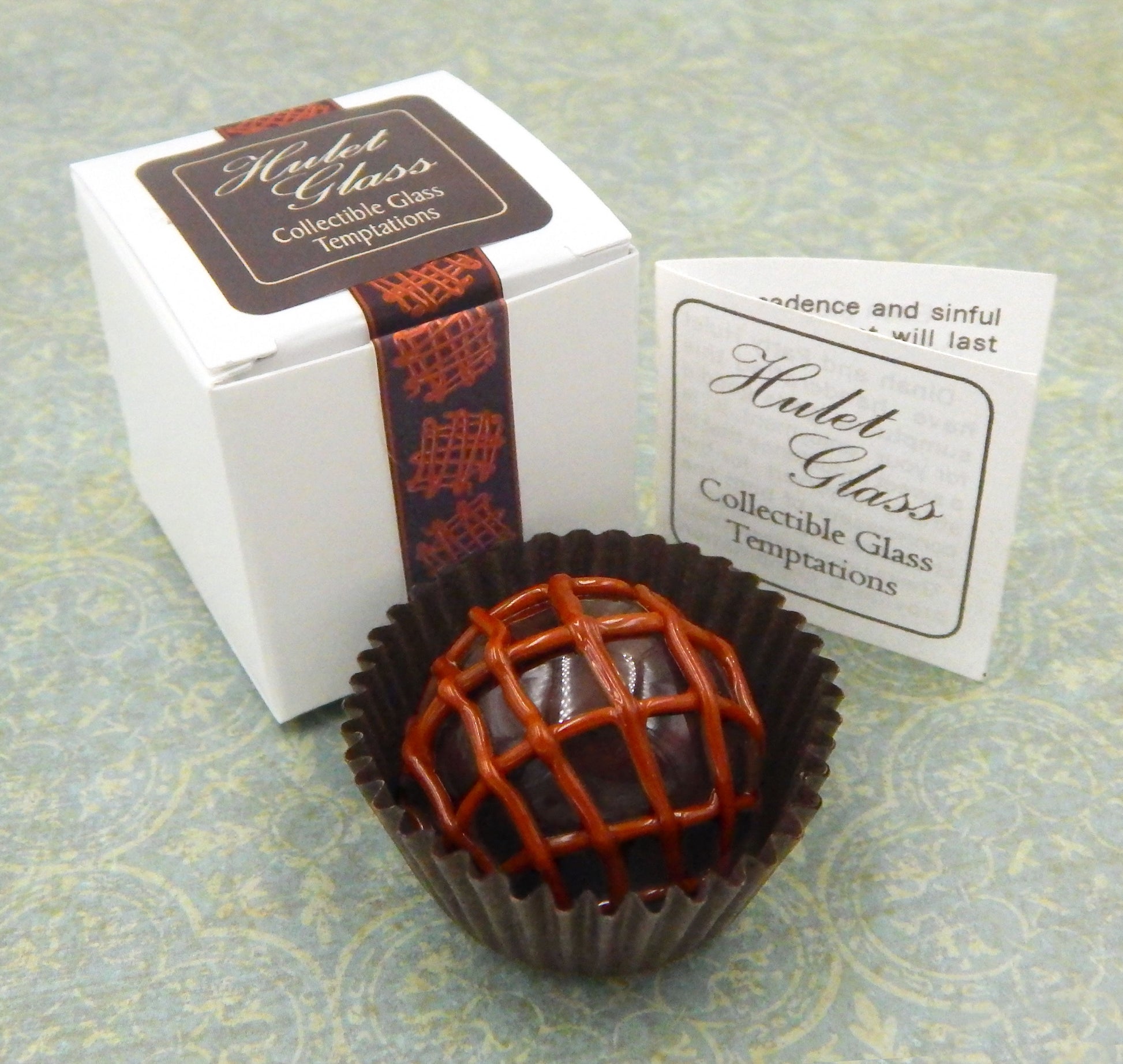 Each glass bon bon measures approximately 1.5" x 1" (slightly larger than an actual chocolate candy) and sits in a fluted glassine paper candy cup. The bottom of each chocolate is covered in felt to protect the surface it will sit upon. Each beautiful glass treat is signed (Hulet), dated and comes to you in a colorful gift box with an enclosure card telling a bit about the piece.
