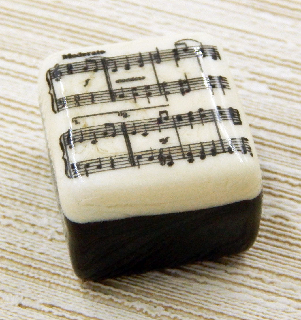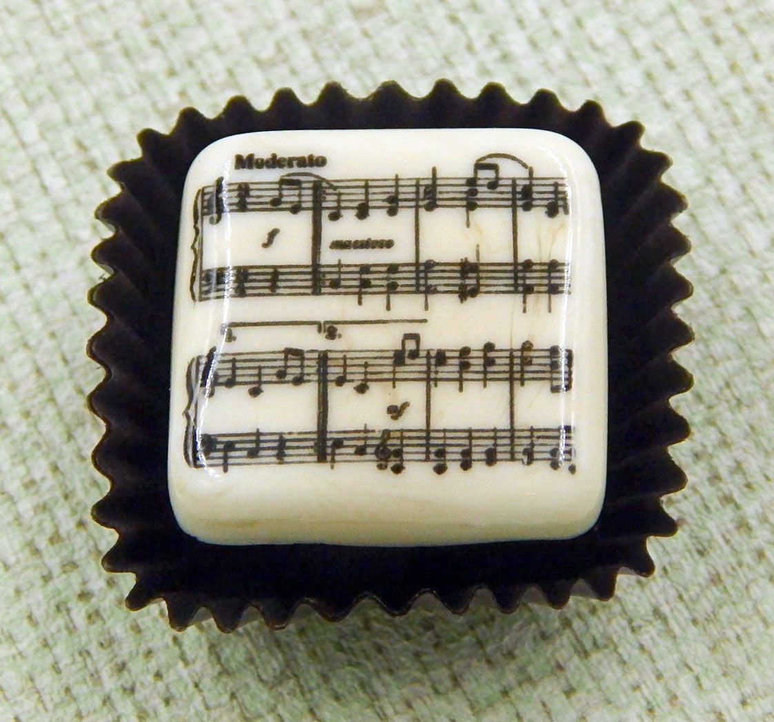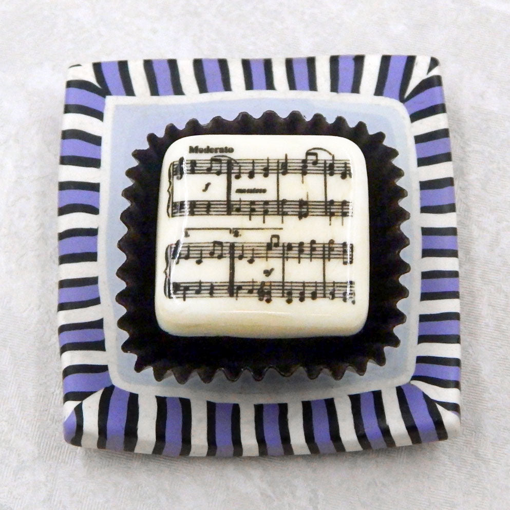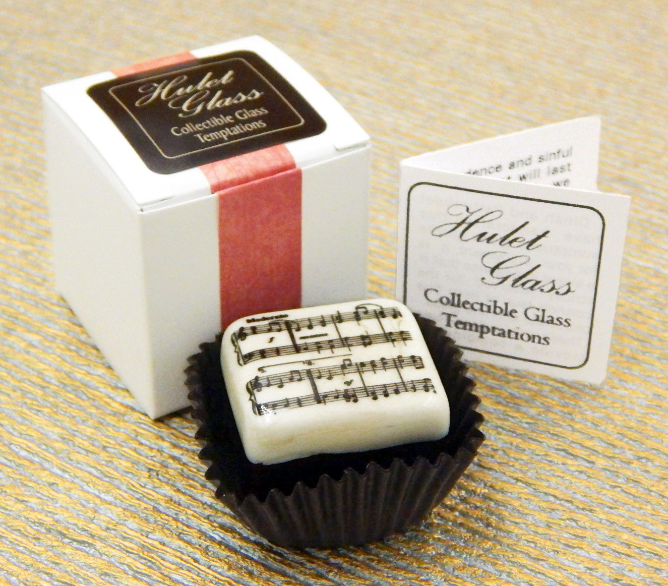 A handmade collectible solid glass chocolate topped with a layer of vanilla and a small bit of music. This glass chocolate is created from colorful glass utilizing flameworking techniques. Meticulous attention to detail has gone into the construction of each of our pieces to enhance its appeal and collectibility.