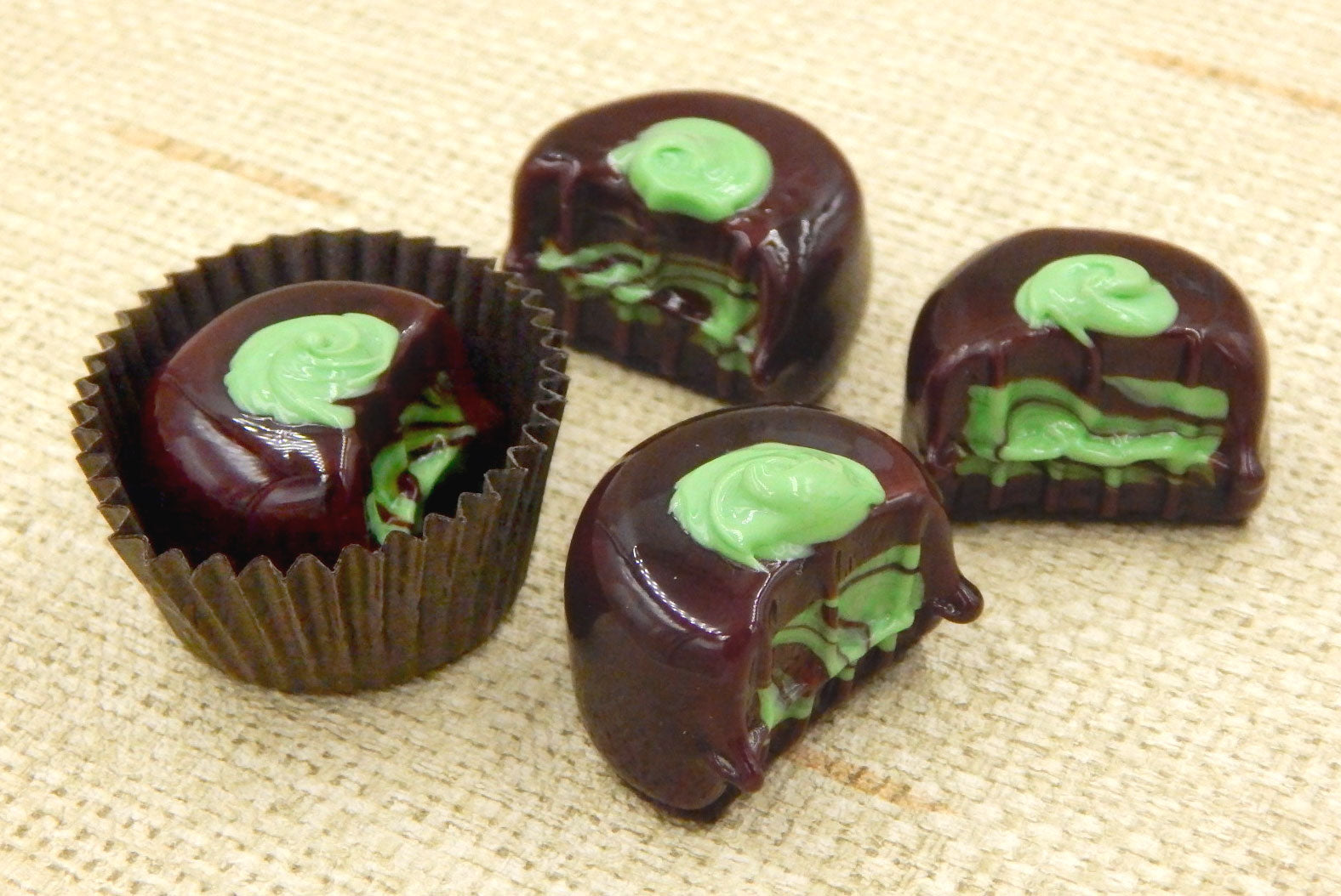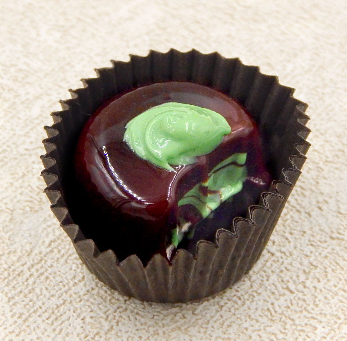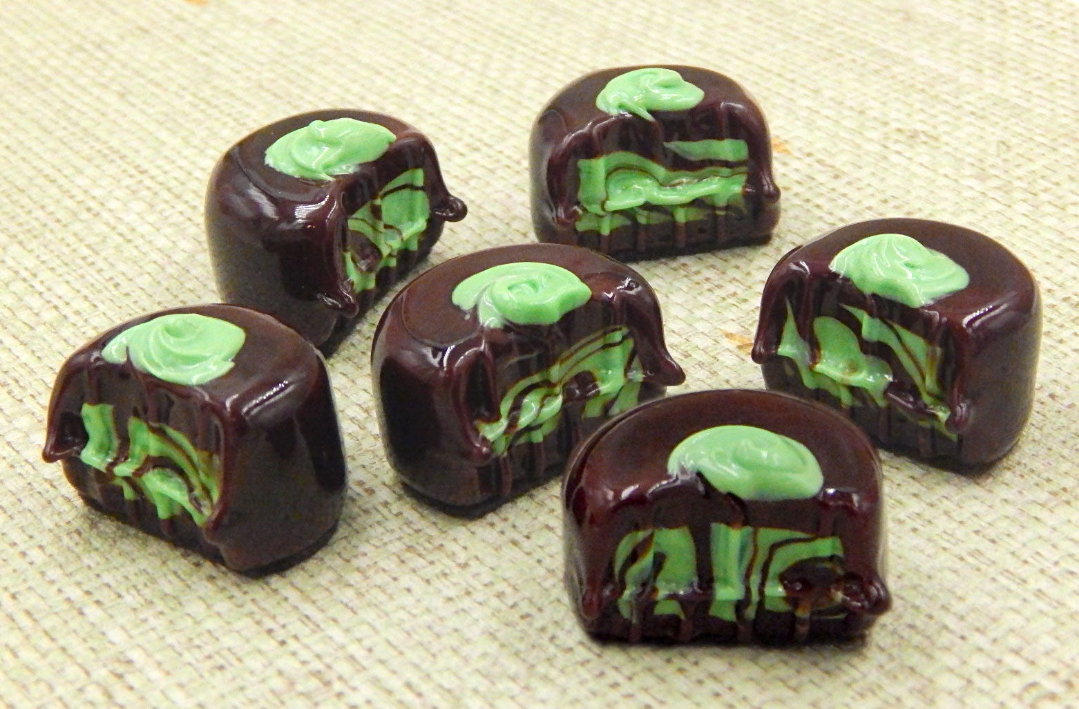 A handmade collectible solid glass bitten chocolate with a creamy mint dollop on top and stuffed with a refreshing chocolate/mint glass filling. It is created from colorful glass utilizing flameworking techniques. Meticulous attention to detail has gone into the construction of each of our pieces to enhance its appeal and collectibility.