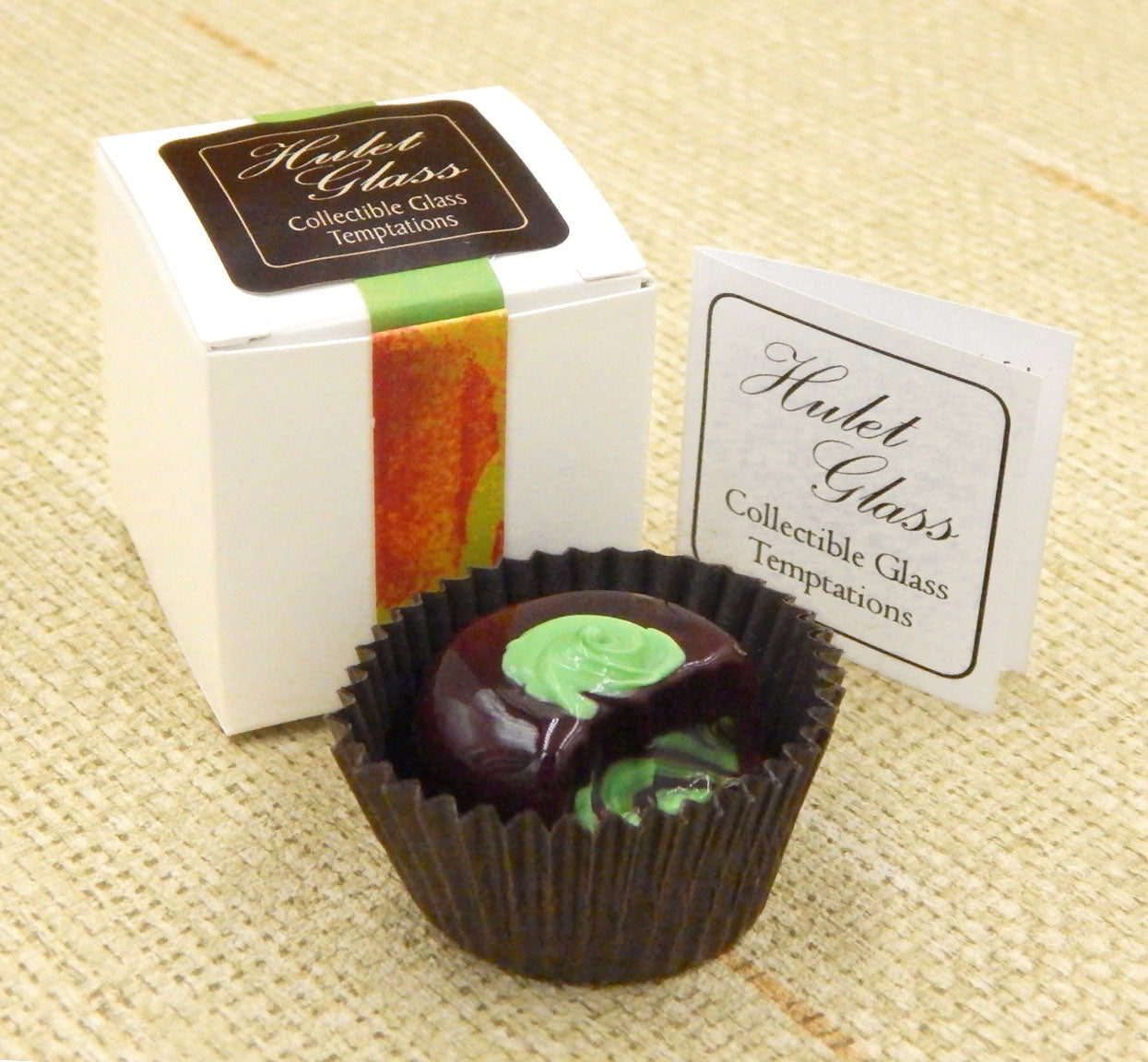 The glass chocolate measures approximately 1.25" x .75" (slightly larger than an actual chocolate candy) and sits in a fluted glassine paper candy cup. The bottom of the chocolate is covered in felt to protect the surface it will sit upon. Each beautiful glass chocolate is signed (Hulet), dated and comes to you in a colorful gift box with an enclosure card telling a bit about the piece.