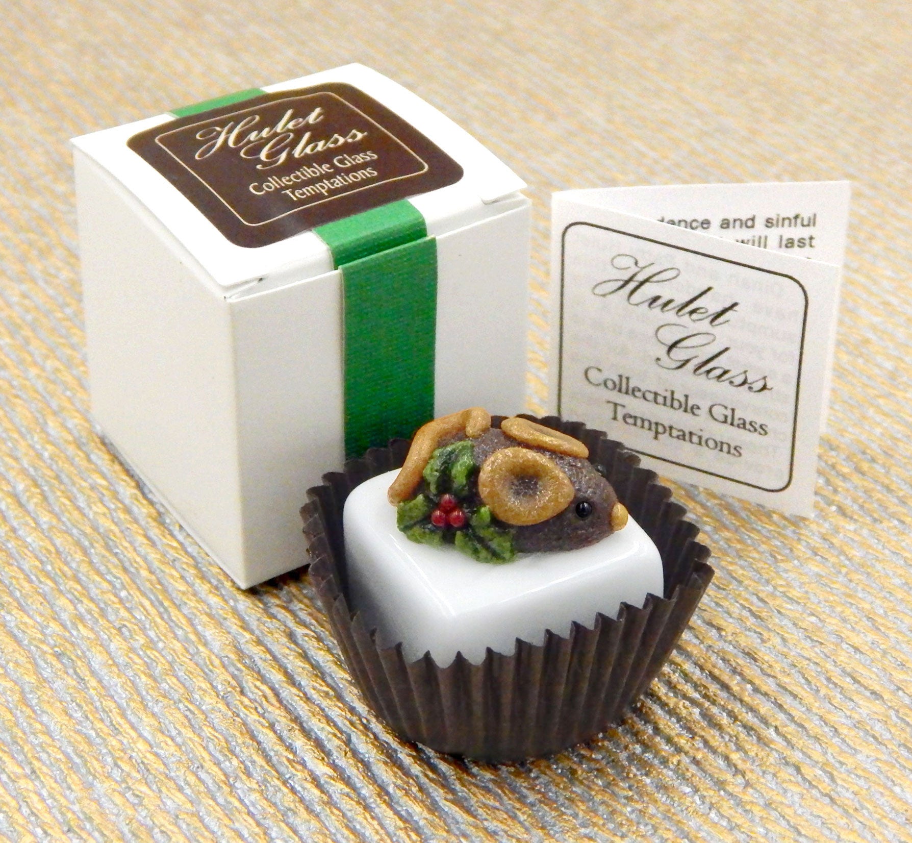 The glass chocolate measures 1" x 1" x 1.25" (slightly larger than an actual chocolate candy) and sits in a fluted glassine paper candy cup. The bottom of the chocolate is covered in felt to protect the surface it will sit upon. Each beautiful glass chocolate is signed (Hulet), dated and comes to you in a colorful gift box with an enclosure card telling a bit about the piece.