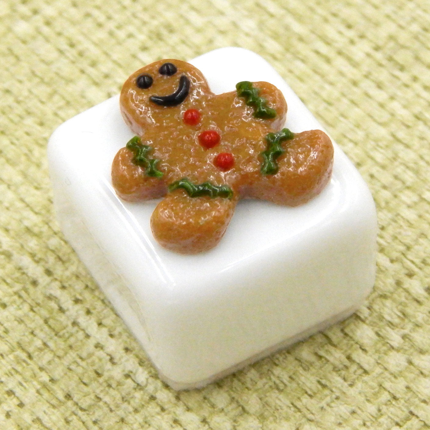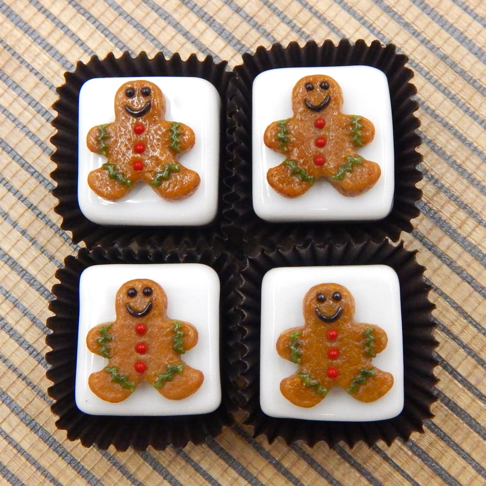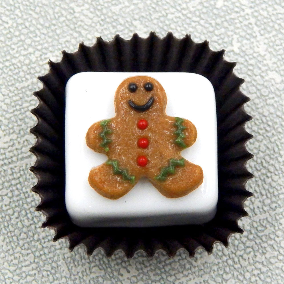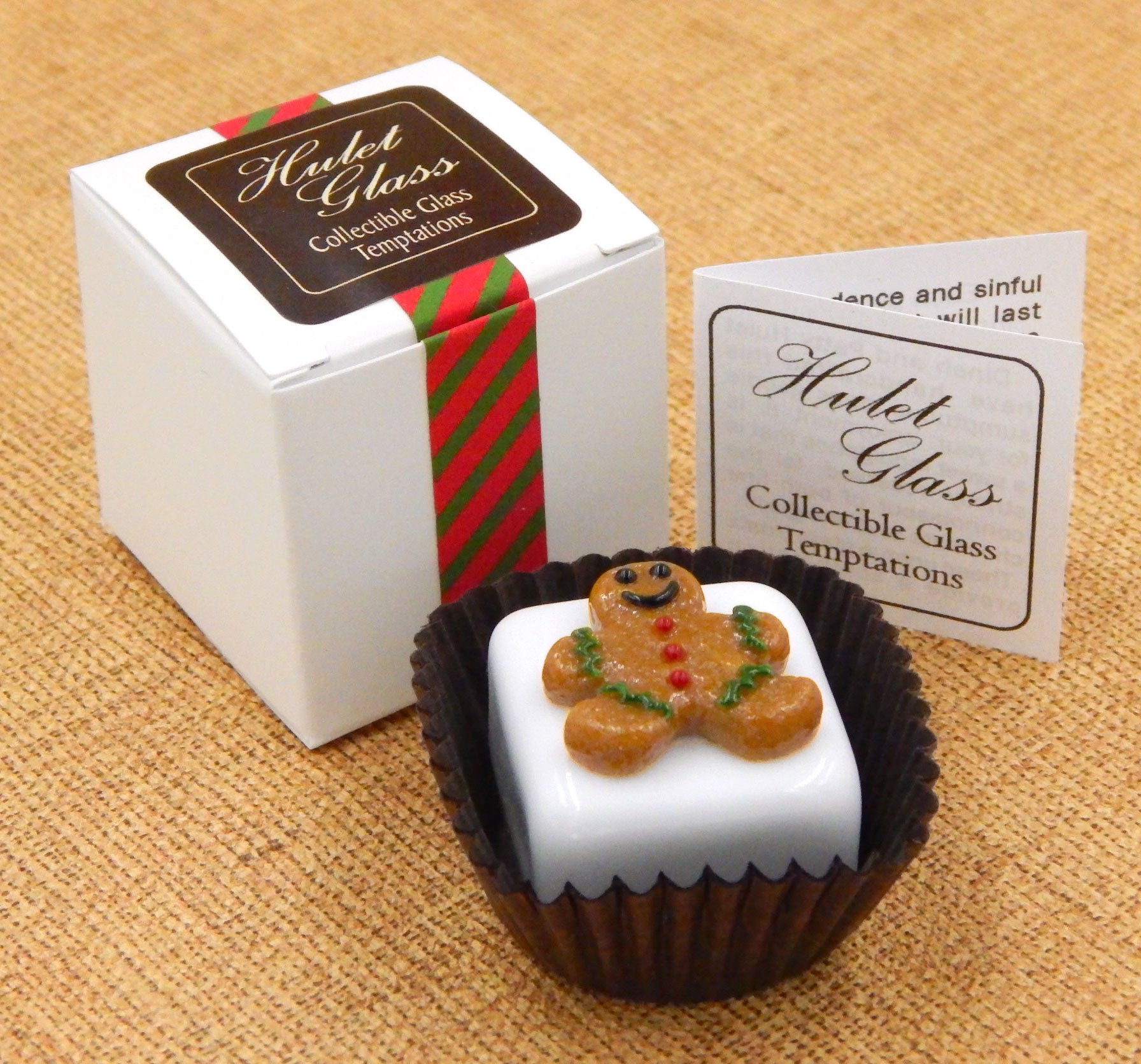 A handmade collectible solid glass white chocolate with a festive holiday gingerbread boy on top created from colorful glass utilizing ancient pate de verre and lampworking techniques. Meticulous attention to detail has gone into the construction of each of our pieces to enhance its appeal and collectibility.