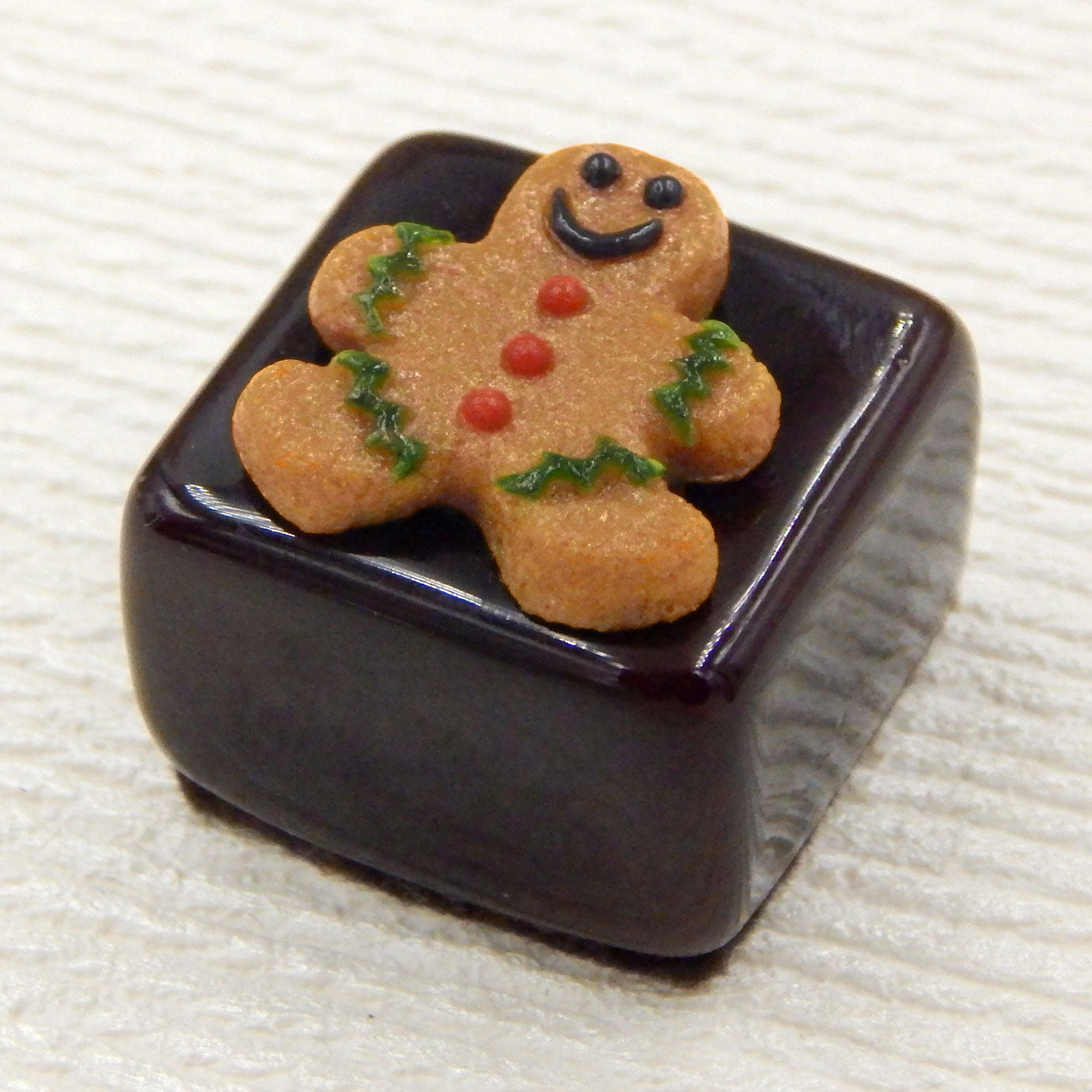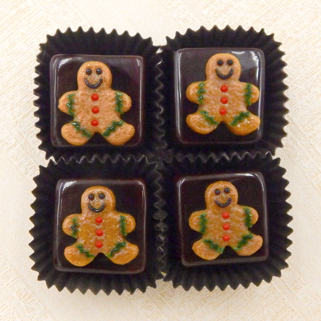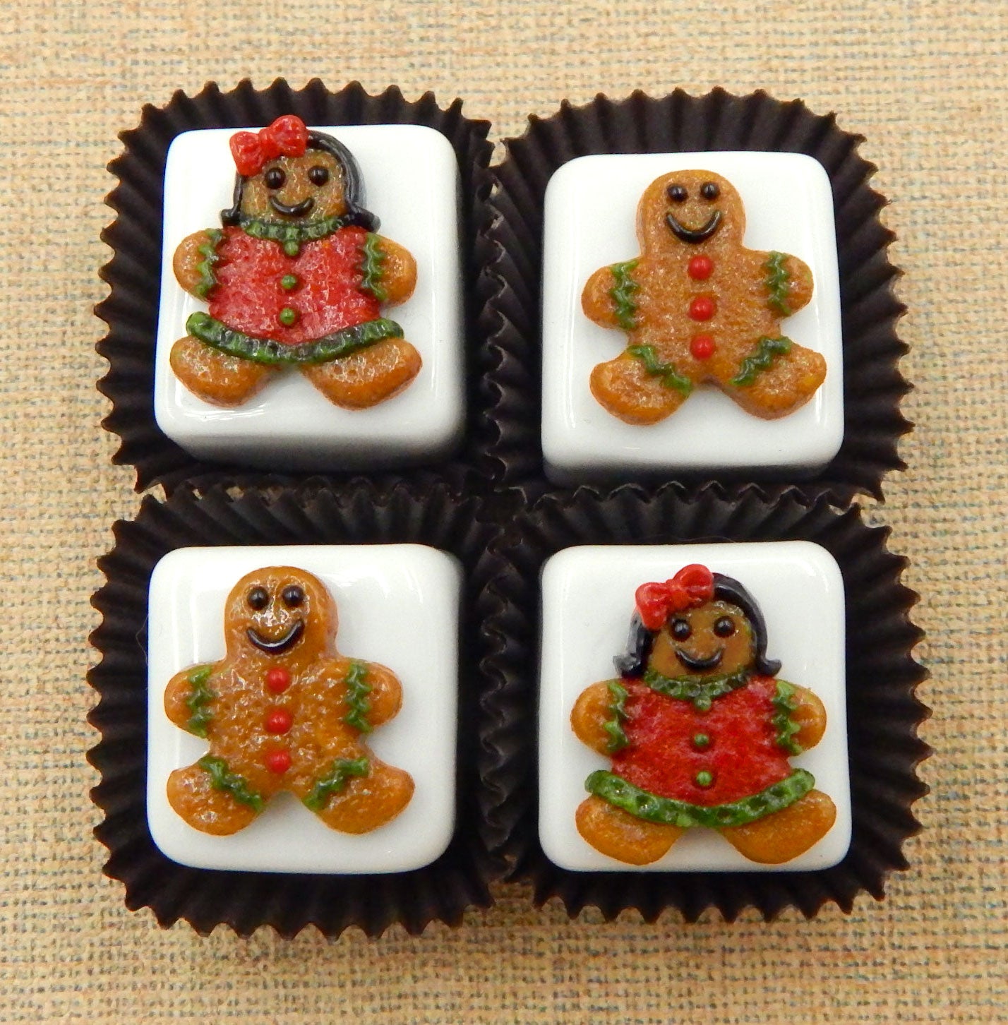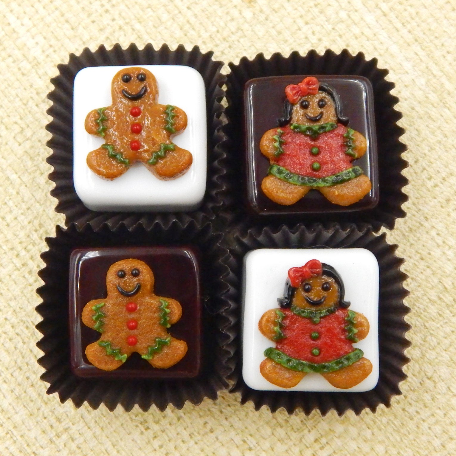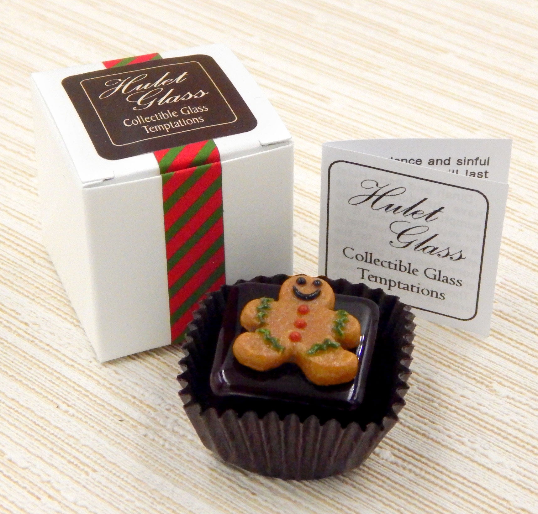 A handmade collectible solid glass chocolate with a festive holiday gingerbread boy on top created from colorful glass utilizing ancient pate de verre and lampworking techniques. Meticulous attention to detail has gone into the construction of each of our pieces to enhance its appeal and collectibility.