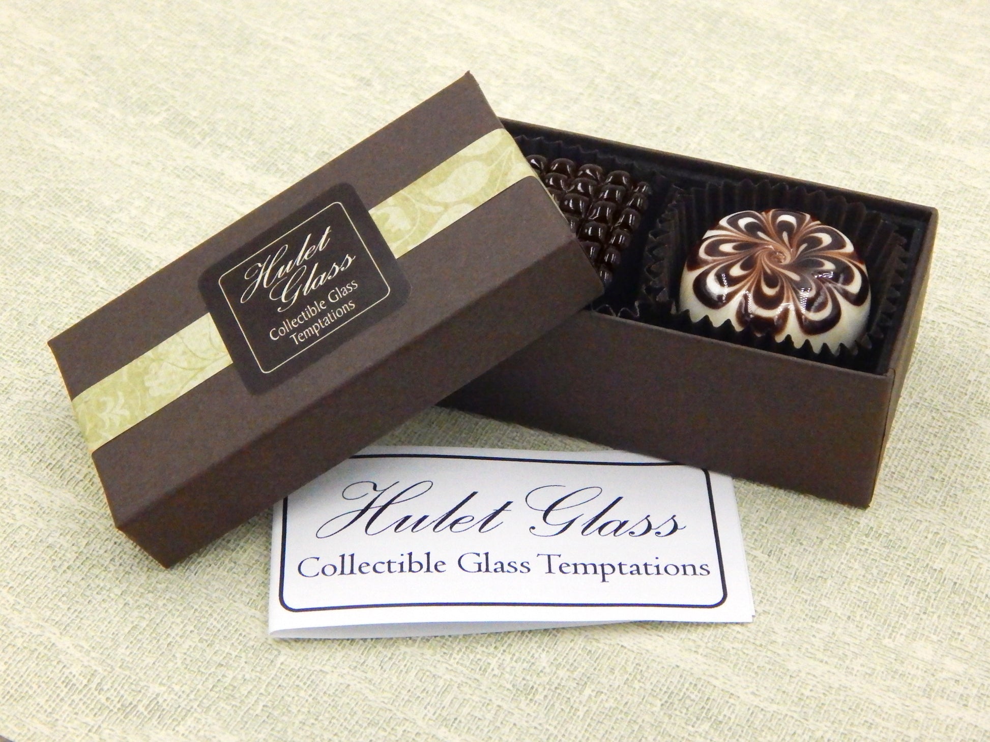 A handmade box of 2 collectible solid glass chocolates. The box is created by the Hulet sisters to frame the glass chocolates and securely protect them for years to come. The box is padded on all sides to cushion the glass candies inside. Meticulous attention to detail has gone into the construction of each of our creations to enhance its appeal and collectibility.