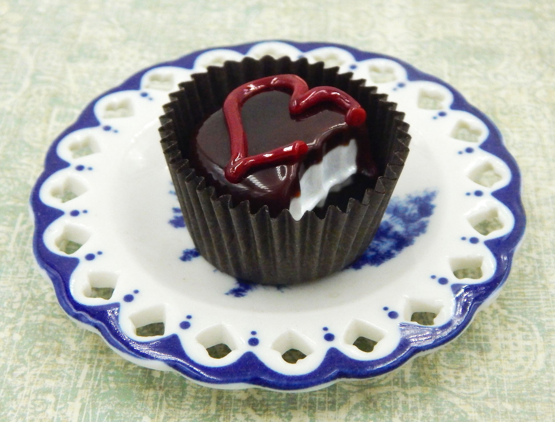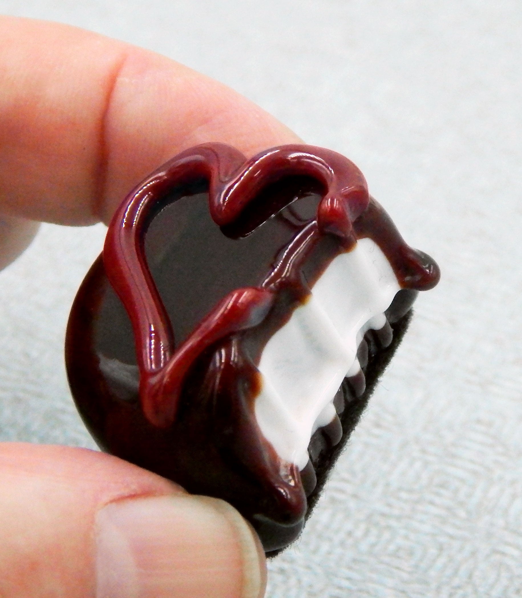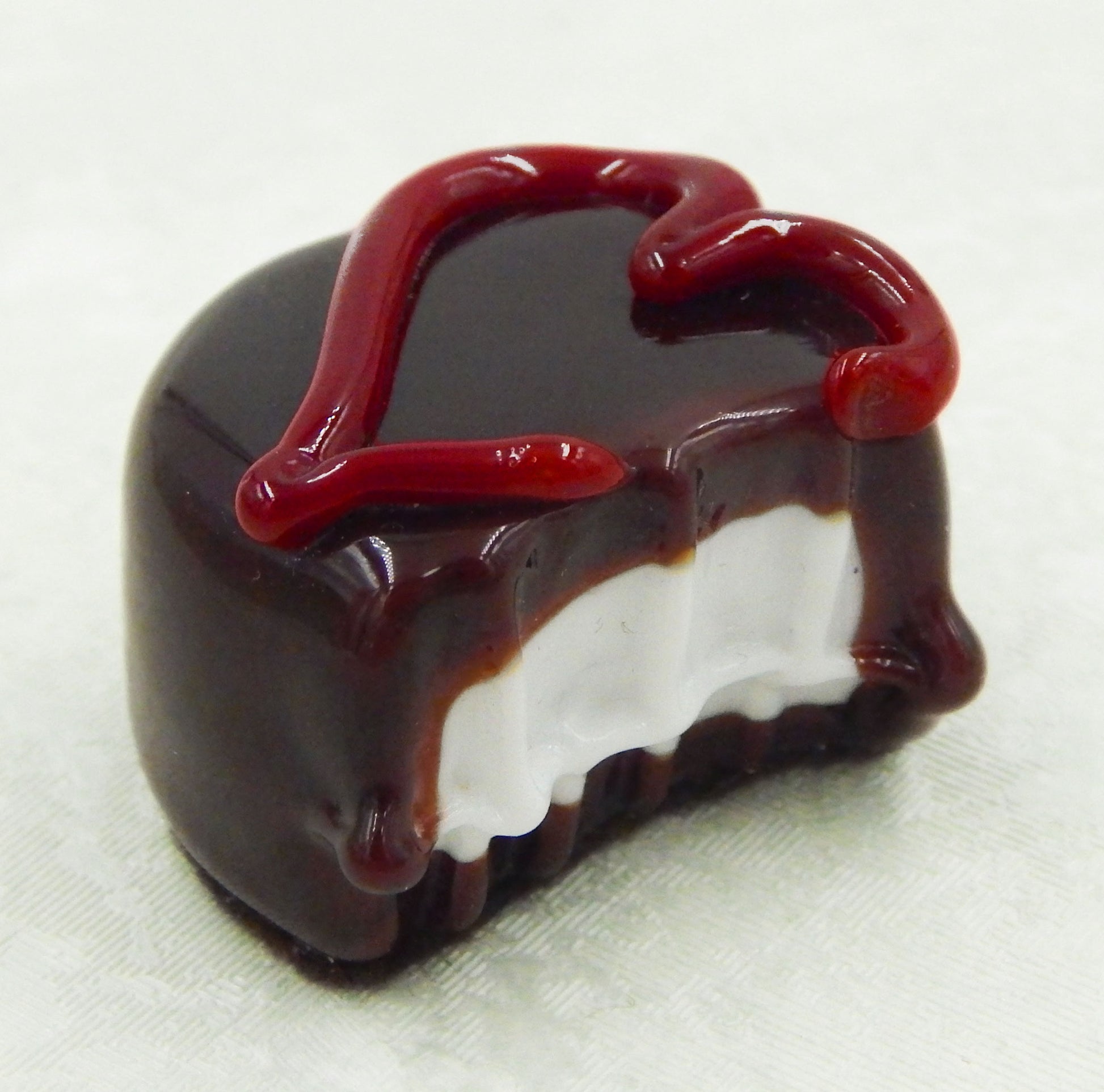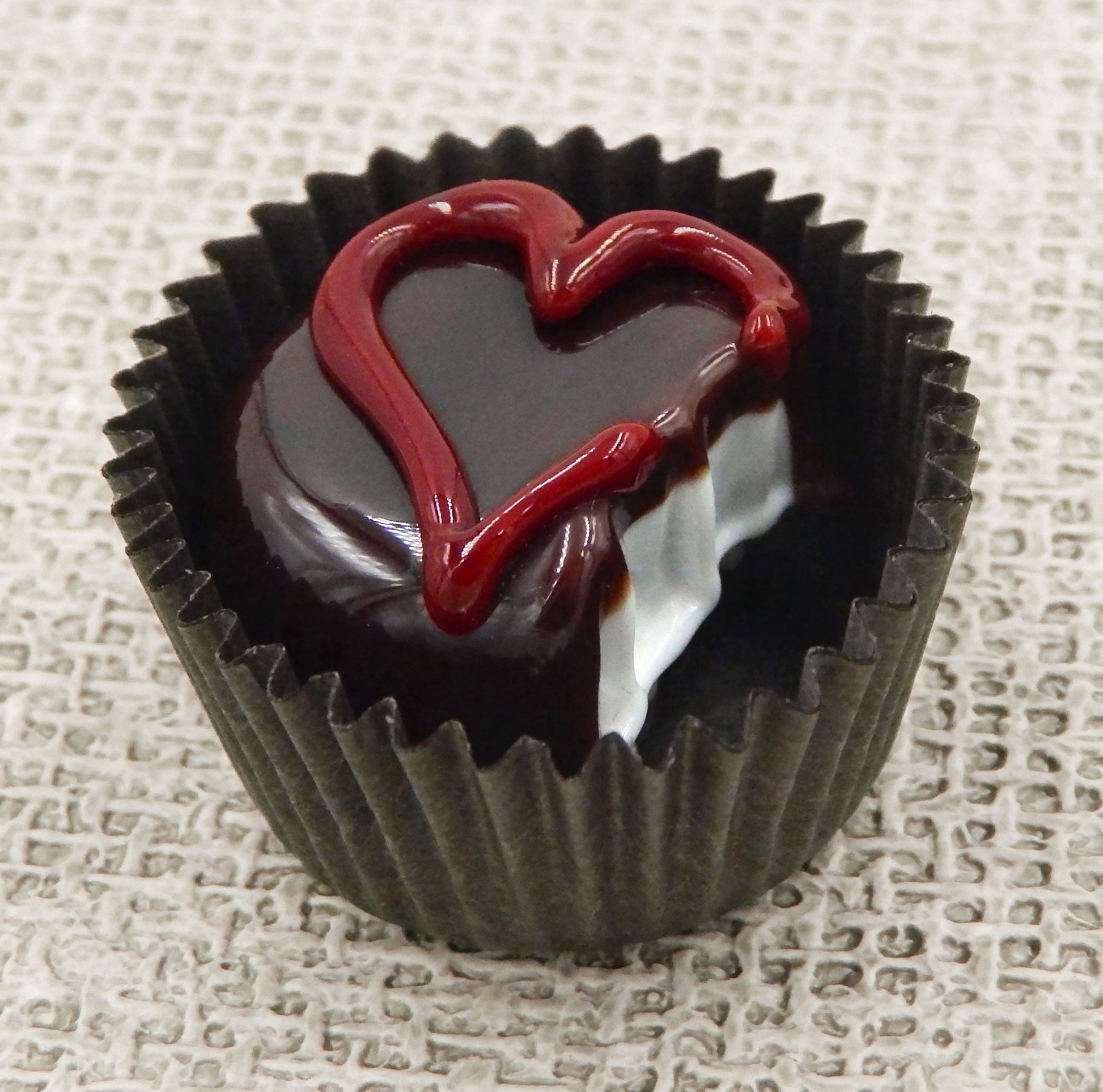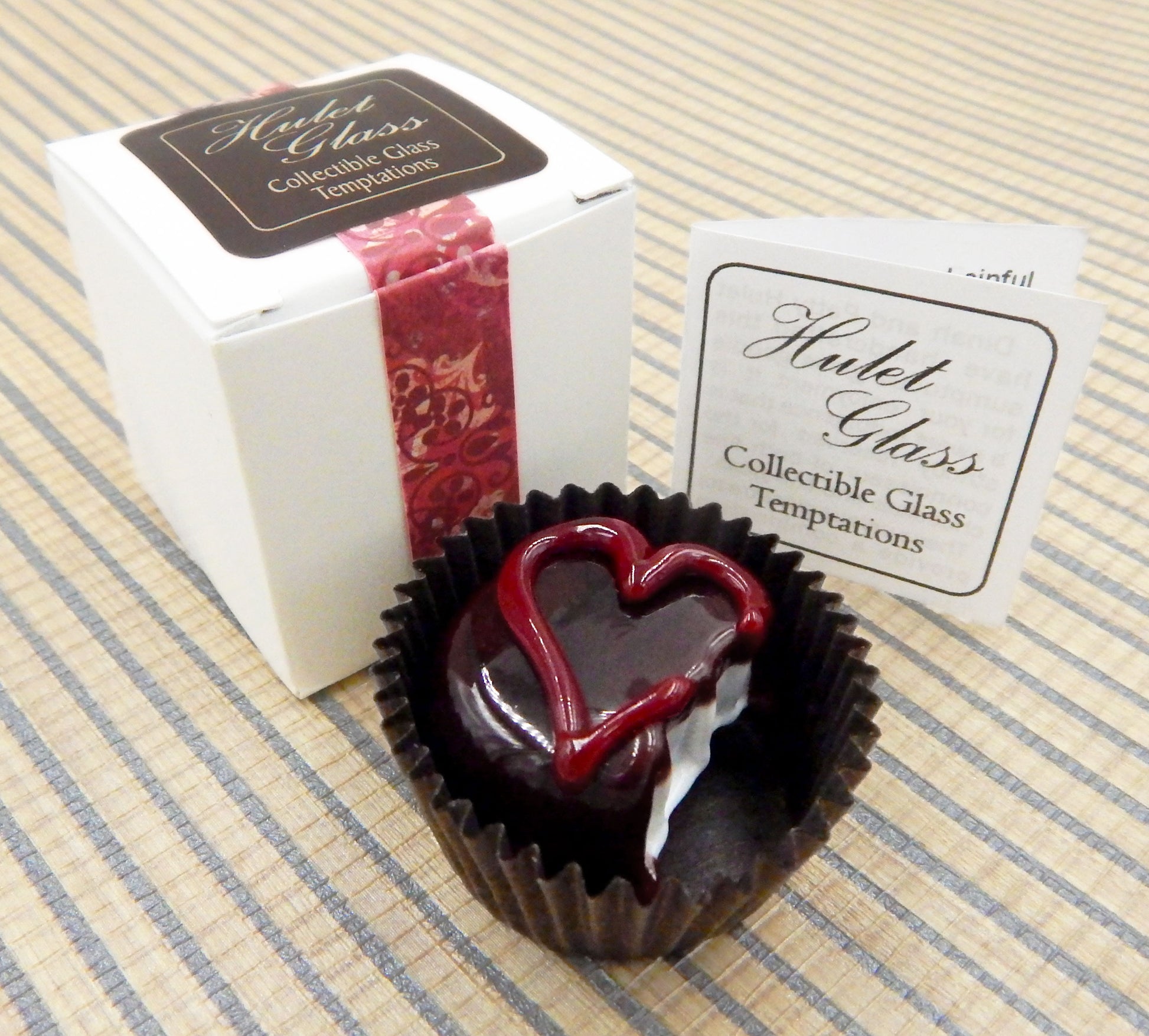 A handmade collectible solid glass chocolate with a dark cherry red heart on top created from colorful glass utilizing flameworking techniques. Meticulous attention to detail has gone into the construction of each of our pieces to enhance its appeal and collectibility.