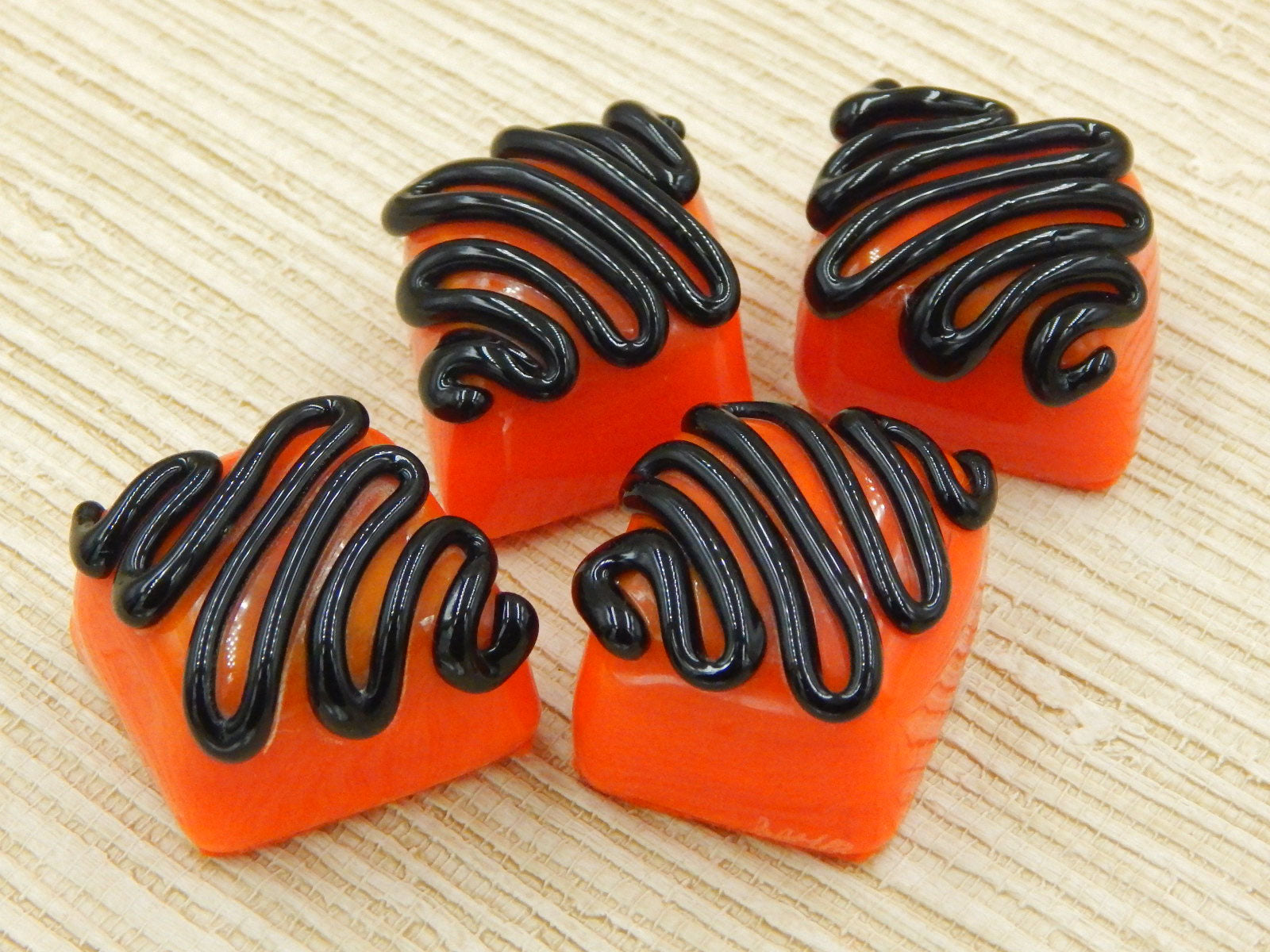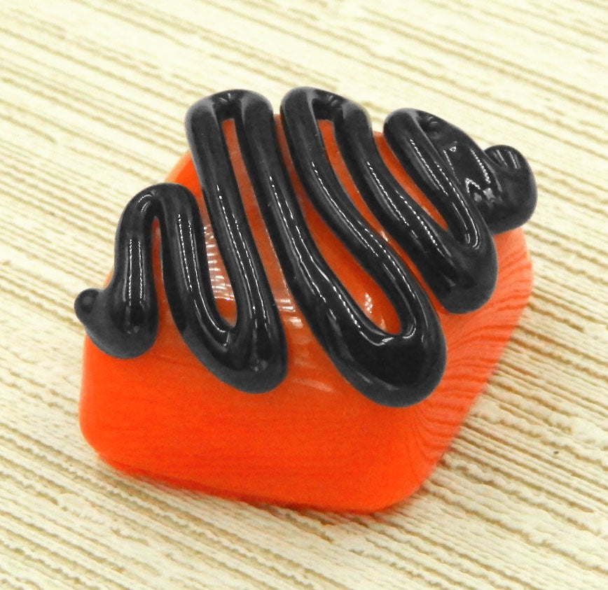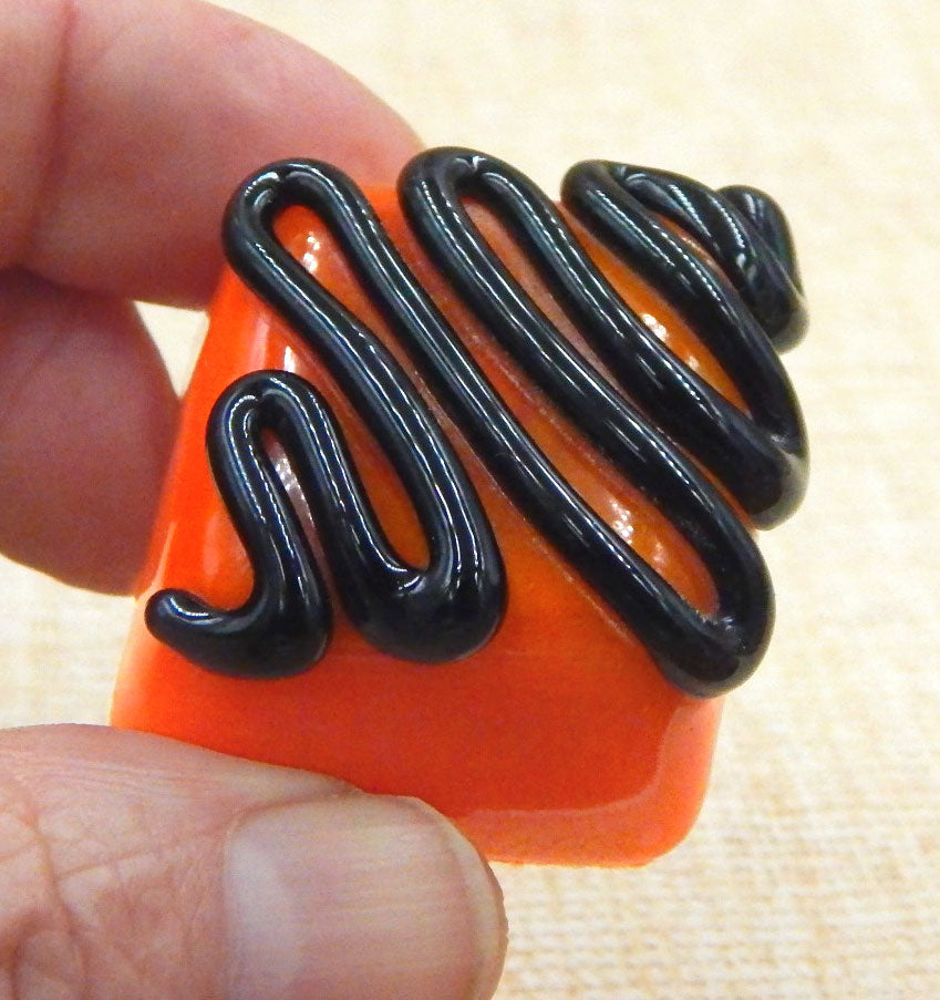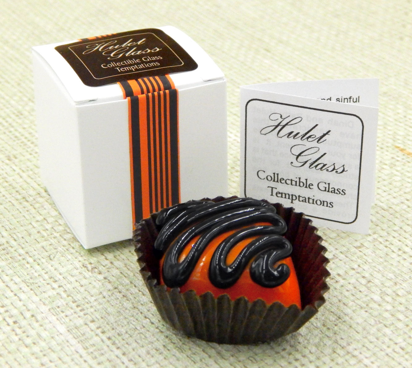 A handmade collectible solid glass orange chocolate with a juicy fat ribbon of licorice on top created from colorful glass. Meticulous attention to detail has gone into the construction of each of our pieces to enhance its appeal and collectibility.