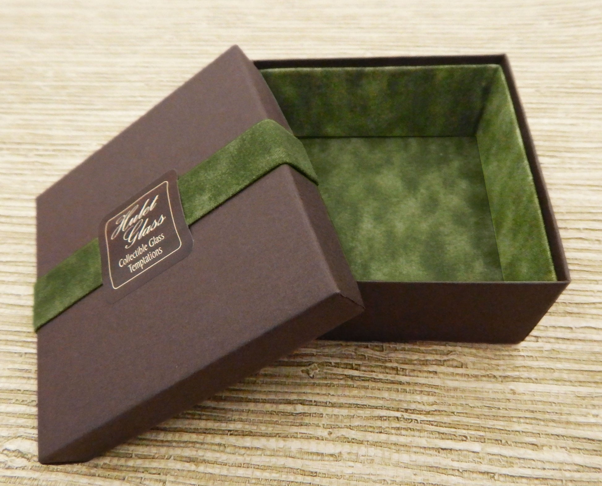 This small box holds 4 to 6 of our glass chocolates and measures 3.75" x 3.75" x 1.5". It is constructed of deep brown rigid double-wall paperboard with a matte finish. It is lined with 100% cotton fabric that is deep olive green in color.