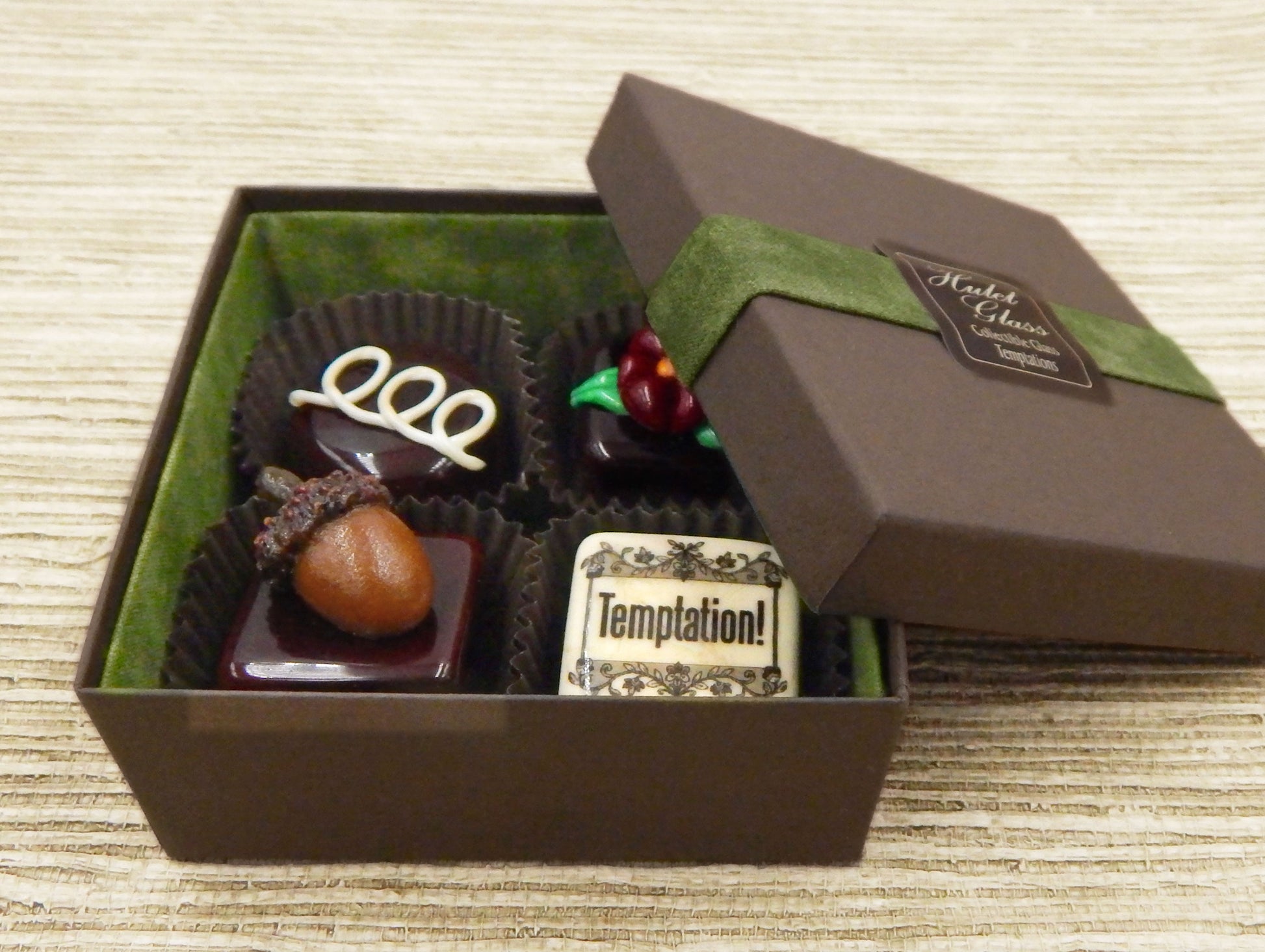 A handmade display box that will hold 4 to 6 of our art glass chocolate candies (depending on the size and shape of the chocolates). These boxes are especially designed for storing and displaying your Hulet Glass chocolate collection.