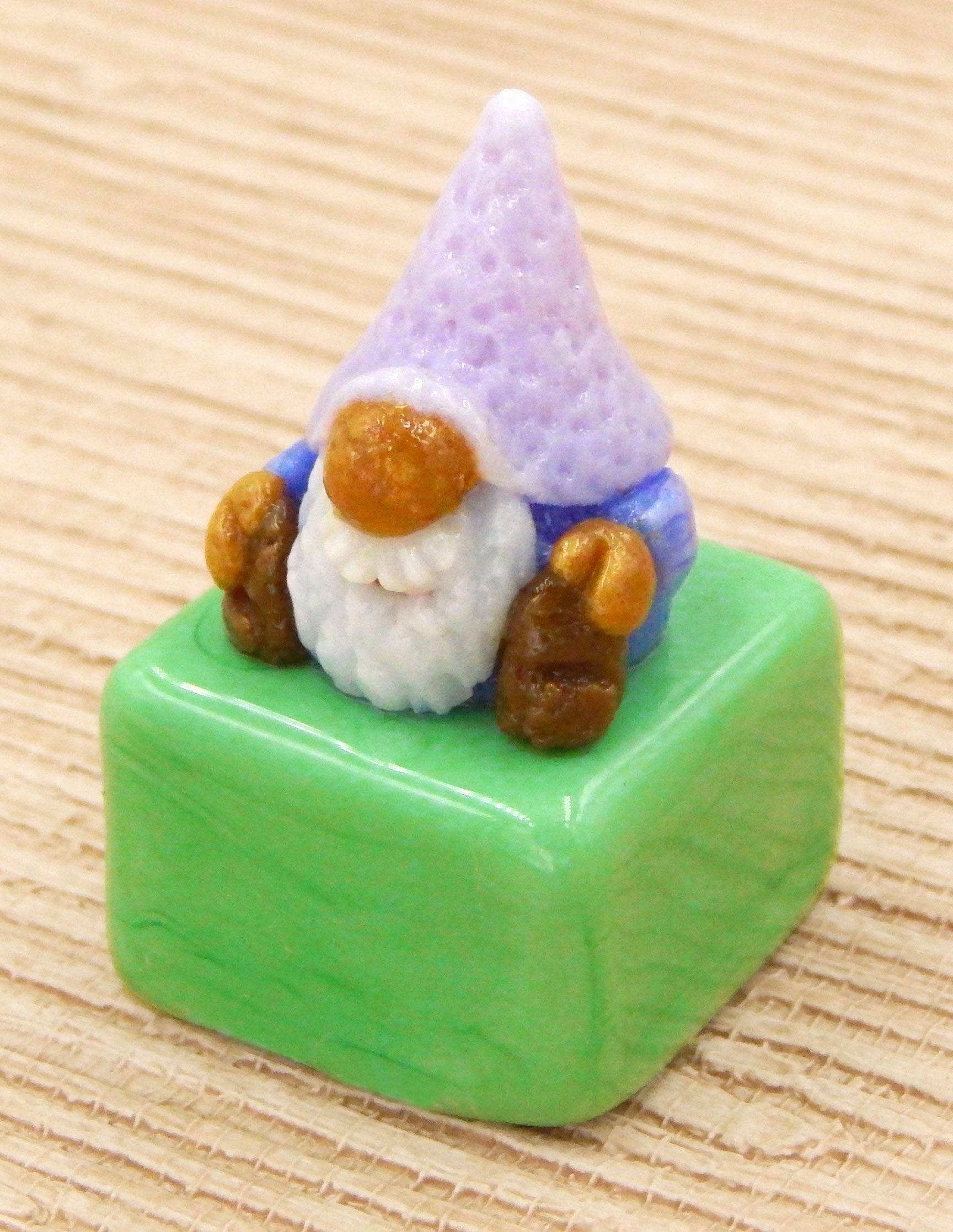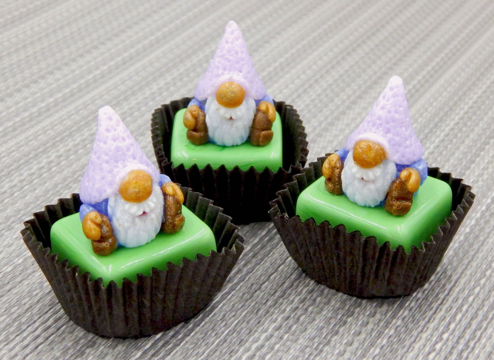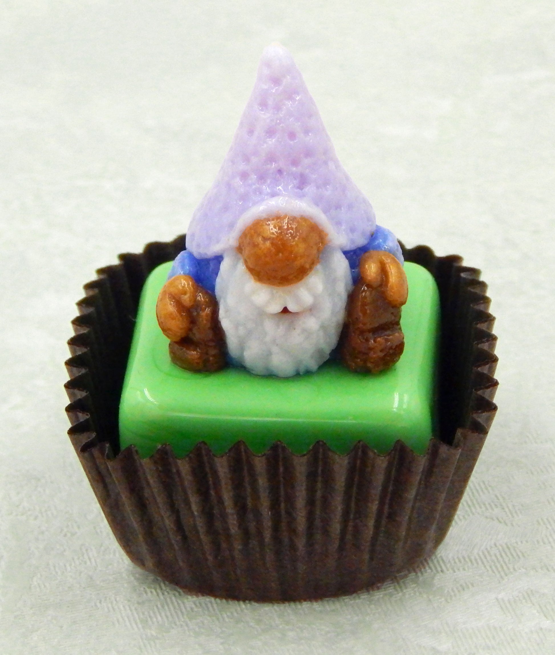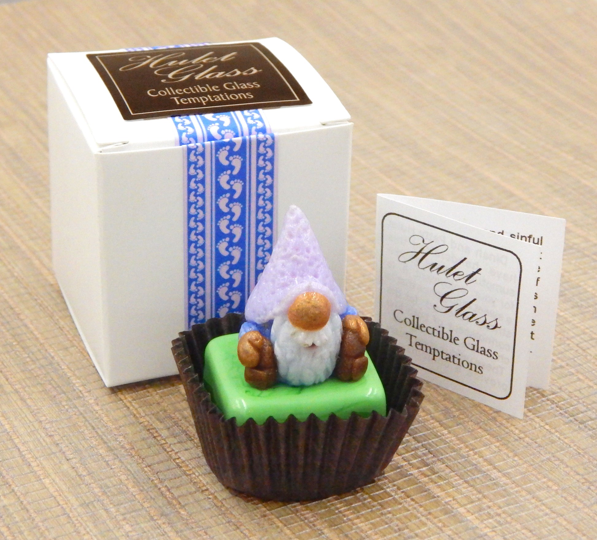 A handmade collectible solid glass mint petit four chocolate with a diminutive gnome on top created from colorful glass utilizing ancient pate de verre and lampworking techniques. Meticulous attention to detail has gone into the construction of each of our pieces to enhance its appeal and collectibility.