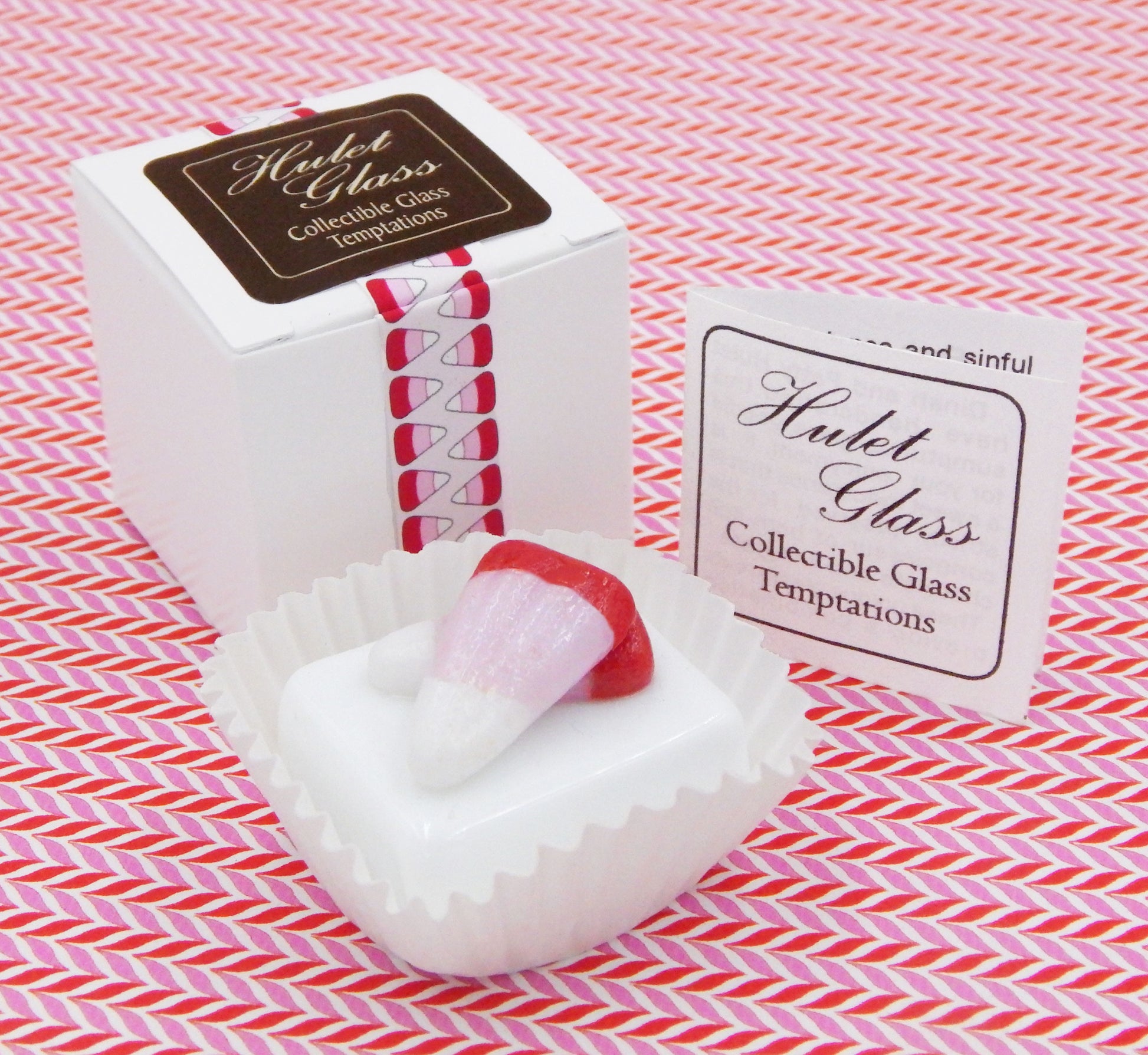 The glass chocolate measures 1.5" x 1.25" x 1" (slightly larger than an actual chocolate candy) and sits in a fluted glassine paper candy cup. The bottom of the chocolate is covered in felt to protect the surface it will sit upon. Each beautiful glass chocolate is signed (Hulet), dated and comes to you in a colorful gift box with an enclosure card telling a bit about the piece.