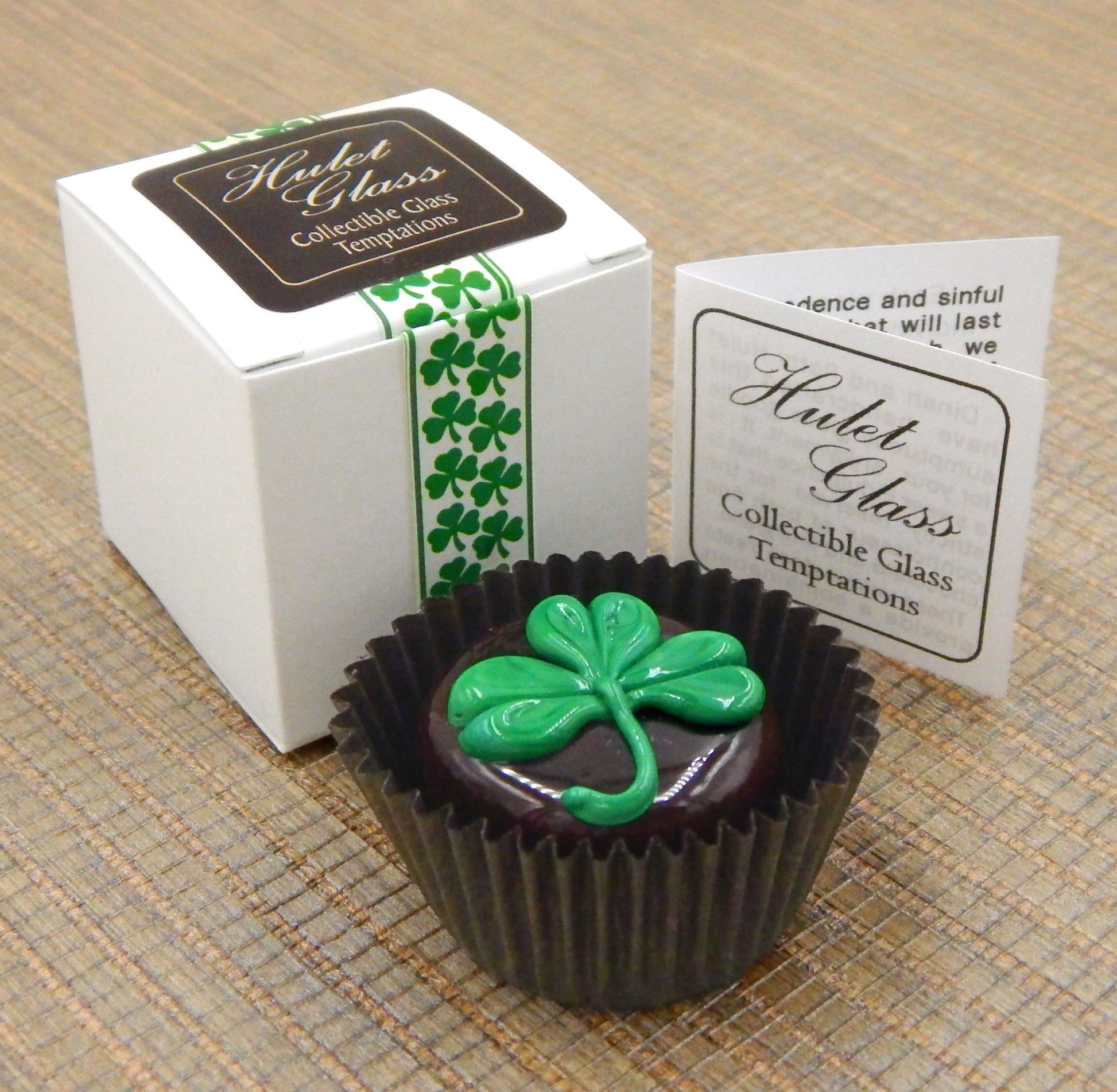 A handmade collectible solid glass chocolate with a creamy St. Patrick's Day Shamrock on top created from colorful glass utilizing ancient lampworking techniques. Meticulous attention to detail has gone into the construction of each of our pieces to enhance its appeal and collectibility.