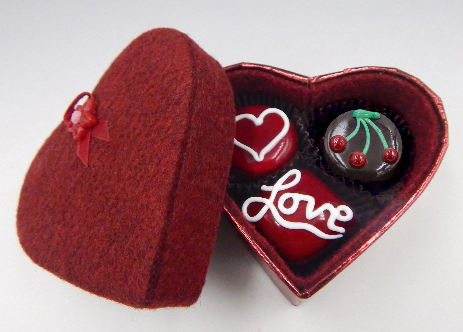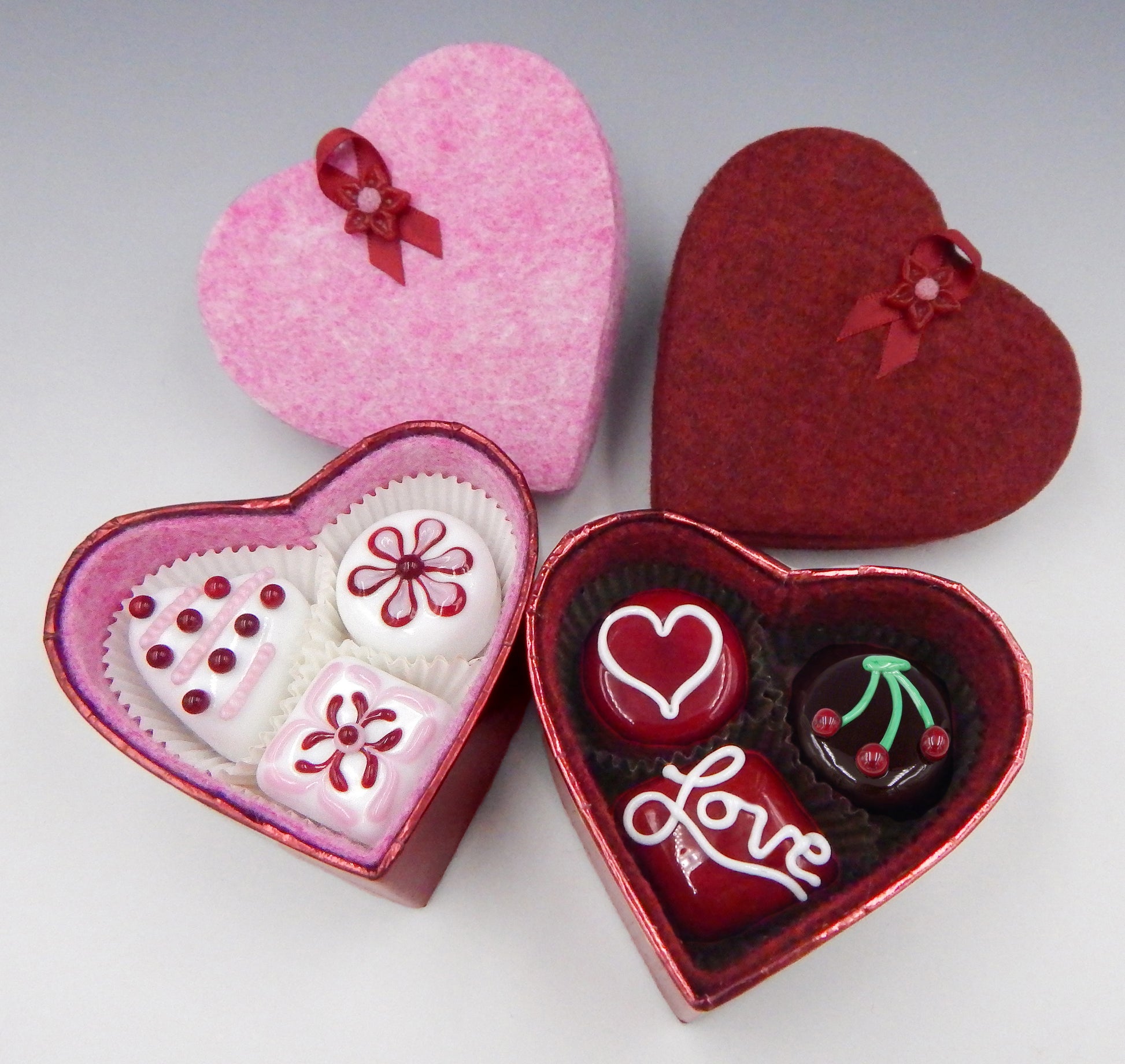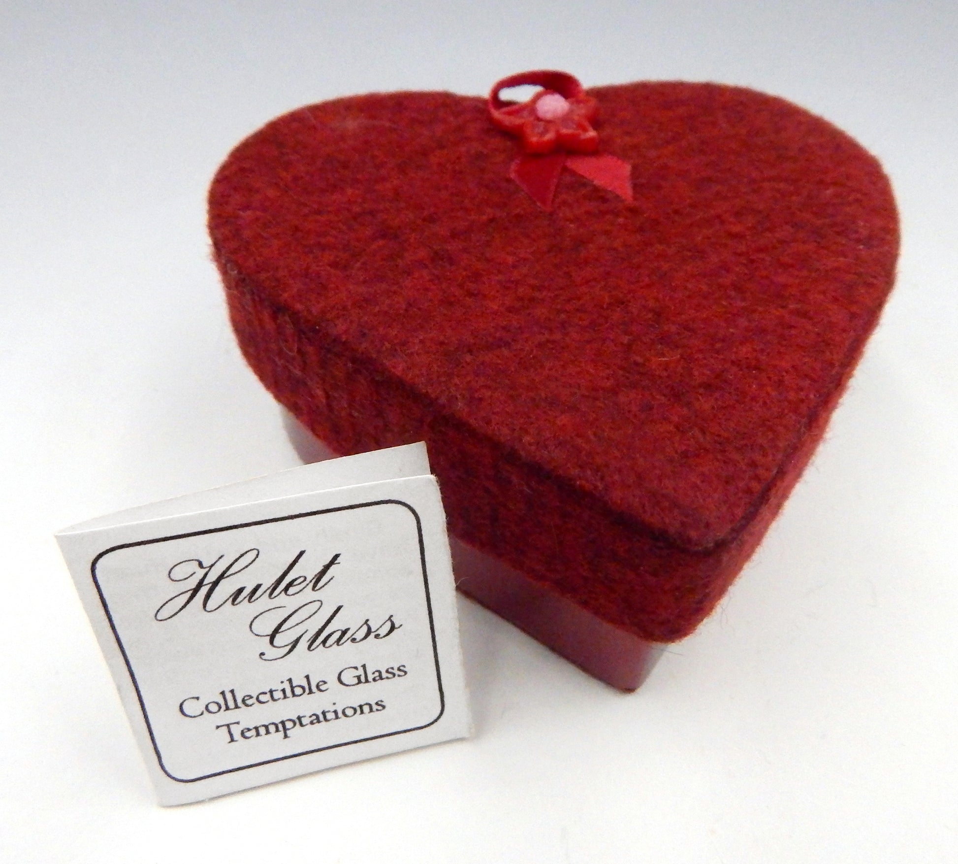 This heart-shaped box contains 3 unique solid art glass chocolates, each handcrafted by Hulet Glass with meticulous care.