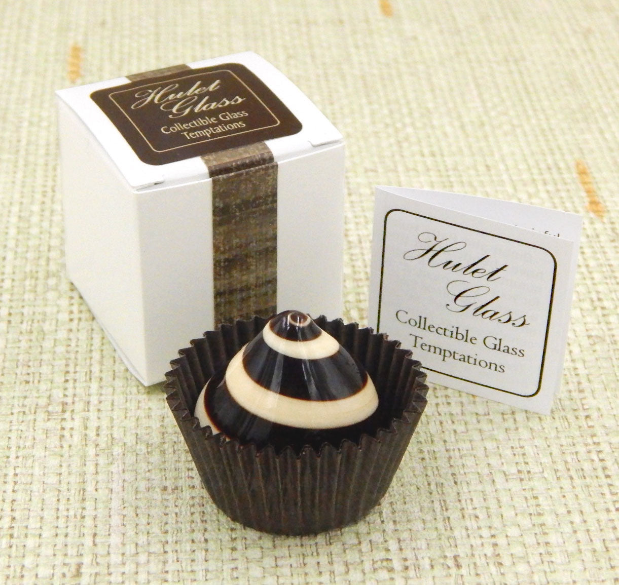 The glass chocolate measures 1.25" x 1.25" x 1" (slightly larger than an actual chocolate candy) and sits in a fluted glassine paper candy cup. The bottom of the chocolate is covered in felt to protect the surface it will sit upon. Each beautiful glass chocolate is signed (Hulet), dated and comes to you in a colorful gift box with an enclosure card telling a bit about the piece.