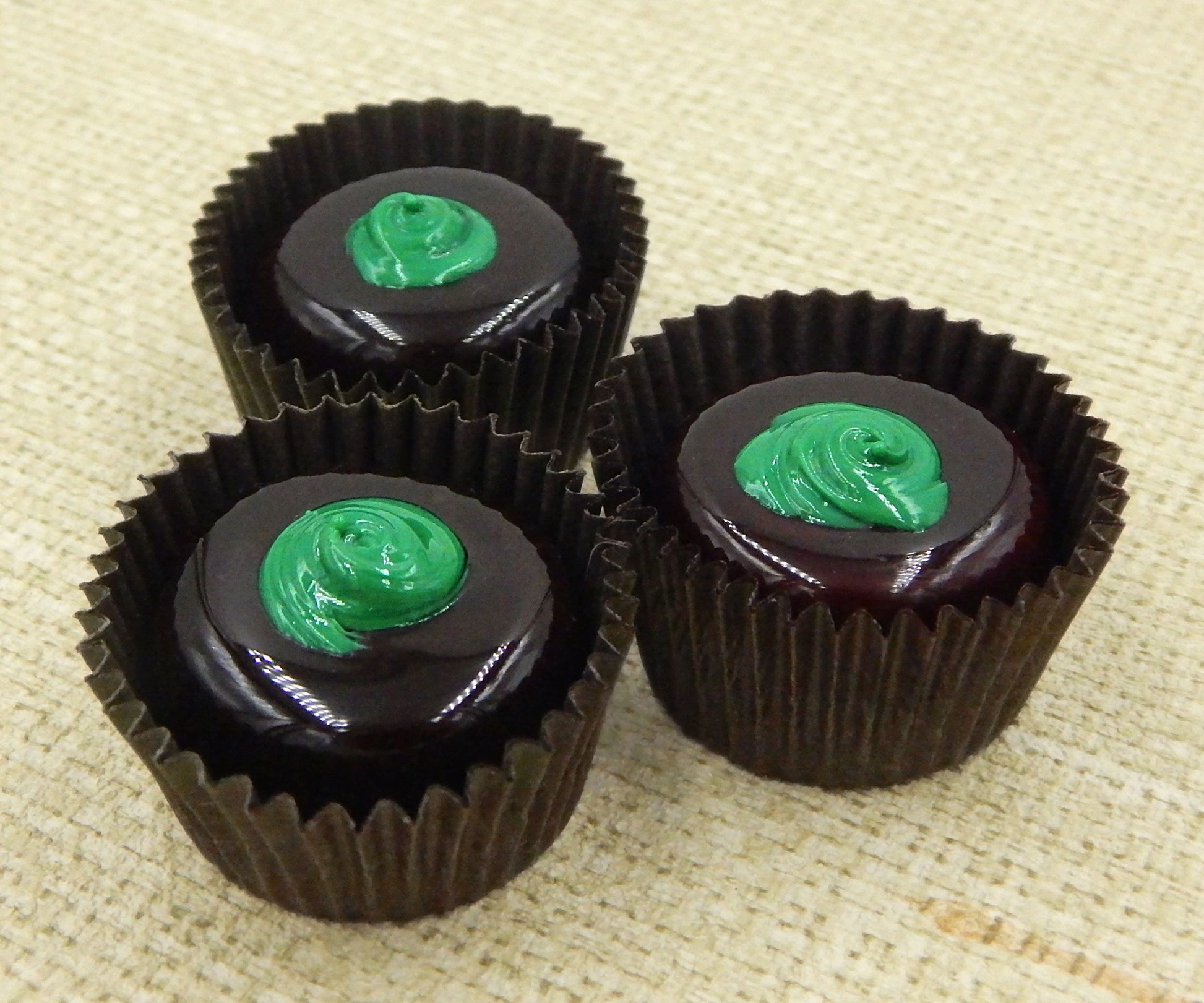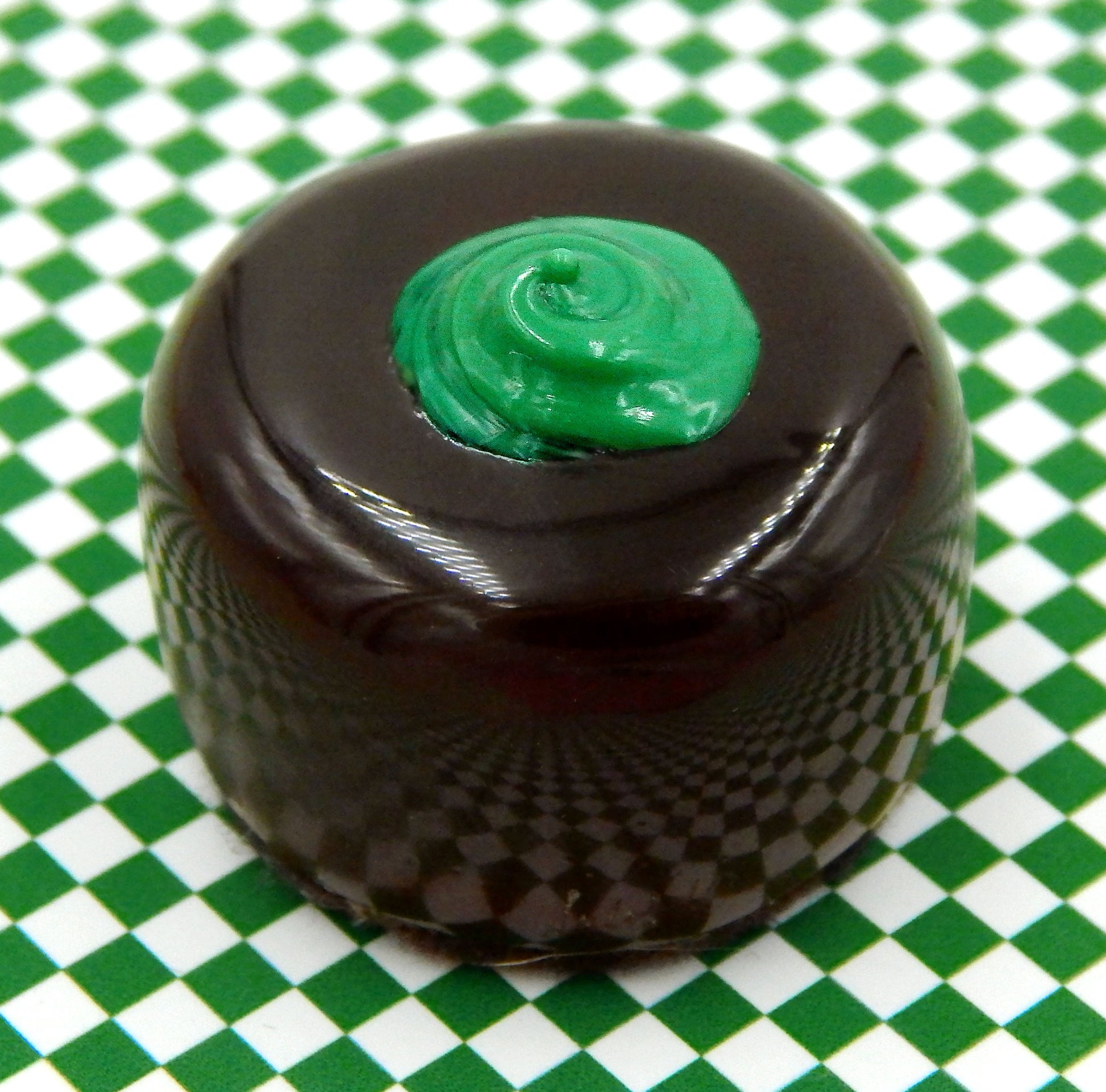 A handmade collectible solid glass chocolate with a creamy wintergreen dollop on top created from colorful glass utilizing flameworking techniques. Meticulous attention to detail has gone into the construction of each of our pieces to enhance its appeal and collectibility.