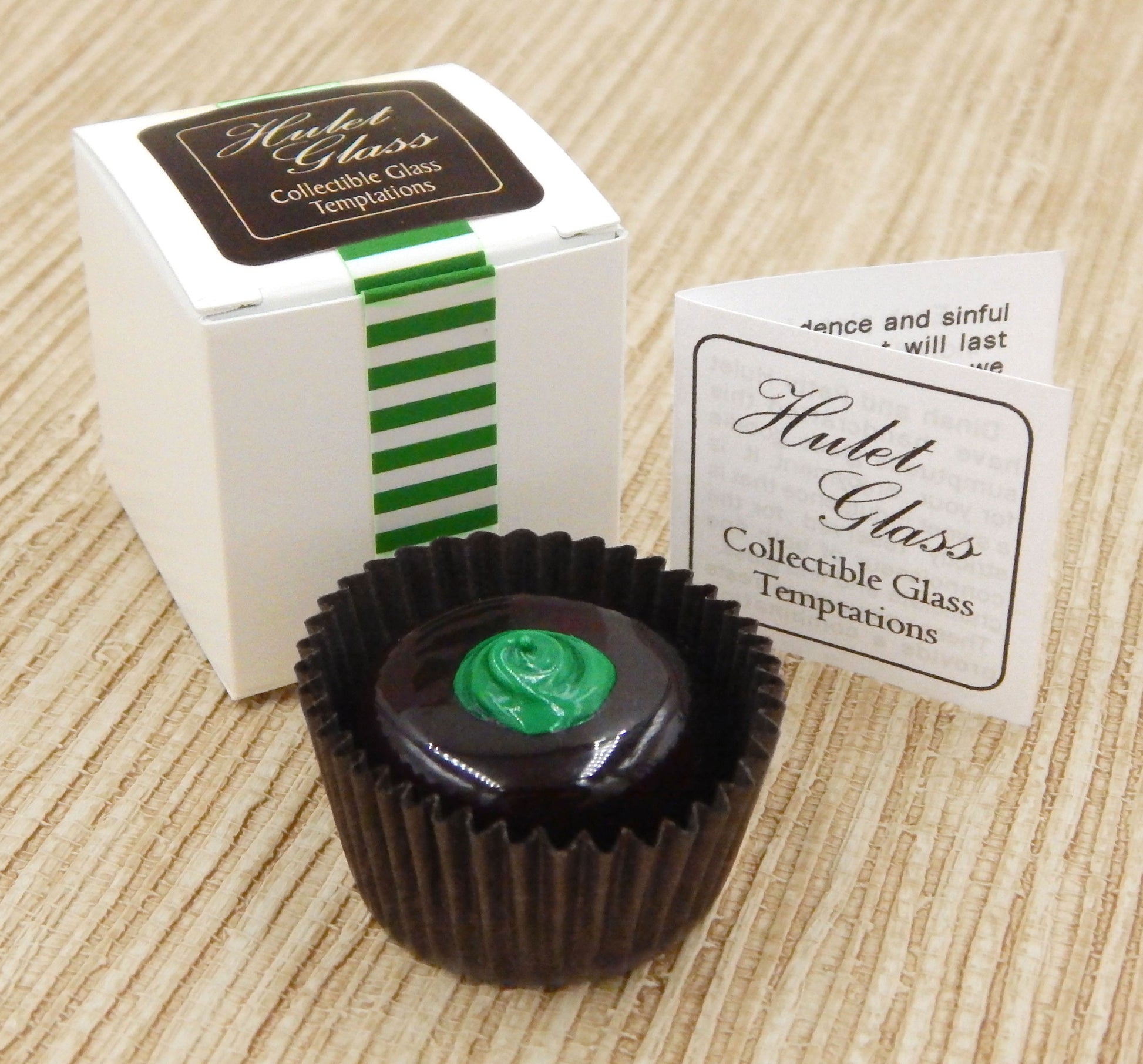 The glass chocolate measures approximately 1.25" x .75" (slightly larger than an actual chocolate candy) and sits in a fluted glassine paper candy cup. The bottom of the chocolate is covered in felt to protect the surface it will sit upon. Each beautiful glass chocolate is signed (Hulet), dated and comes to you in a colorful gift box with an enclosure card telling a bit about the piece.
