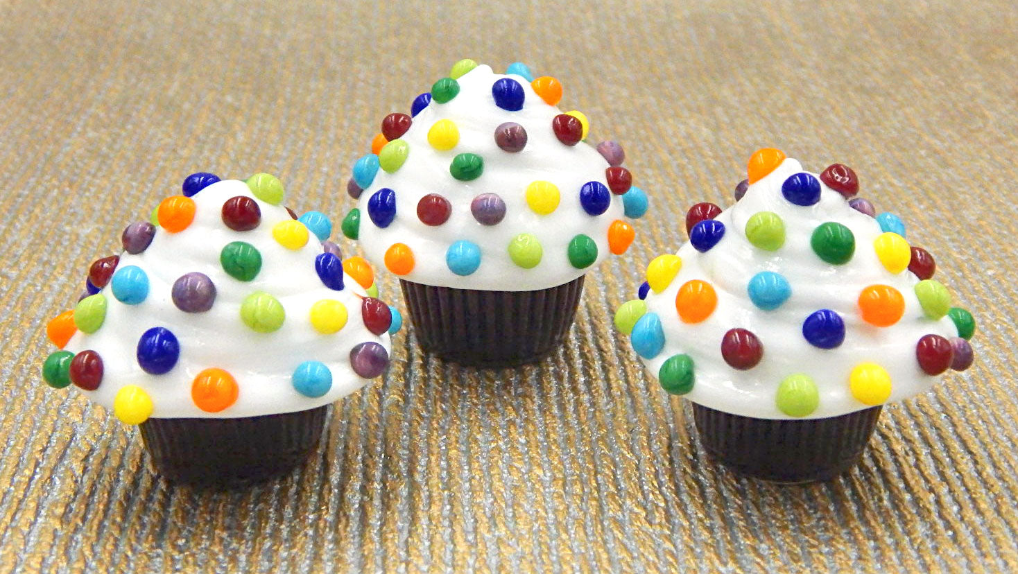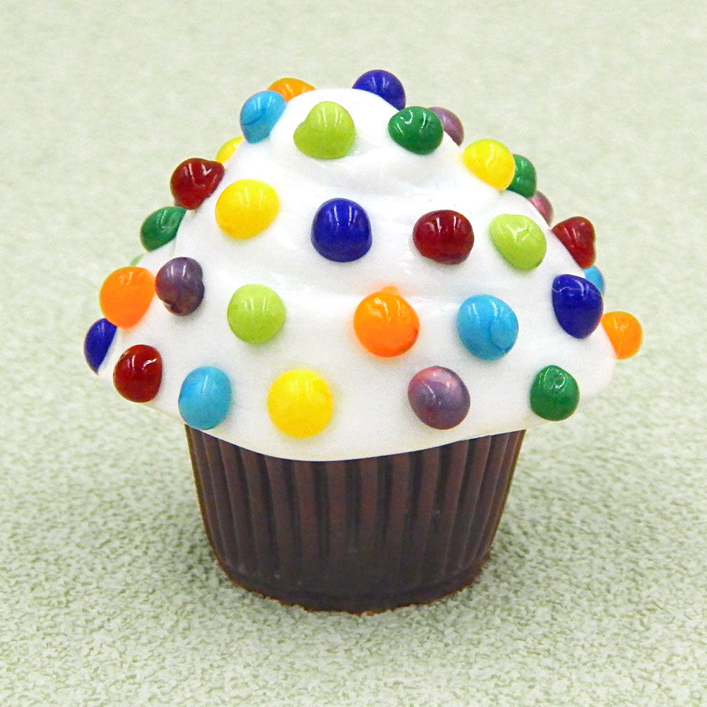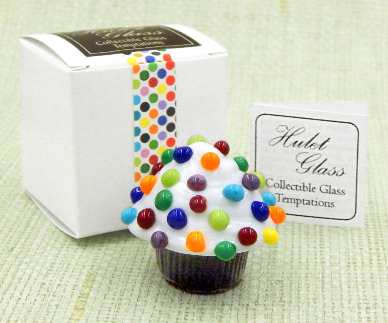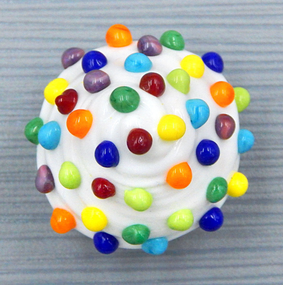 A handmade collectible solid glass Mini Candy Dots Cupcake Truffle created from colorful glass utilizing flameworking techniques. Meticulous attention to detail has gone into the construction of each of our pieces to enhance its appeal and collectibility.