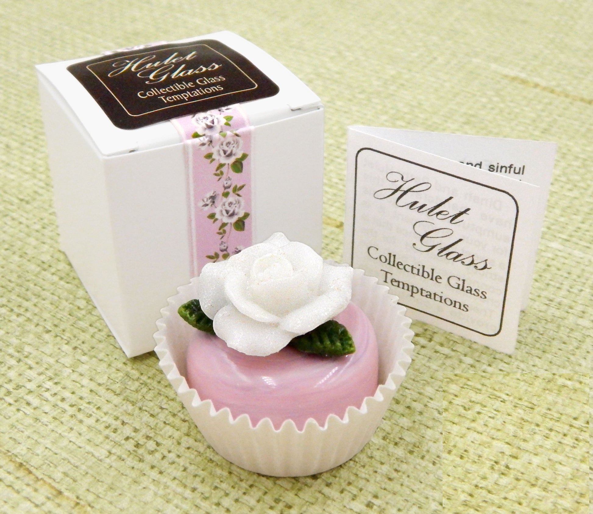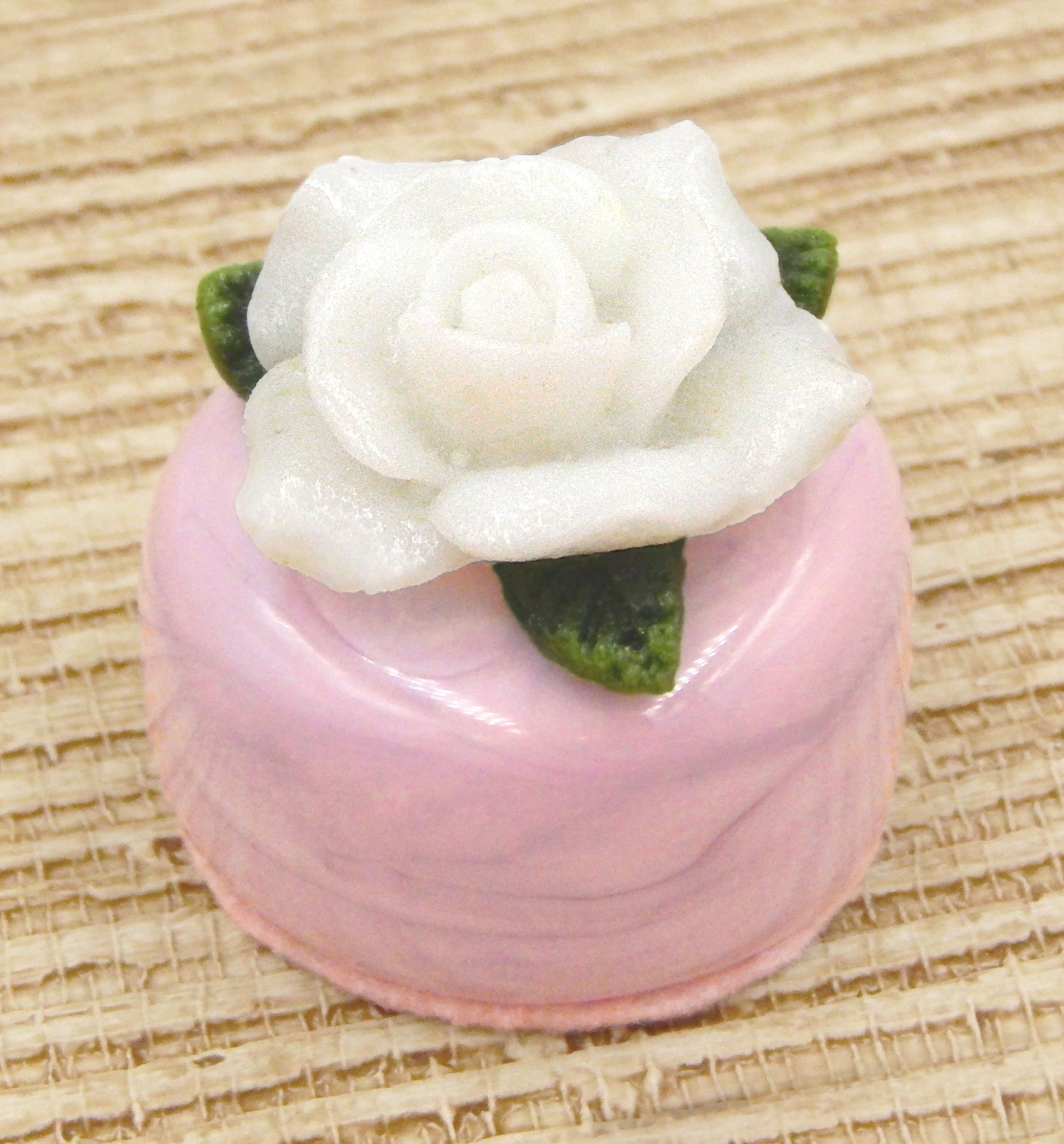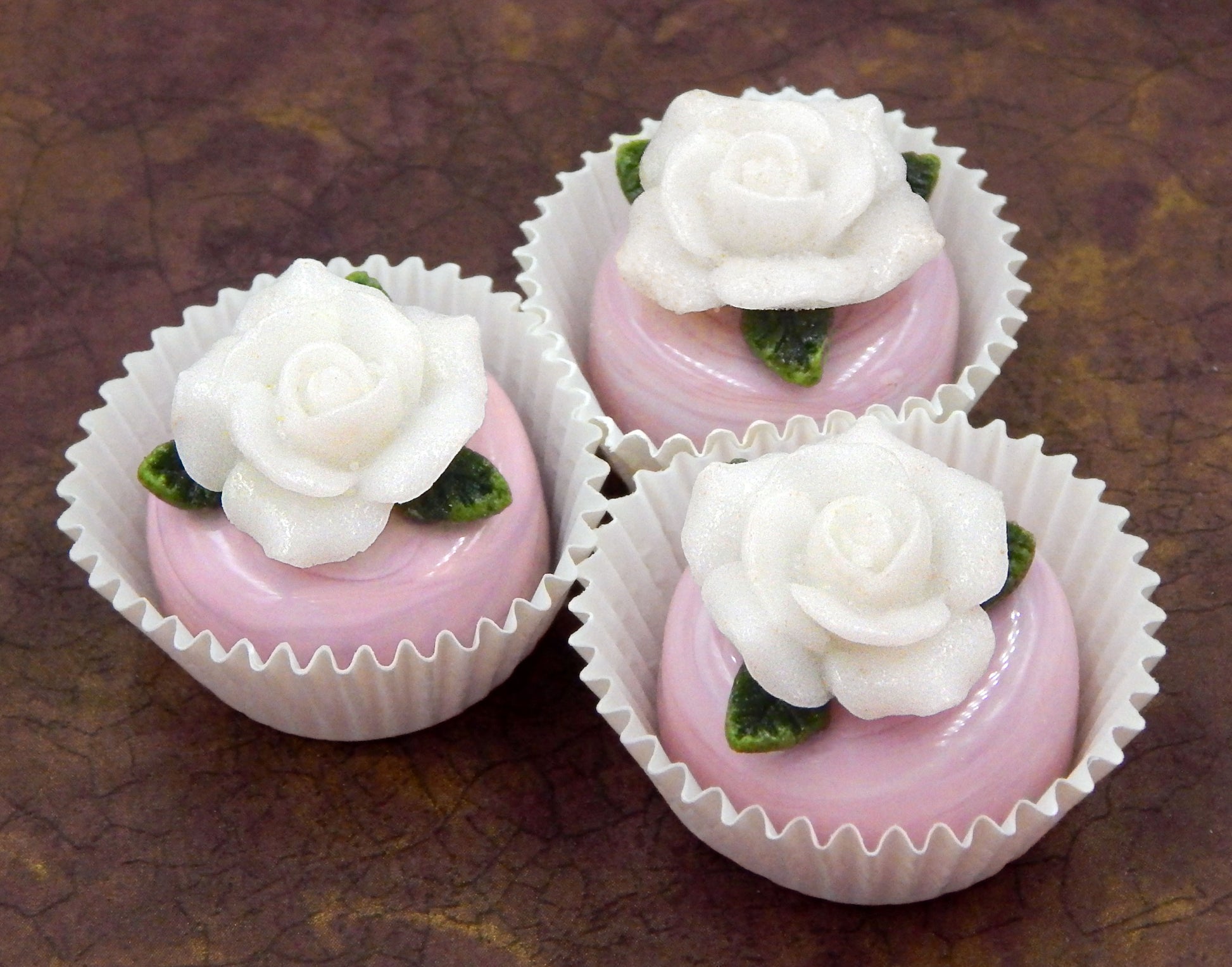 A handmade collectible solid glass strawberry pink petit four chocolate with a beautiful white rose on top created from colorful glass utilizing ancient pate de verre and lampworking techniques. Meticulous attention to detail has gone into the construction of each of our pieces to enhance its appeal and collectibility.
