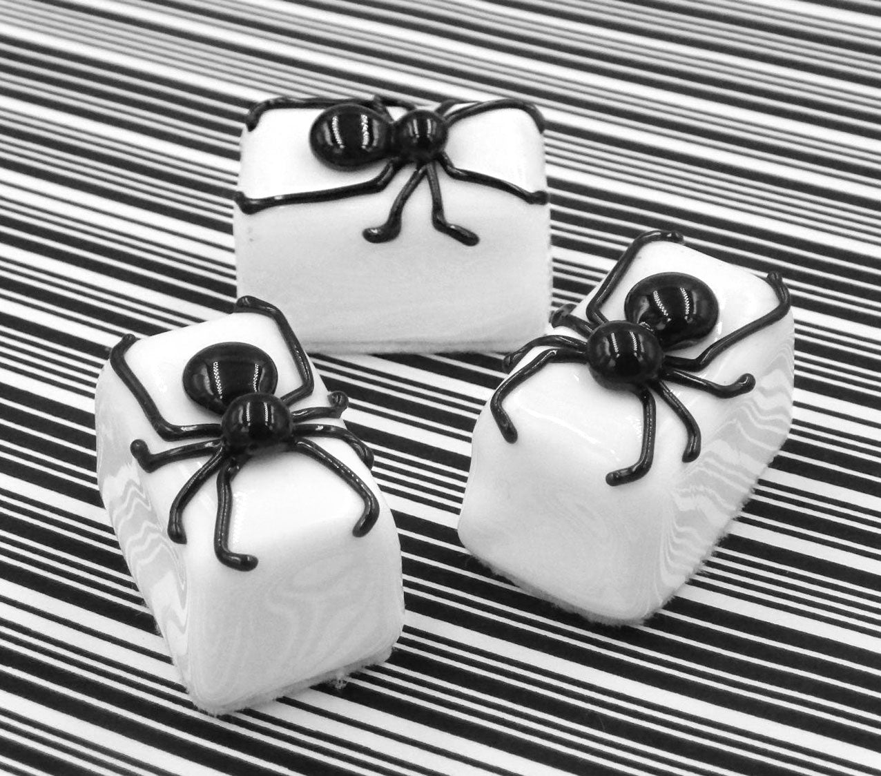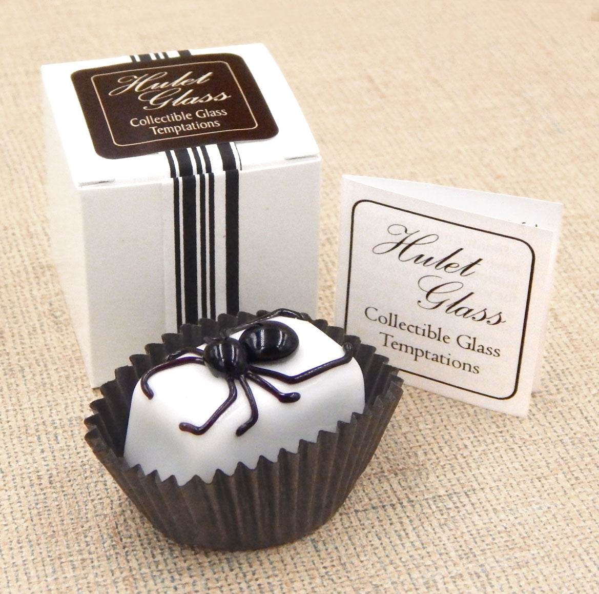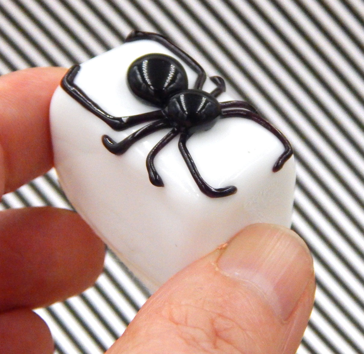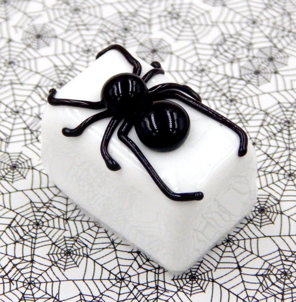 A handmade collectible solid glass white chocolate with a black spider on top created from colorful glass utilizing flameworking techniques. Meticulous attention to detail has gone into the construction of each of our pieces to enhance its appeal and collectibility.