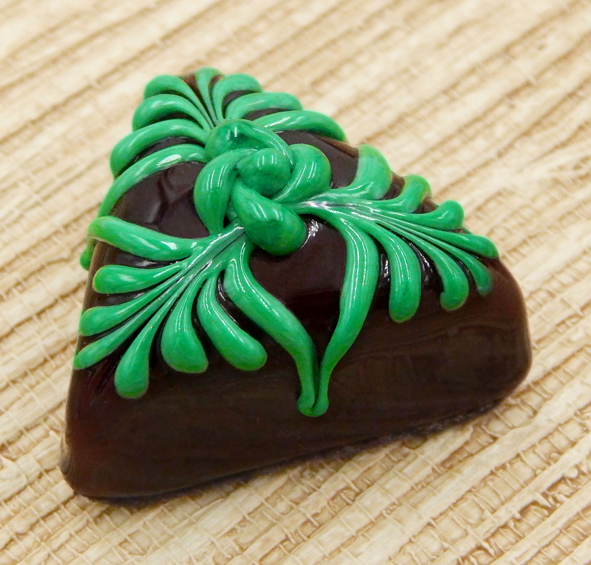 A handmade collectible solid glass chocolate with a creamy wintergreen design on top created from colorful glass utilizing flameworking techniques. Meticulous attention to detail has gone into the construction of each of our pieces to enhance its appeal and collectibility.