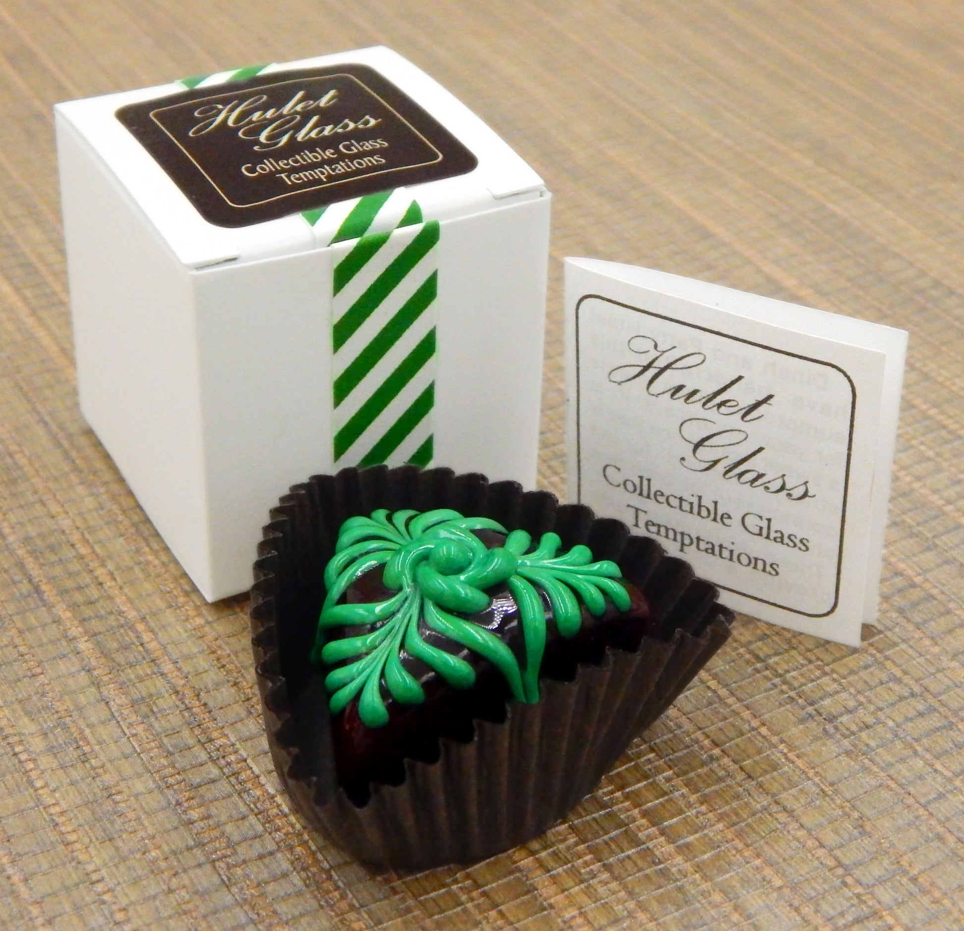 The glass chocolate measures 1.25" x 1" (slightly larger than an actual chocolate candy) and sits in a fluted glassine paper candy cup. The bottom of the chocolate is covered in felt to protect the surface it will sit upon. Each beautiful glass chocolate is signed (Hulet), dated and comes to you in a colorful gift box with an enclosure card telling a bit about the piece.