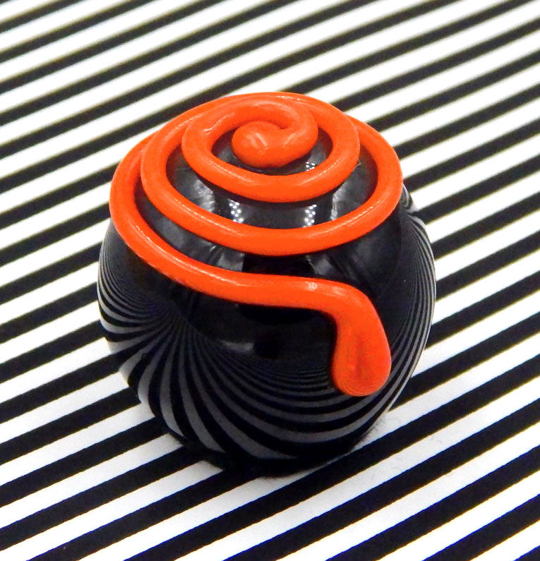 A handmade collectible solid glass chocolate with a Halloween-y orange spiral on a black licorice ball created from colorful glass utilizing flameworking techniques. Meticulous attention to detail has gone into the construction of each of our pieces to enhance its appeal and collectibility.