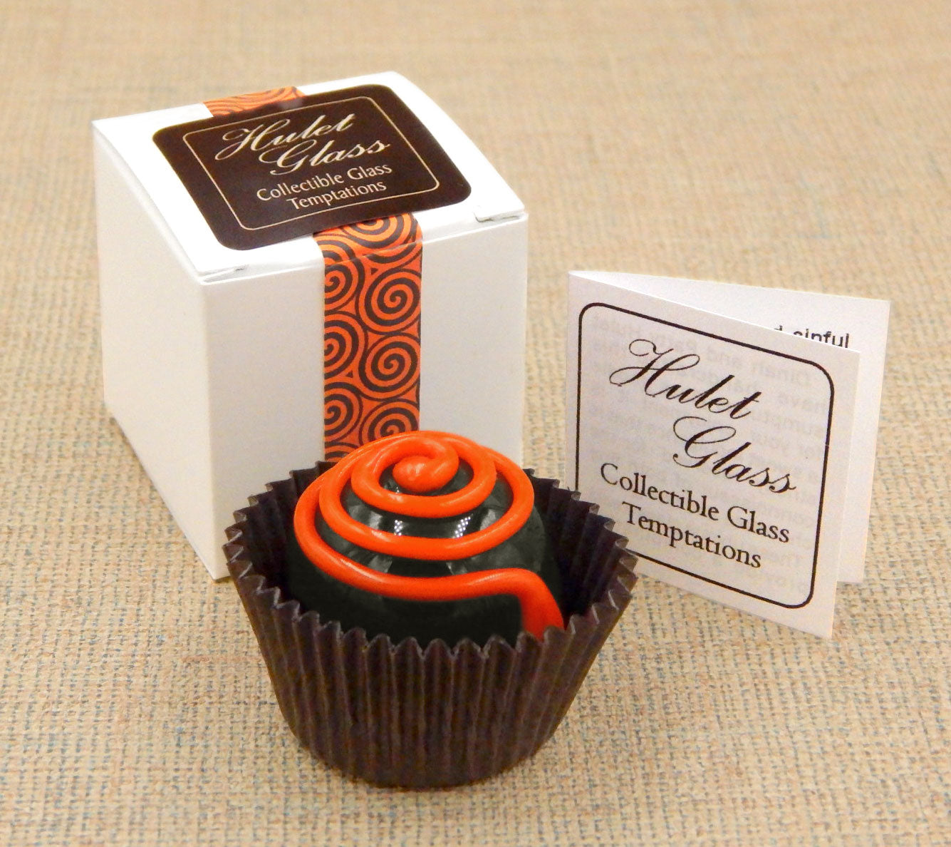 The glass chocolate measures 1.25" x 1.25" (slightly larger than an actual chocolate candy) and sits in a fluted glassine paper candy cup. The bottom of the chocolate is covered in felt to protect the surface it will sit upon. Each beautiful glass chocolate is signed (Hulet), dated and comes to you in a colorful gift box with an enclosure card telling a bit about the piece.