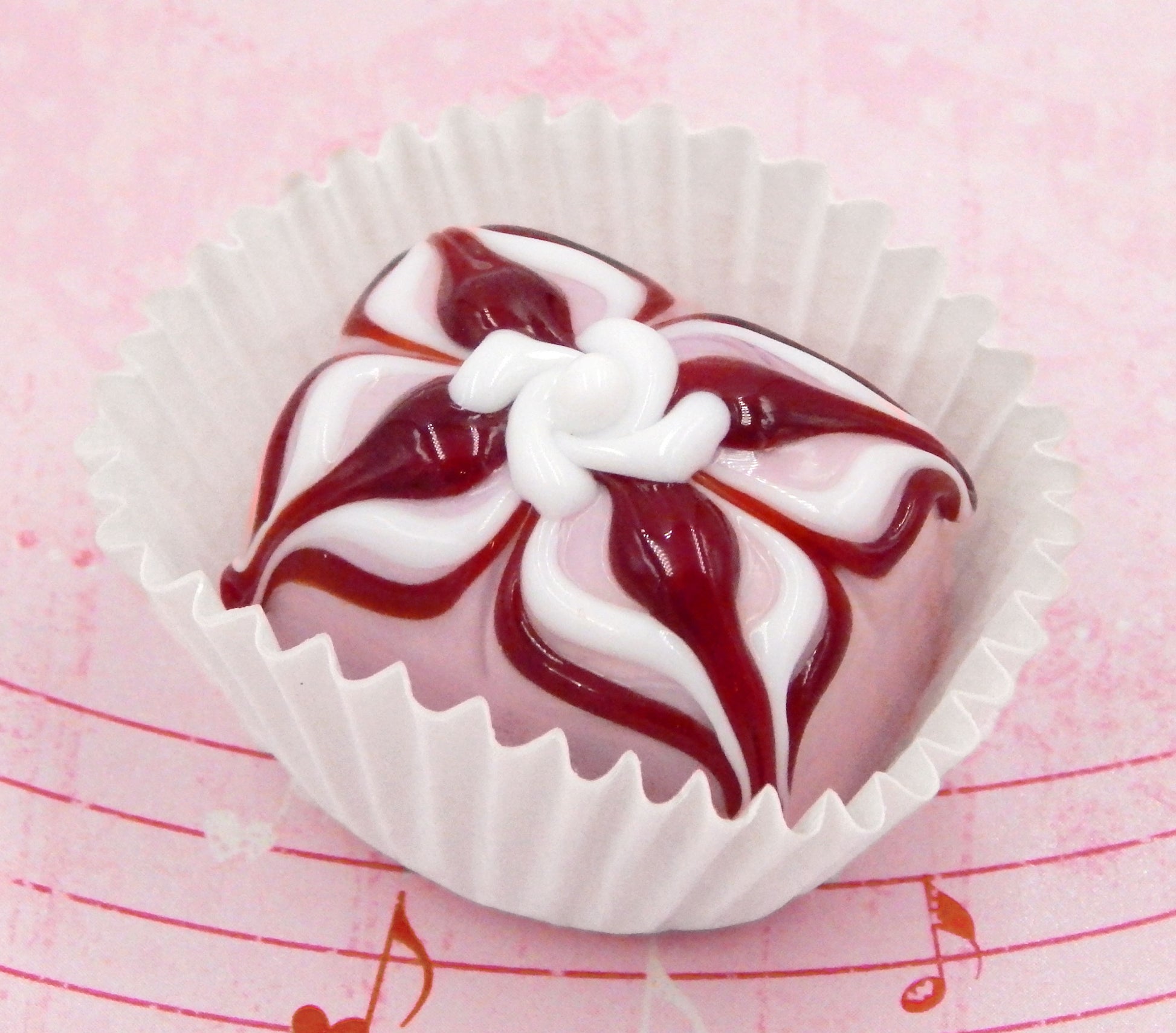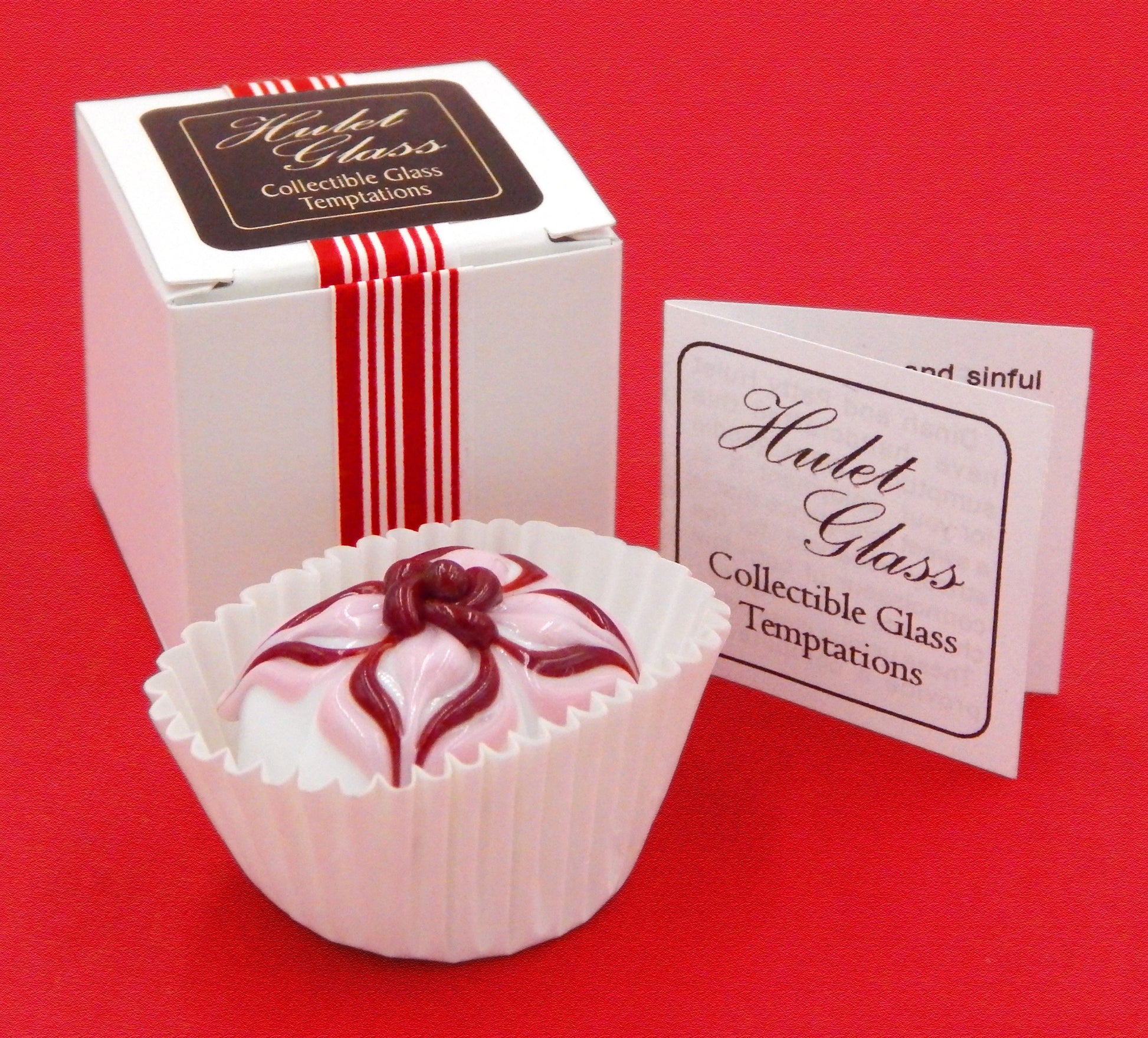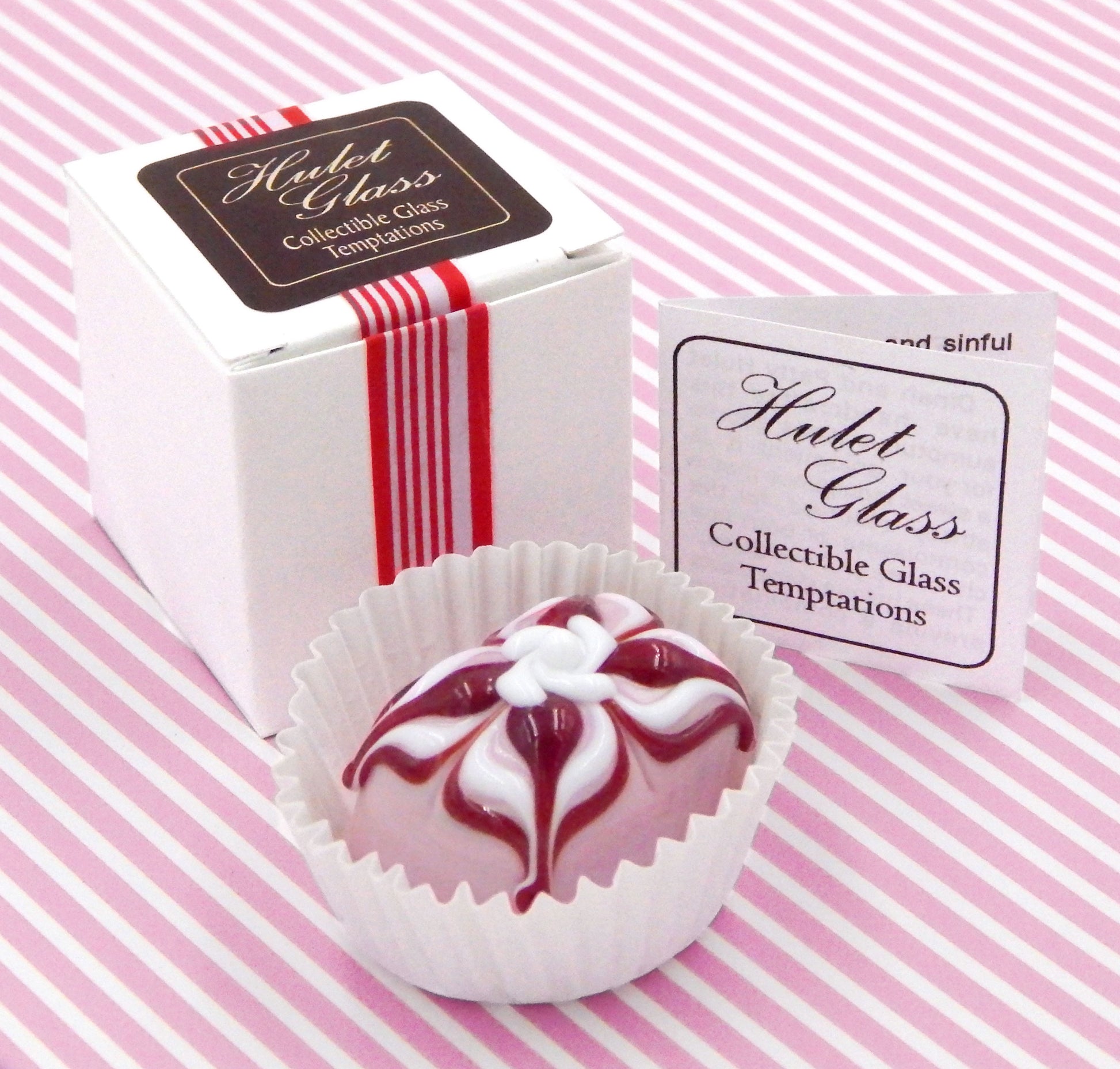 The glass chocolate measures 1.25" x 1" (slightly larger than an actual chocolate candy) and sits in a white fluted glassine paper candy cup. The bottom of the chocolate is covered in felt to protect the surface it will sit upon. Each beautiful glass chocolate is signed (Hulet), dated and comes to you in a colorful gift box with an enclosure card telling a bit about the piece.