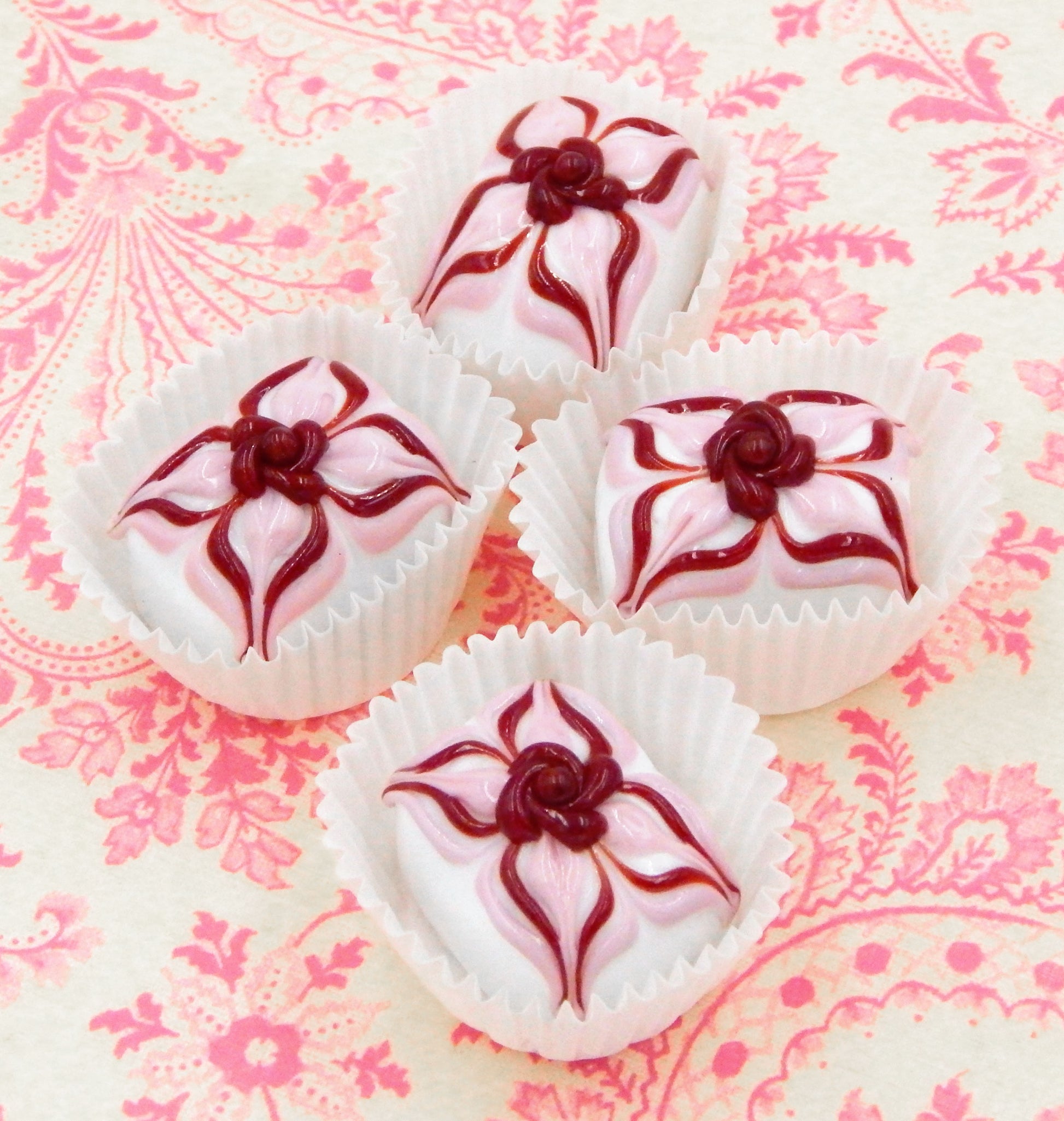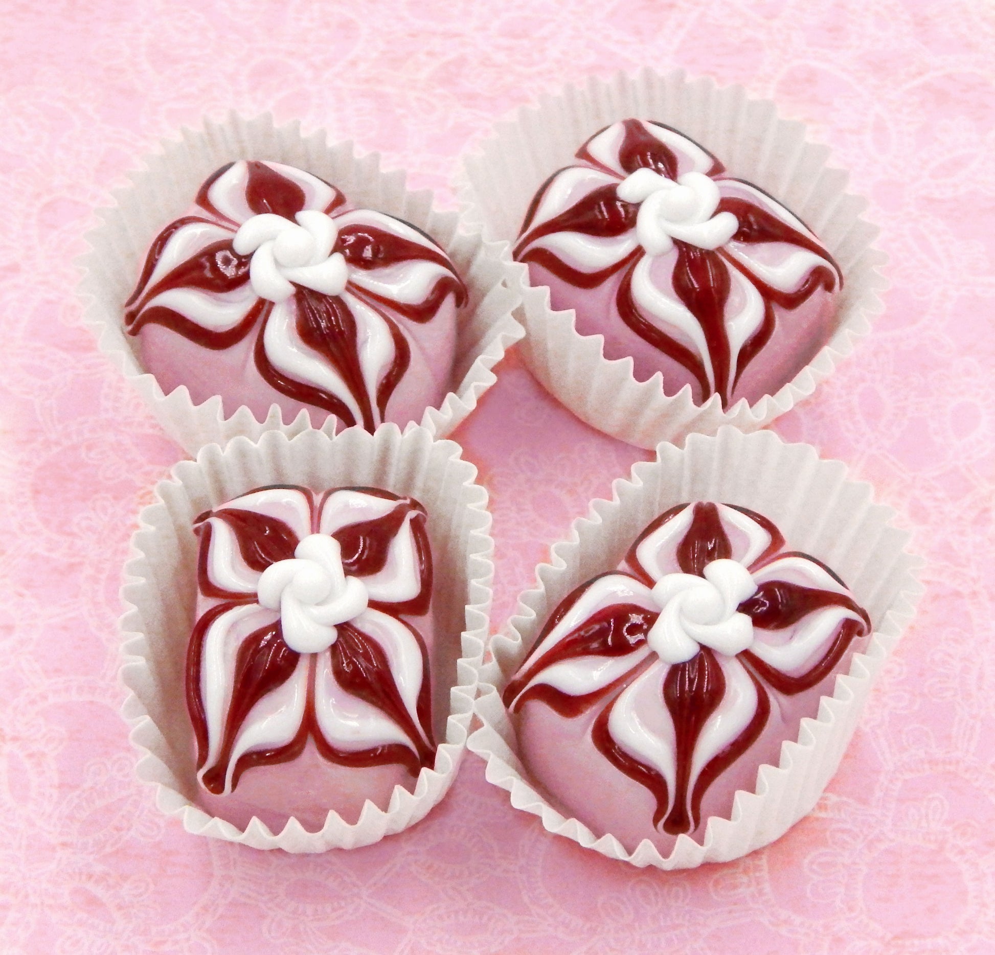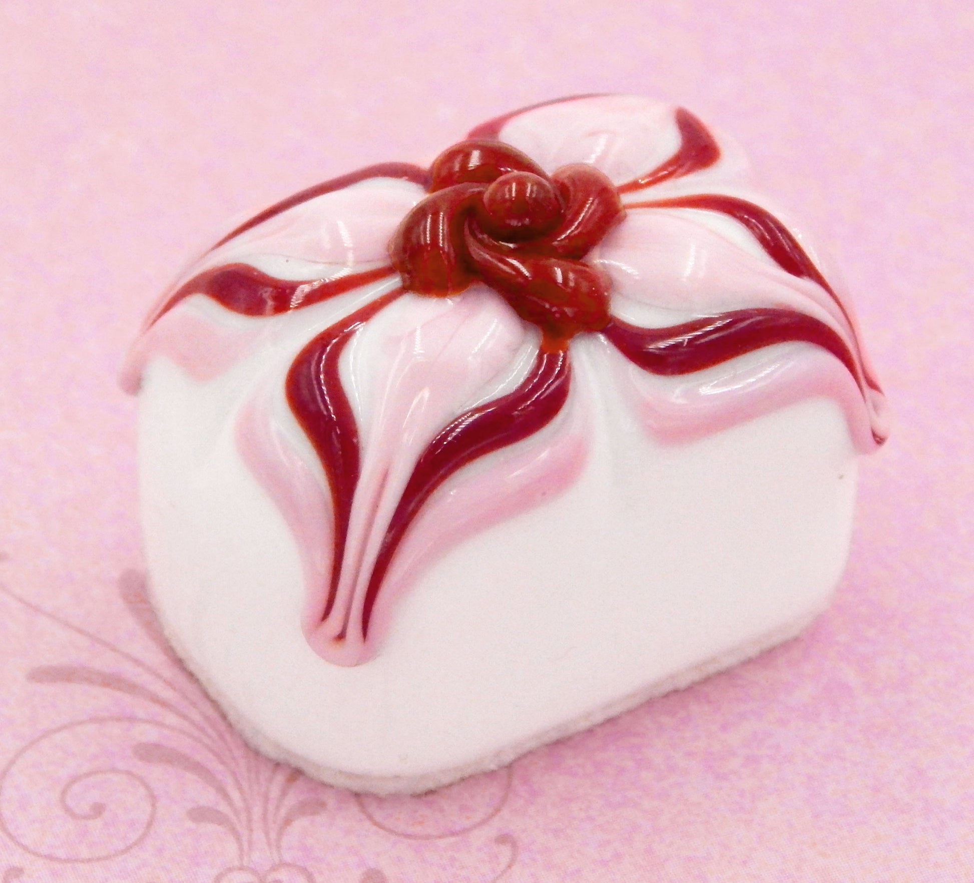 The glass chocolate measures 1.25" x 1" (slightly larger than an actual chocolate candy) and sits in a white fluted glassine paper candy cup. The bottom of the chocolate is covered in felt to protect the surface it will sit upon. Each beautiful glass chocolate is signed (Hulet), dated and comes to you in a colorful gift box with an enclosure card telling a bit about the piece.