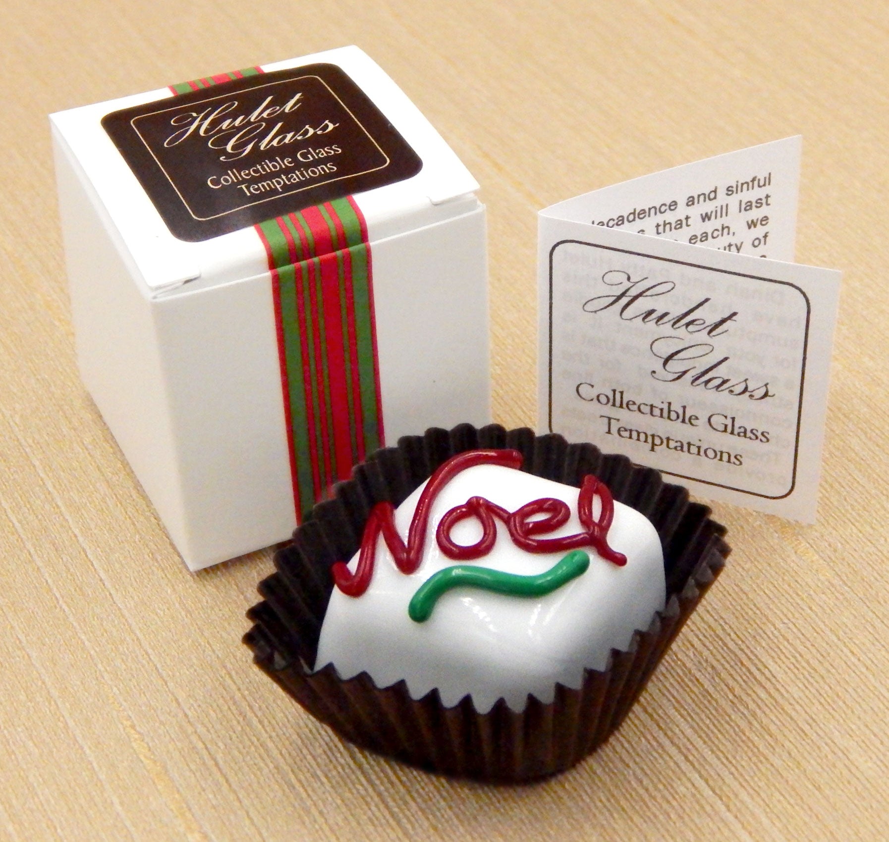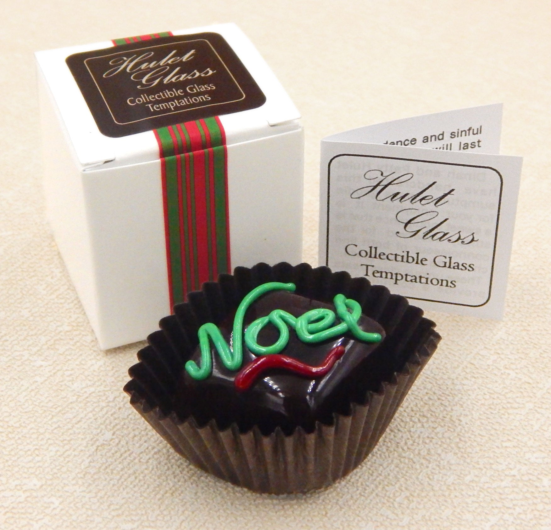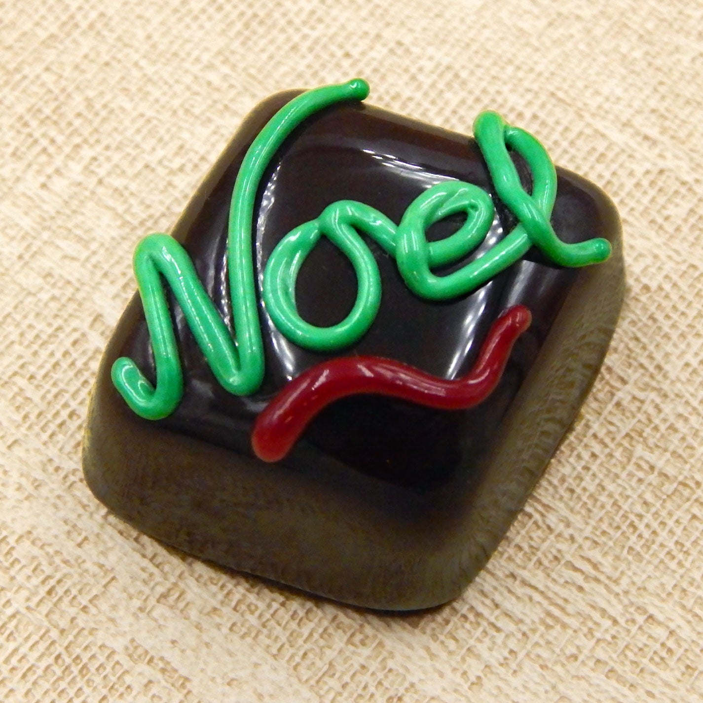 A handmade collectible solid glass chocolate with a creamy Christmas 'Noel" design on top created from colorful glass utilizing ancient lampworking techniques. Meticulous attention to detail has gone into the construction of each of our pieces to enhance its appeal and collectibility.