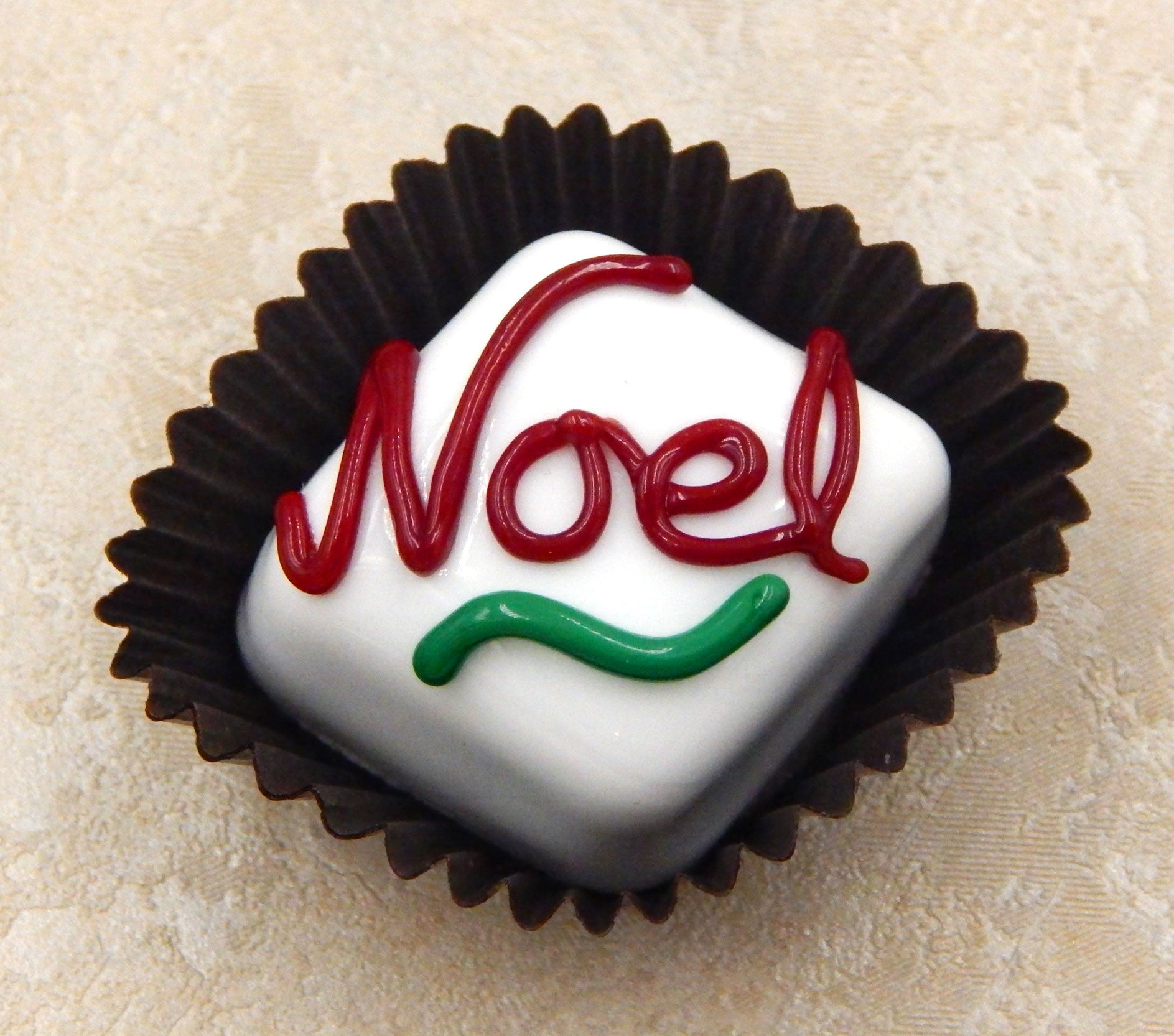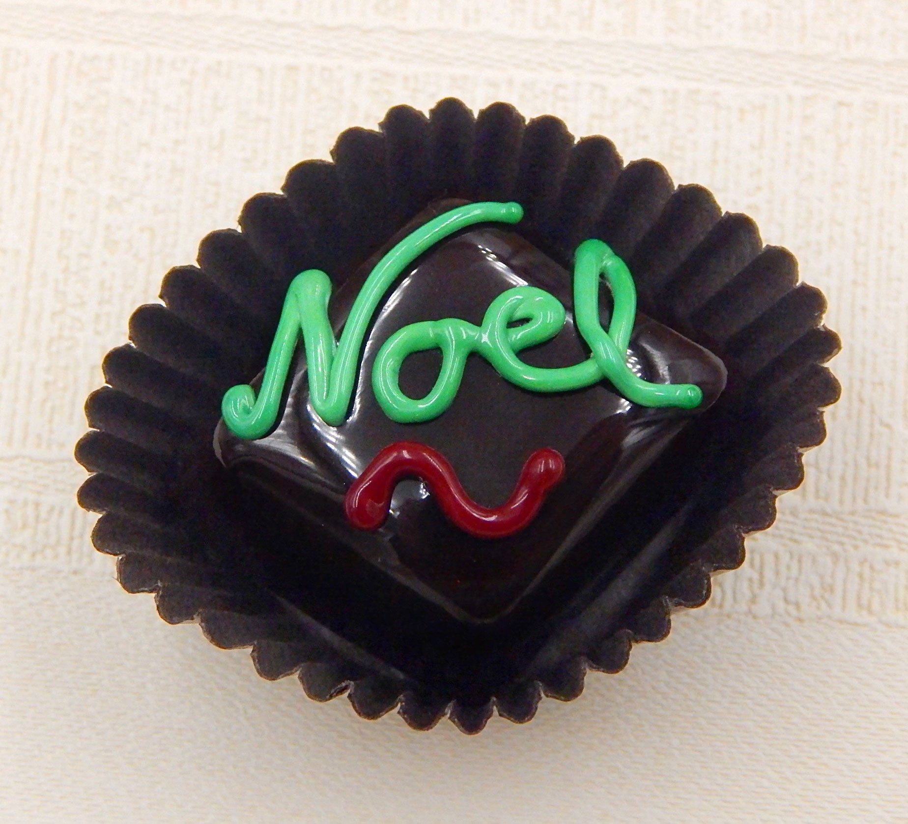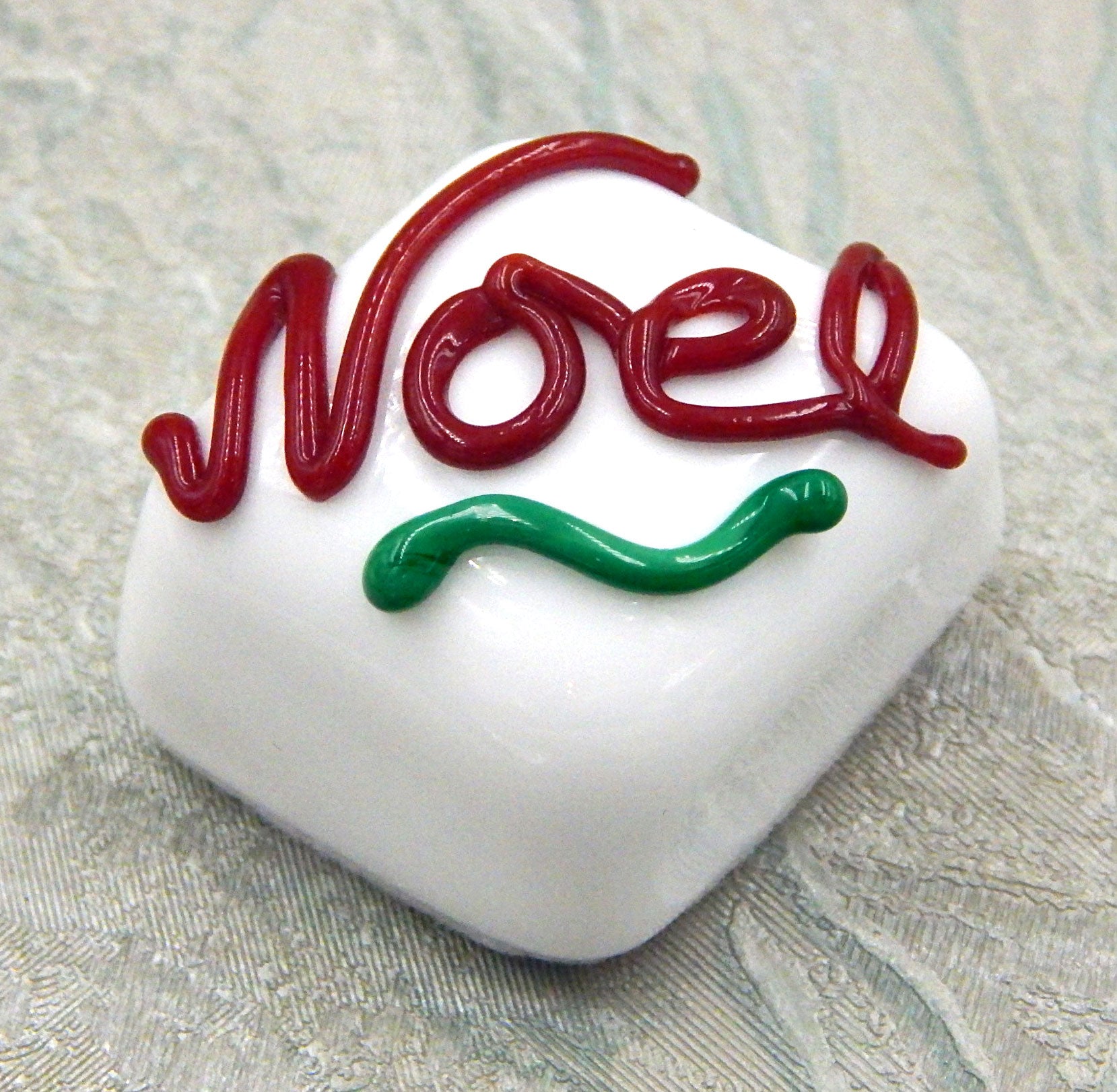 A handmade collectible solid glass chocolate with a creamy Christmas 'Noel" design on top created from colorful glass utilizing ancient lampworking techniques. Meticulous attention to detail has gone into the construction of each of our pieces to enhance its appeal and collectibility.