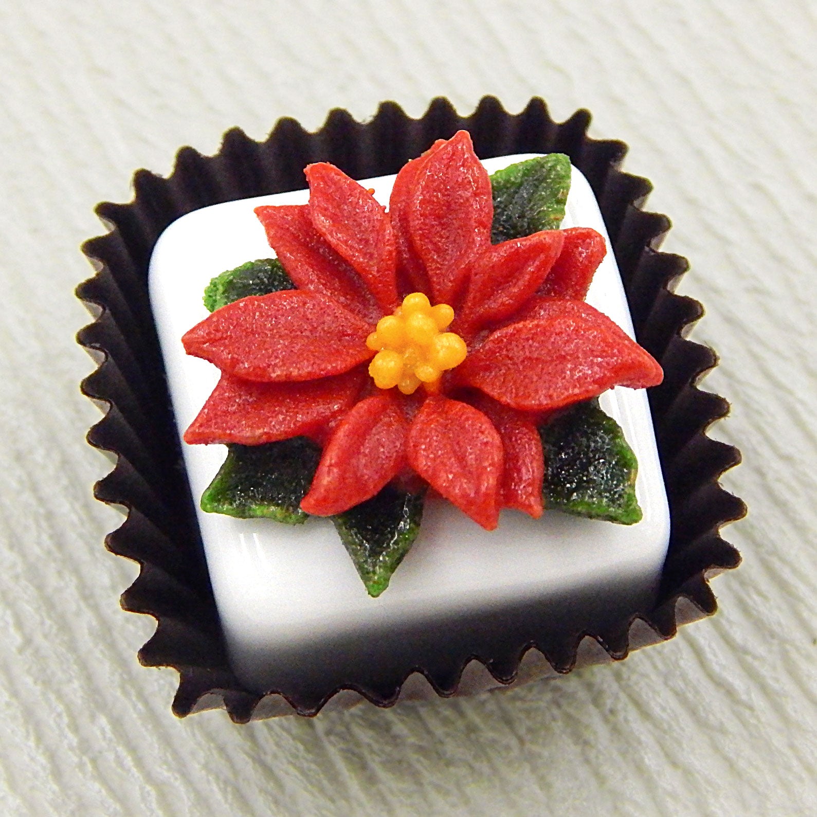 A handmade collectible solid glass white chocolate petit four with a festive holiday poinsettia on top created from colorful glass utilizing ancient pate de verre and lampworking techniques. Meticulous attention to detail has gone into the construction of each of our pieces to enhance its appeal and collectibility.