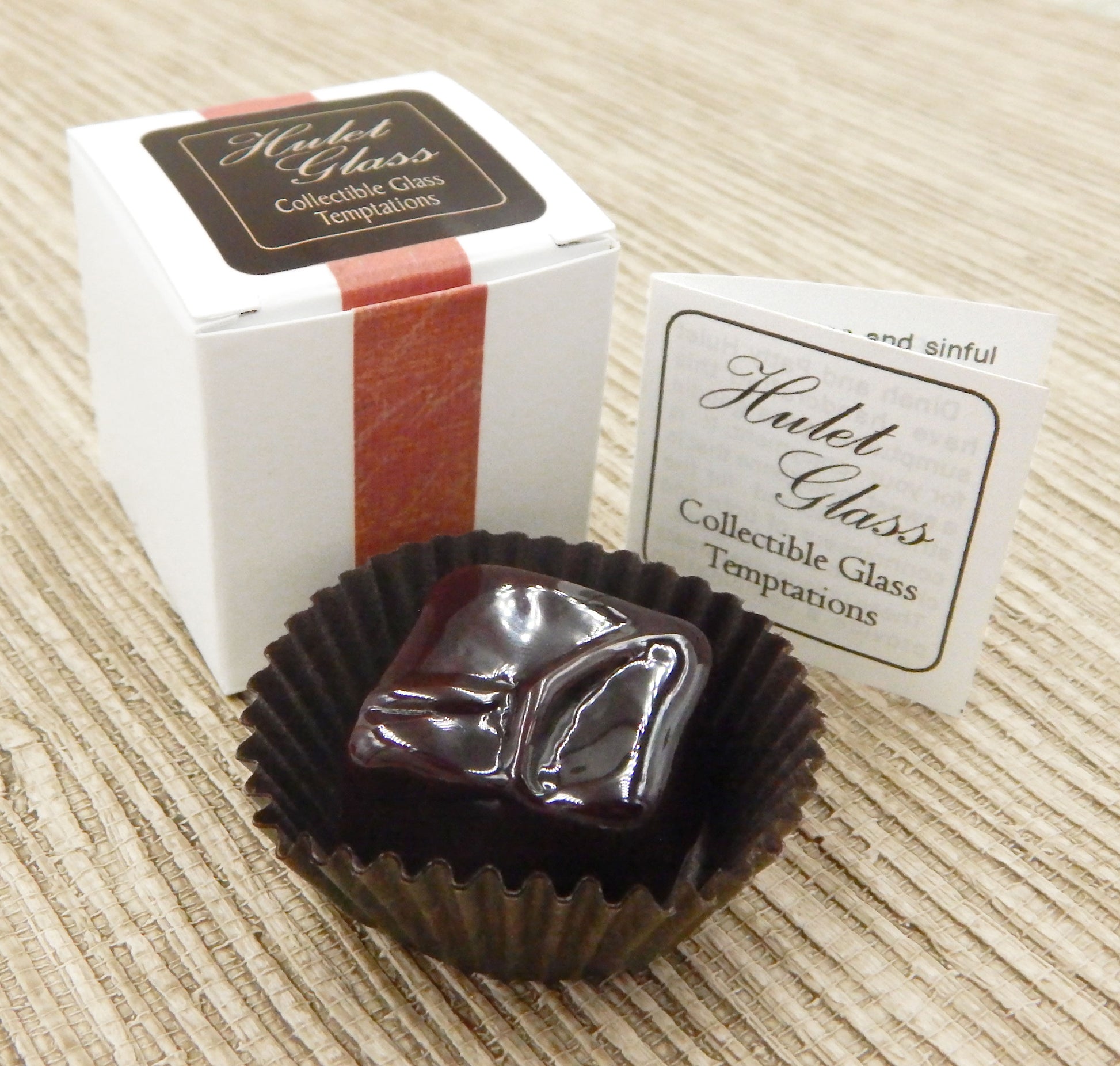 The glass chocolate measures 1.25" x 1.25" x 1" (slightly larger than an actual chocolate candy) and sits in a fluted glassine paper candy cup. The bottom of the chocolate is covered in felt to protect the surface it will sit upon. Each beautiful glass chocolate is signed (Hulet), dated and comes to you in a colorful gift box with an enclosure card telling a bit about the piece.